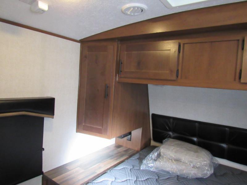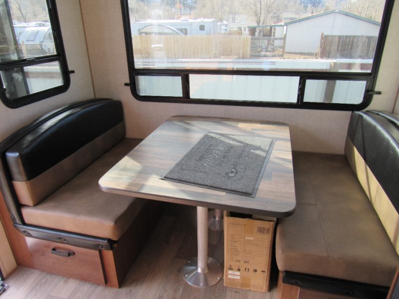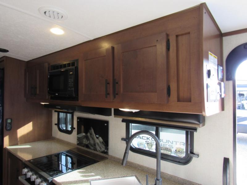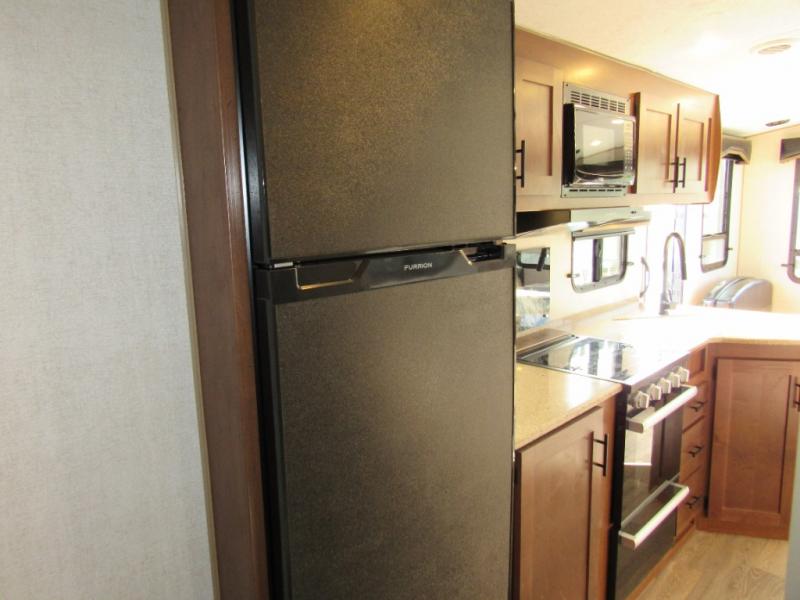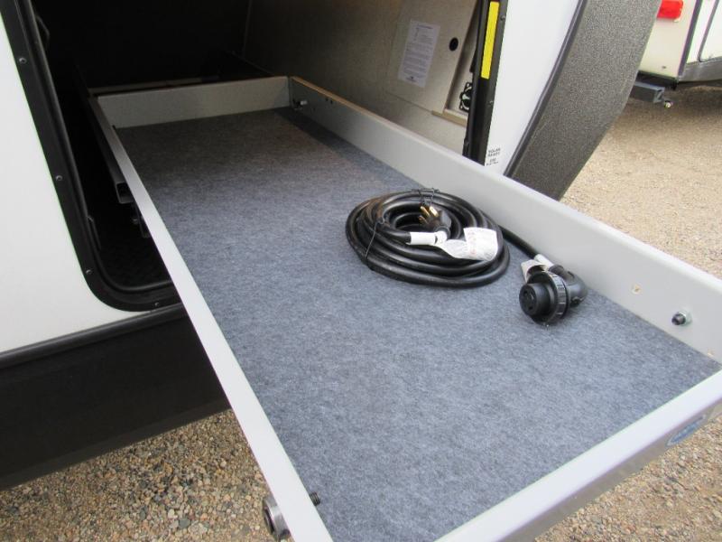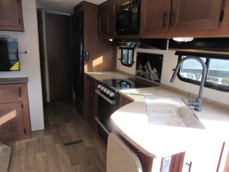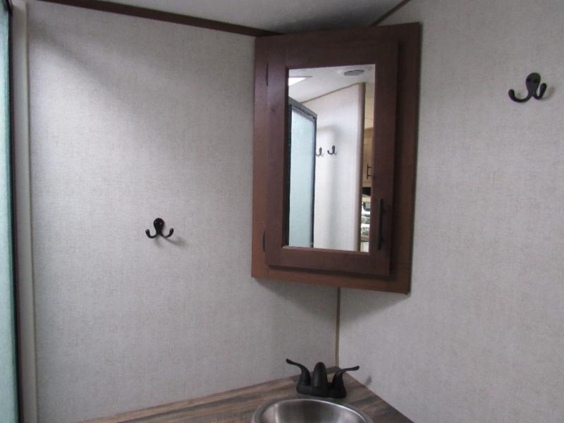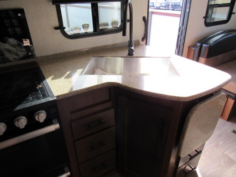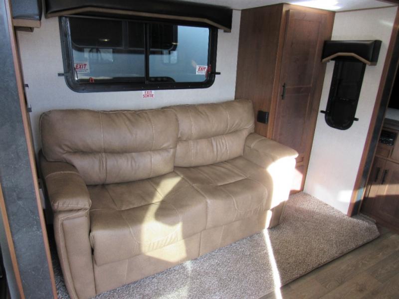 Camping trips are made complete when you have this travel trailer in tow. The rear mountain dinette provides a place to enjoy meals together, and the sleeper sofa slide out is close to the entertainment center for easy viewing of your movies. And if you're not needing the extra sleeping space, you can choose the optional residential sofa with built-in recliners! The chef of your group can prepare home-cooked meals in the kitchen, especially with a flip-up counter for more space. There is also a pantry, sunken range, 10 cu. ft. 12V refrigerator, plus a high-rise pull out faucet for easy clean up. The full bath is towards the front of the unit where you'll find the private bedroom, complete with a queen bed and plenty of storage space for clothes, shoes, and more!