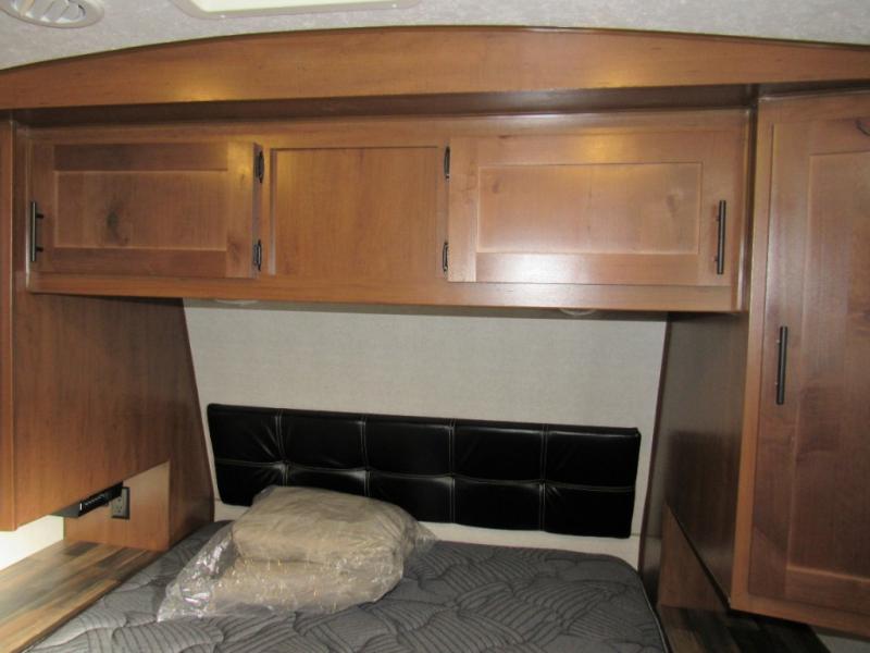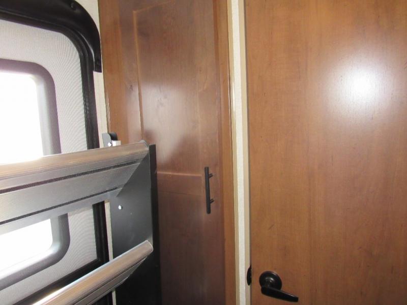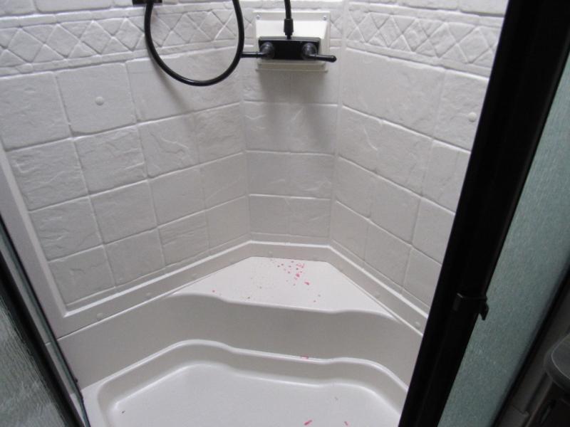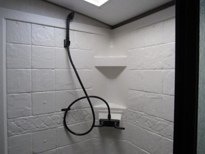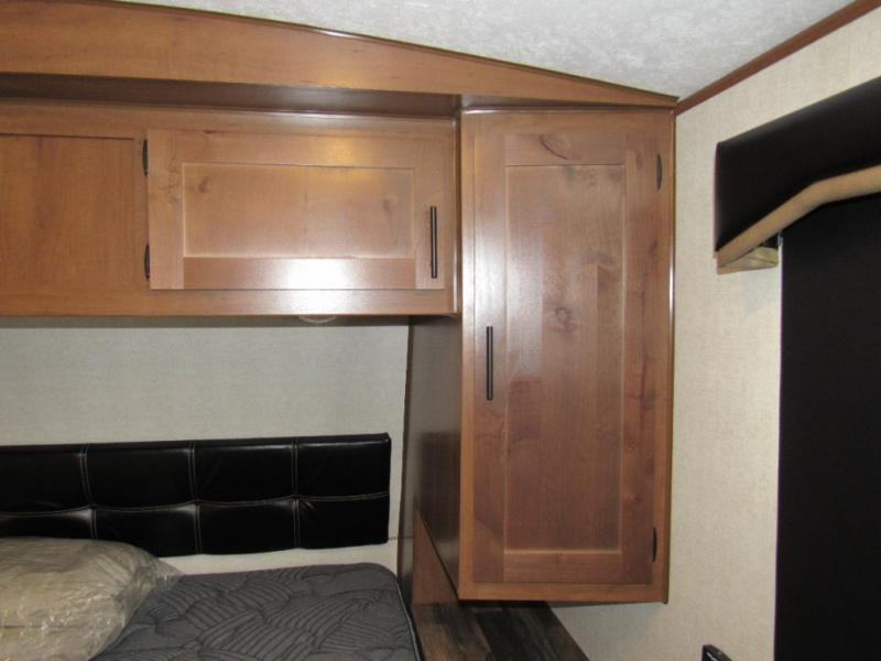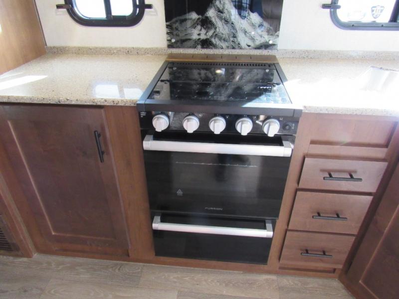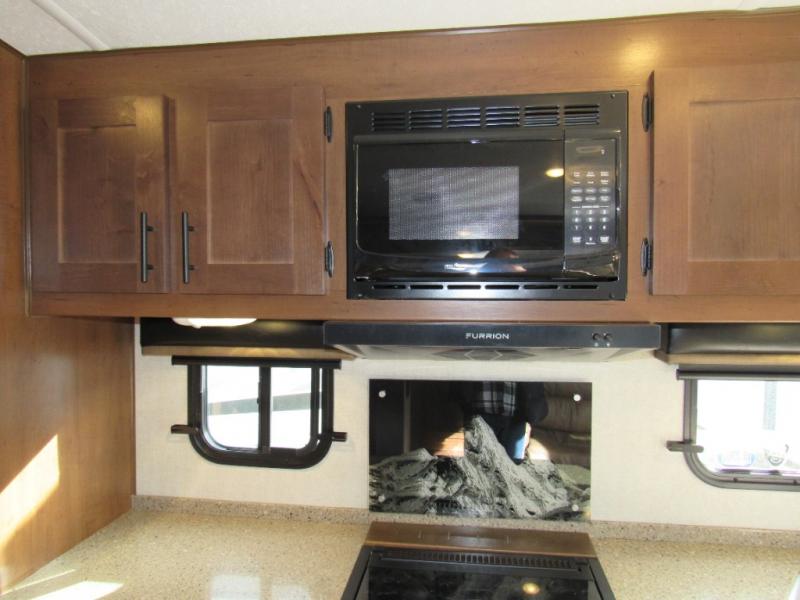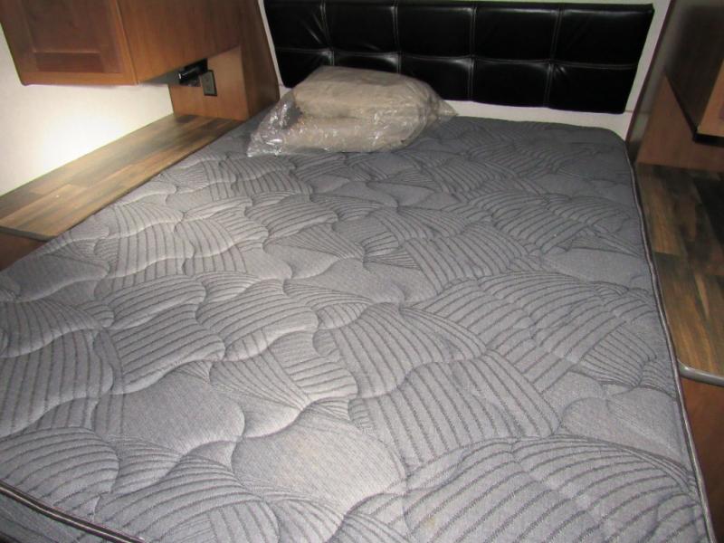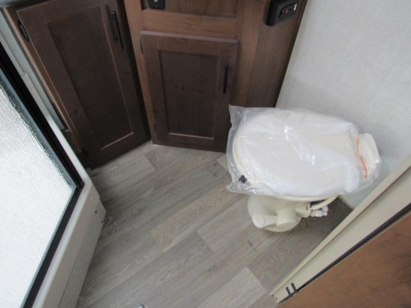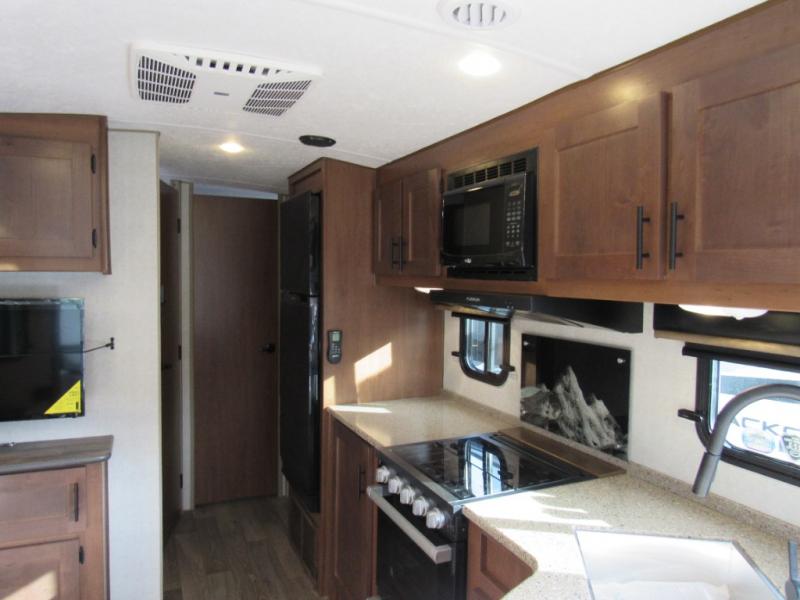 Camping trips are made complete when you have this travel trailer in tow. The rear mountain dinette provides a place to enjoy meals together, and the sleeper sofa slide out is close to the entertainment center for easy viewing of your movies. And if you're not needing the extra sleeping space, you can choose the optional residential sofa with built-in recliners! The chef of your group can prepare home-cooked meals in the kitchen, especially with a flip-up counter for more space. There is also a pantry, sunken range, 10 cu. ft. 12V refrigerator, plus a high-rise pull out faucet for easy clean up. The full bath is towards the front of the unit where you'll find the private bedroom, complete with a queen bed and plenty of storage space for clothes, shoes, and more!