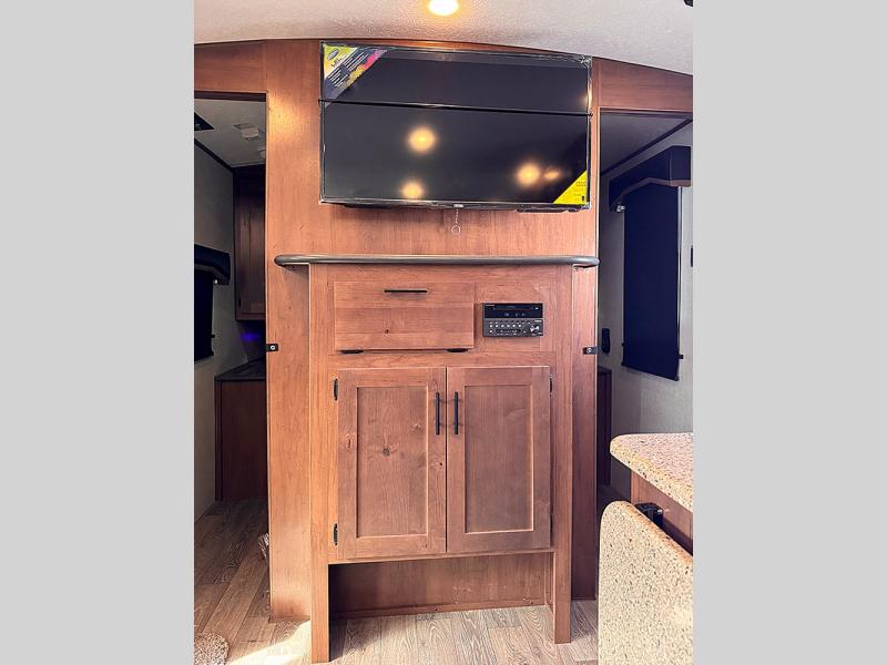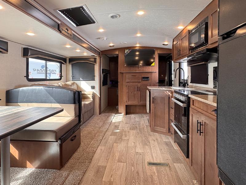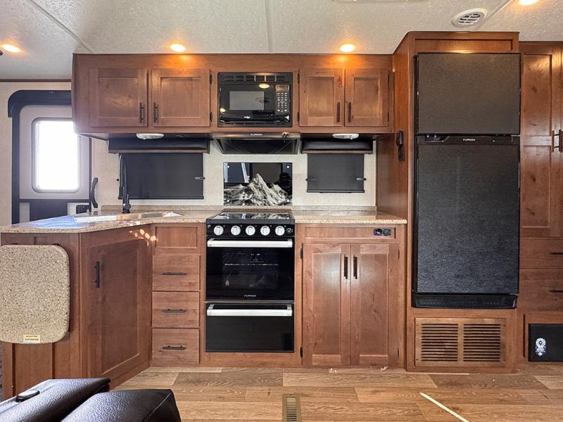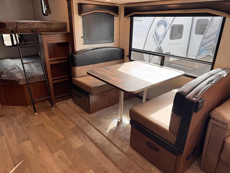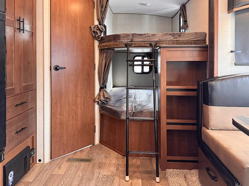 Outdoor enthusiast love this Back Country for many reasons when they camp at local campgrounds, state parks, off-grid and even at friend's ranches. The handy garage storage door allows you to place items from the exterior into the interior for safe travels under the bunks. The double-size bunks and ladder allow four to sleep each night, the mountain dinette and sleeper sofa offer three to four more spaces, and the owners will enjoy their own queen bed in the front private bedroom. The kitchen offers full amenities, the swing-out 40" TV offers inside entertainment, and the full bathroom will keep everyone clean after a fun day outdoors. There is more, step inside to see it all!