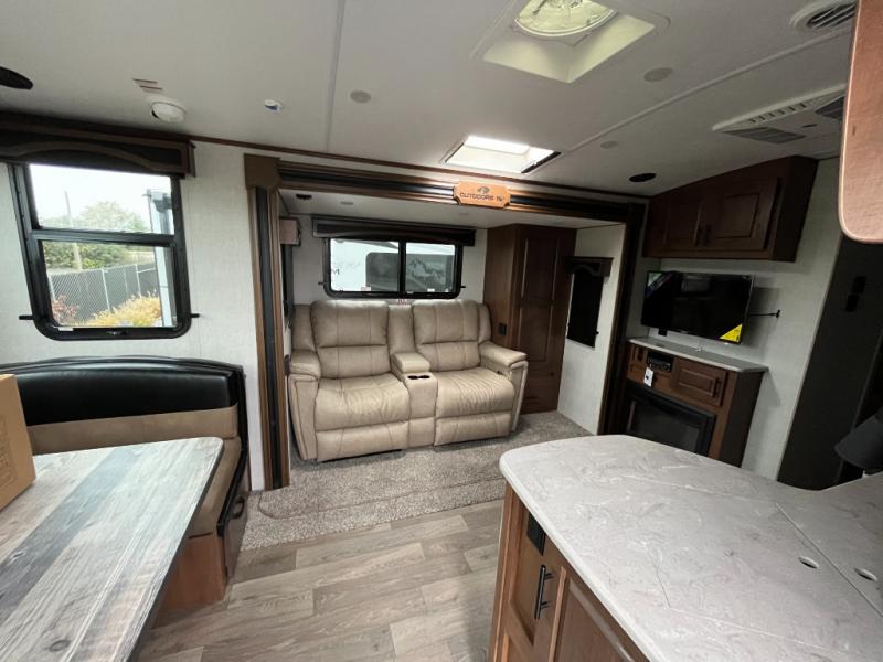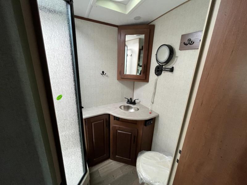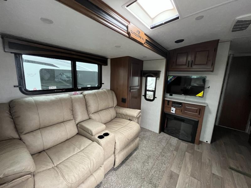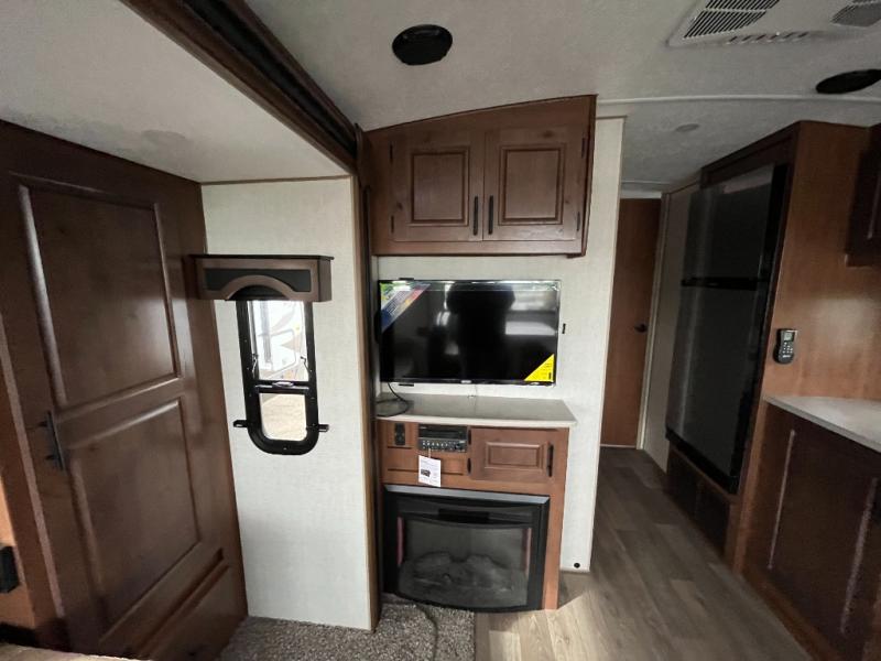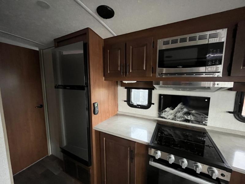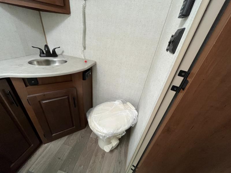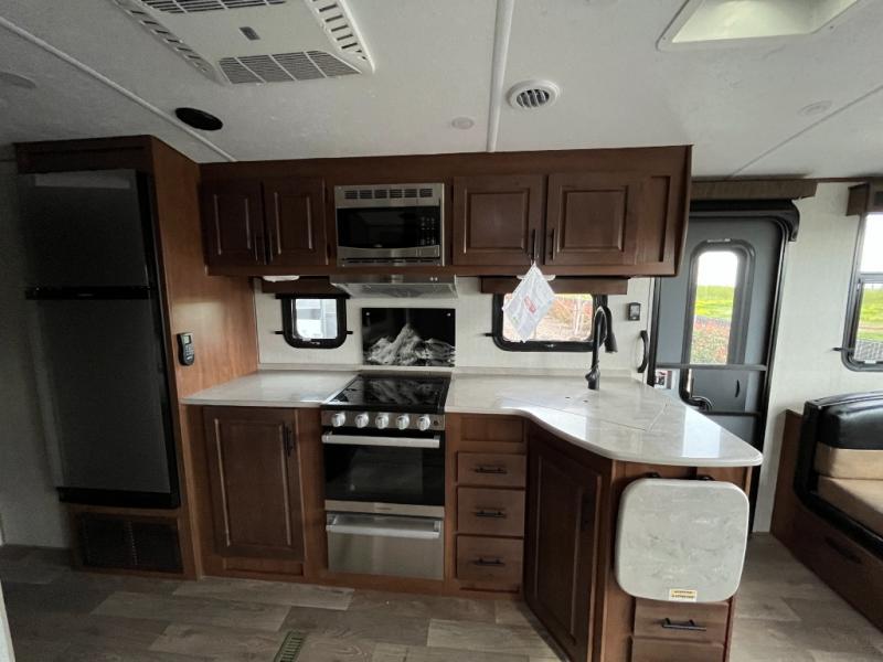 Camping trips are made complete when you have this travel trailer in tow. The rear mountain dinette provides a place to enjoy meals together, and the sleeper sofa slide out is close to the entertainment center for easy viewing of your movies. And if you're not needing the extra sleeping space, you can choose the optional residential sofa with built-in recliners! The chef of your group can prepare home-cooked meals in the kitchen, especially with a flip-up counter for more space. There is also a pantry, sunken range, 10 cu. ft. 12V refrigerator, plus a high-rise pull out faucet for easy clean up. The full bath is towards the front of the unit where you'll find the private bedroom, complete with a queen bed and plenty of storage space for clothes, shoes, and more!