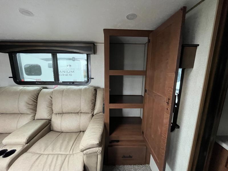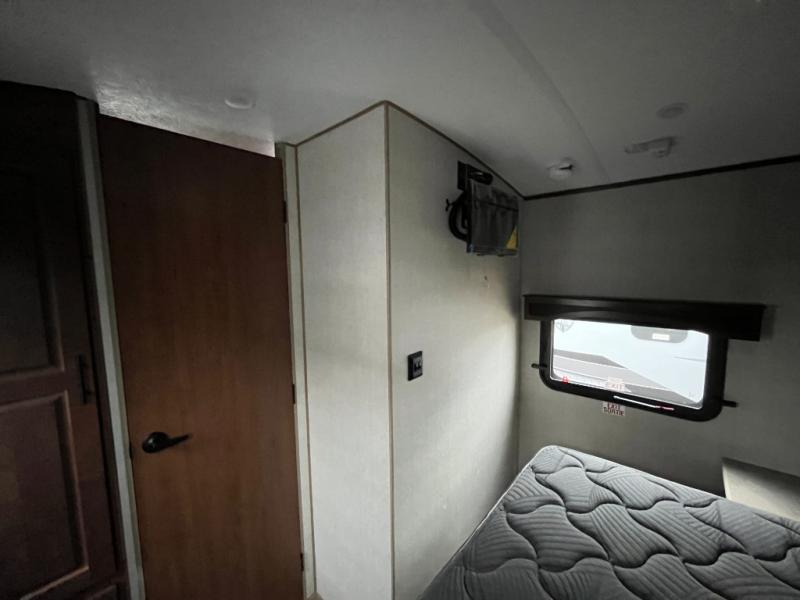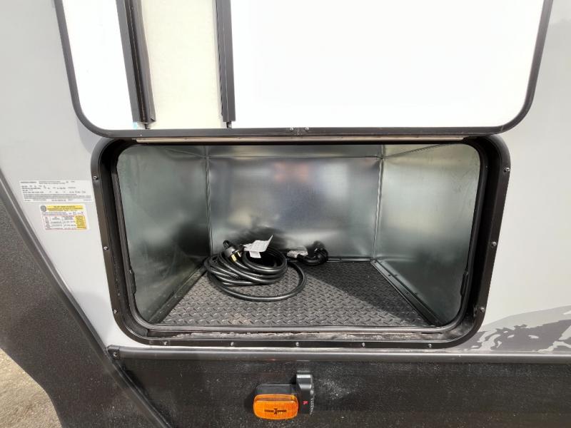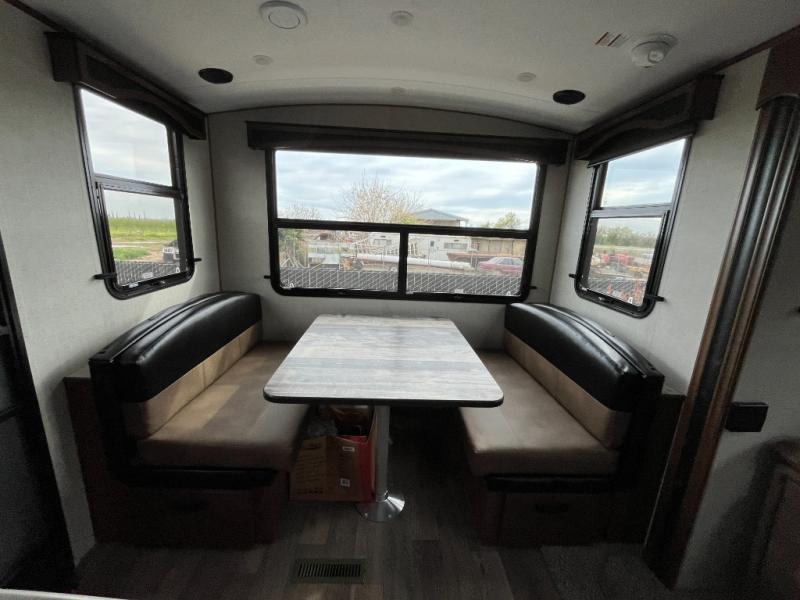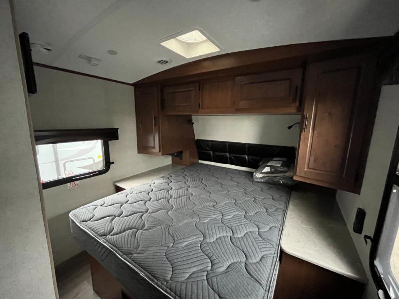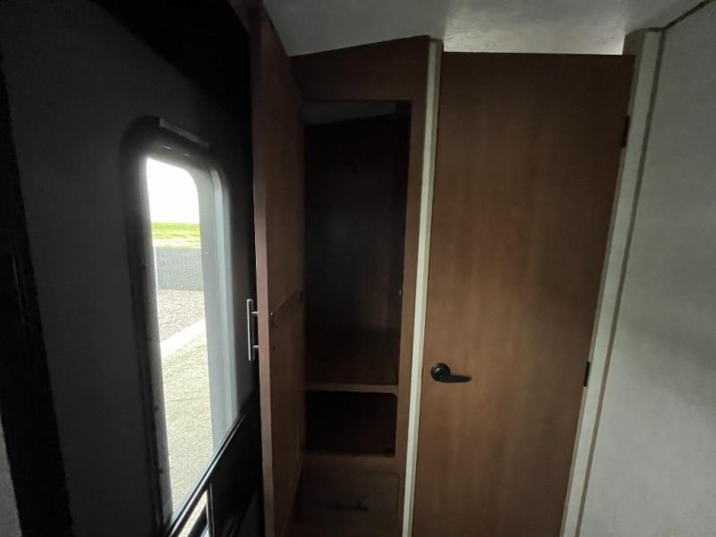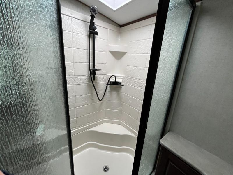 Camping trips are made complete when you have this travel trailer in tow. The rear mountain dinette provides a place to enjoy meals together, and the sleeper sofa slide out is close to the entertainment center for easy viewing of your movies. And if you're not needing the extra sleeping space, you can choose the optional residential sofa with built-in recliners! The chef of your group can prepare home-cooked meals in the kitchen, especially with a flip-up counter for more space. There is also a pantry, sunken range, 10 cu. ft. 12V refrigerator, plus a high-rise pull out faucet for easy clean up. The full bath is towards the front of the unit where you'll find the private bedroom, complete with a queen bed and plenty of storage space for clothes, shoes, and more!