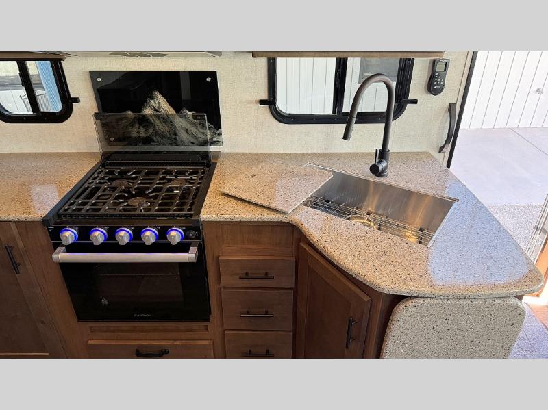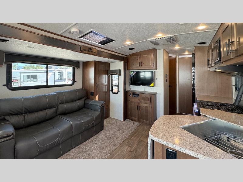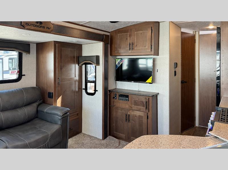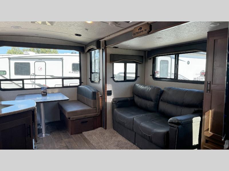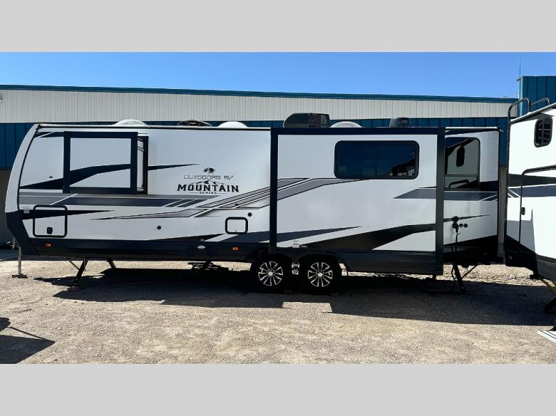 With any Black Stone Mountain Series travel trailer by Outdoors RV you will enjoy climate designed four seasons camping thanks to the thermal pane windows and the fully enclosed, heated, and insulated underbelly. The custom built chassis and rugged integrated A-frame are built for strength and durability, along with the rugged 2" bonded aluminum frame walls. Each model includes LG solid surface countertops, granite designed backsplash, vaulted radius ceilings, and a mountain comfort premium mattress for all-around comfort. You will also love the XL panoramic slide out windows and the dual pane living room skylight with a shade to let natural light in!