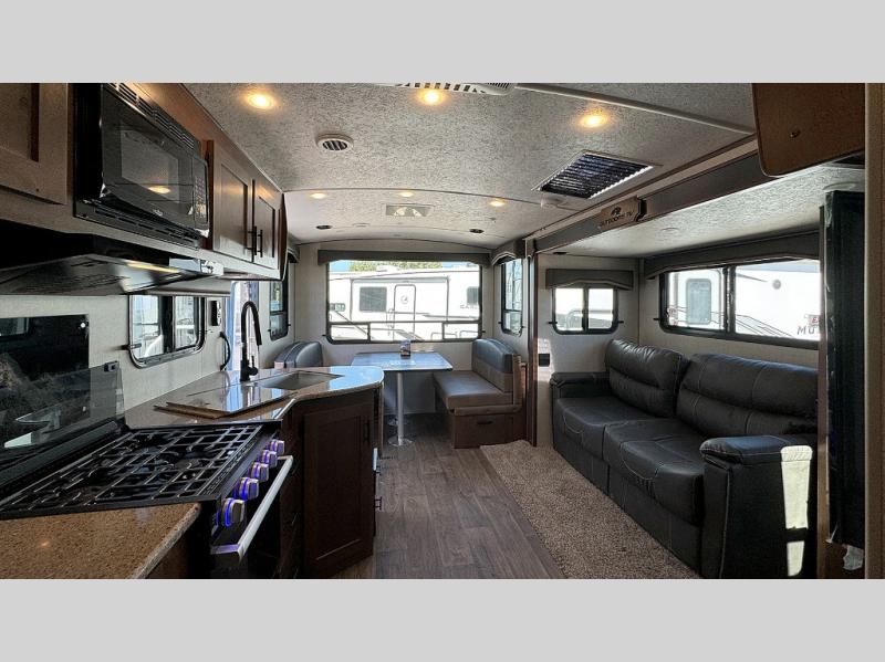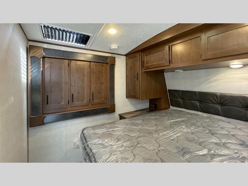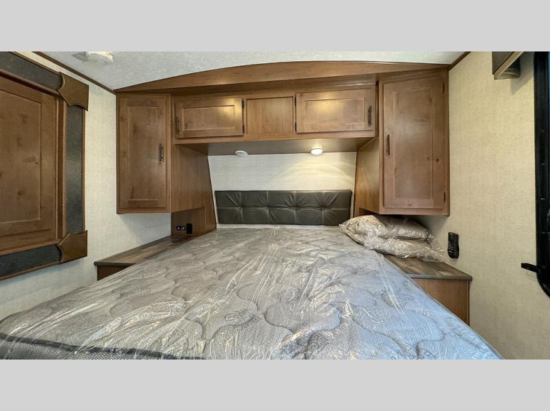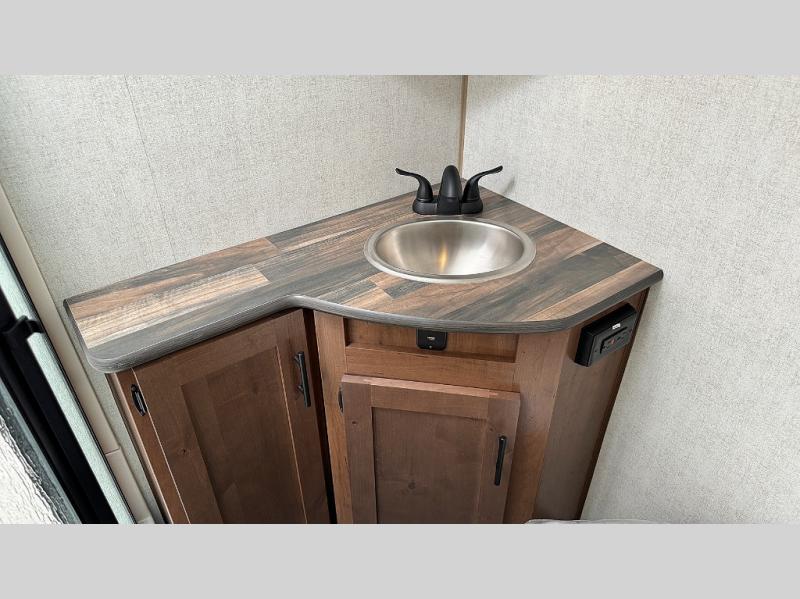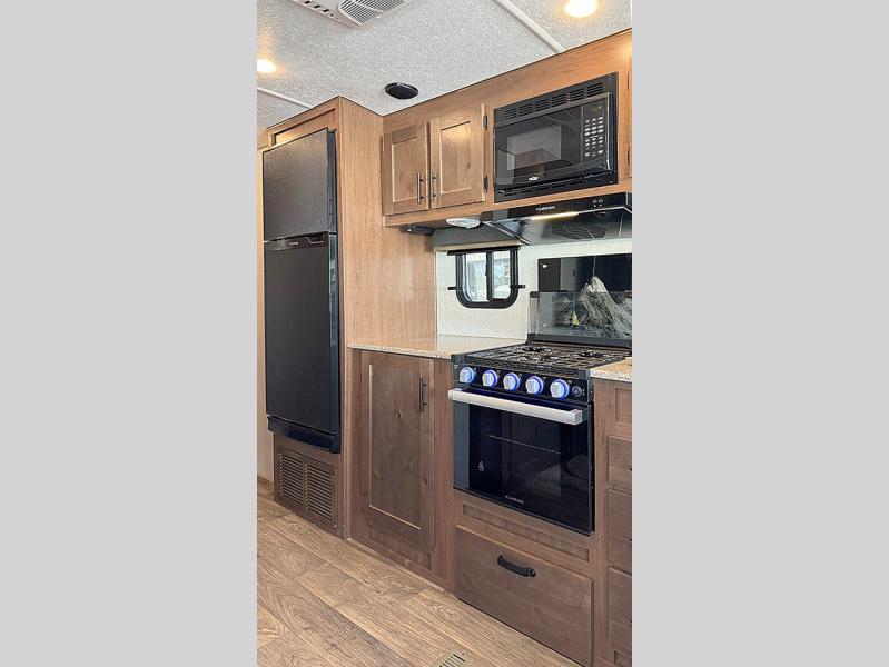 This dual entry travel trailer will be perfect for your trips to the mountains. The rear mountain dinette includes a large window for outdoor views, and you'll find additional seating space on the sleeper sofa. The chef of your group can work up their magic in the full kitchen that includes a sunken range and a flip-up counter for more counter space. Within the front private bedroom you'll find a queen bed, wardrobes on either side of the bed, plus a wardrobe slide for more space and storage.