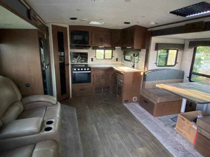 Enjoy added space in this travel trailer with dual opposing slides in the main living area. Your crew can visit on the residential sofa with built-in recliners or play a game at the mountain dinette while the chef whips up dinner in the rear kitchen. A spacious dual entry bath will allow you to clean up after your adventures, and a front master bedroom will have you feeling right at home. This model also includes a swing-out 40" TV in the main living area so rainy days can be spent watching movies!