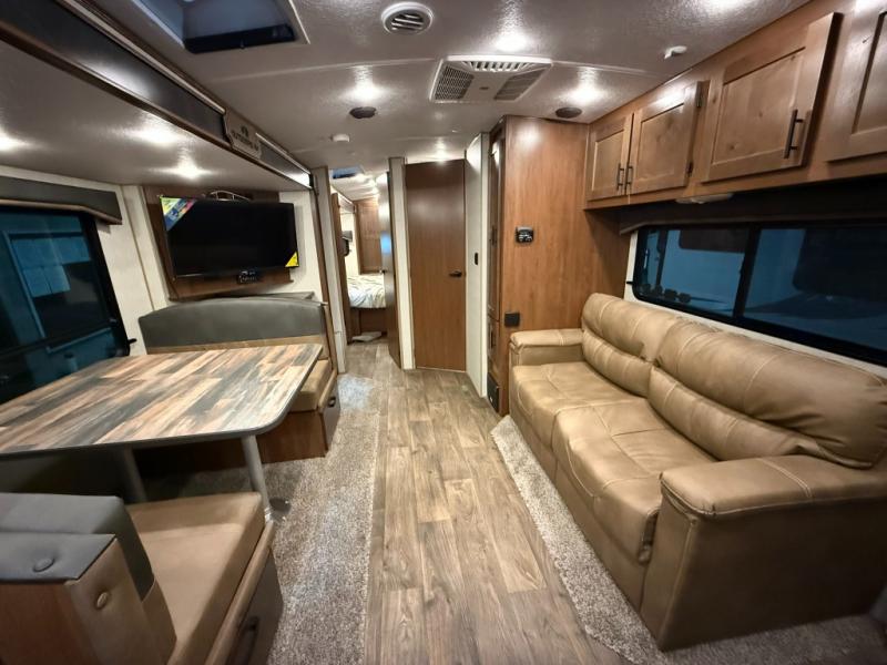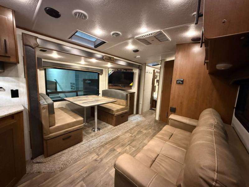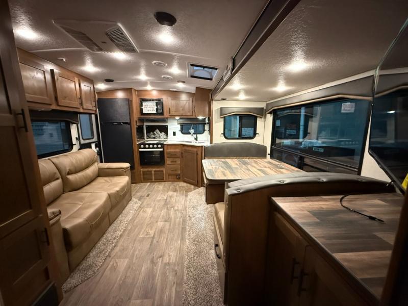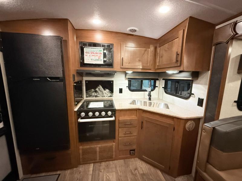 This rear kitchen travel trailer is made spacious thanks to the mountain dinette slide out in the main living area and the queen bed slide out in the front bedroom. You will also find a bench hamper and front wardrobe in the bedroom, along with your own exterior entry door. A sleeper sofa provides more sleeping space in the middle living room and the 40" TV will let you enjoy movie nights. And don't overlook the rear kitchen with plenty of counter space, a farm sink, and a sunken range with a glass front.