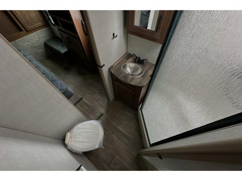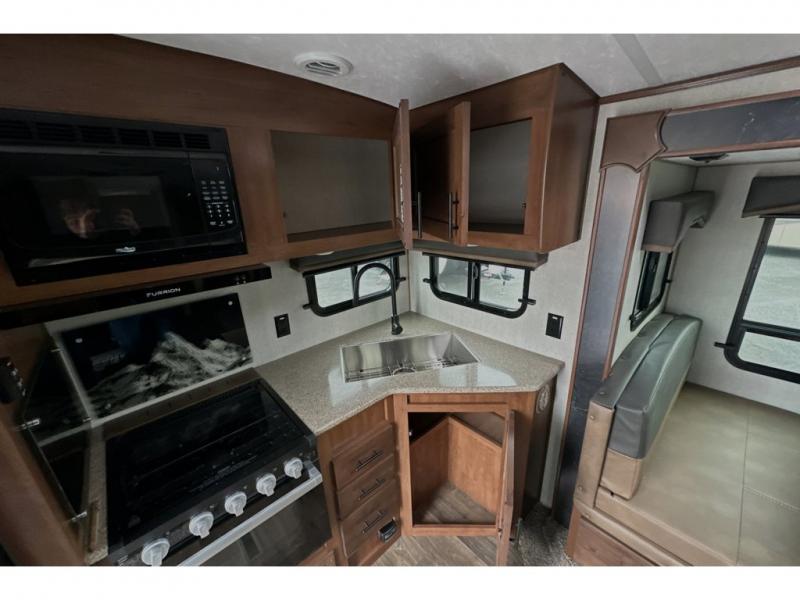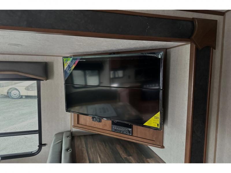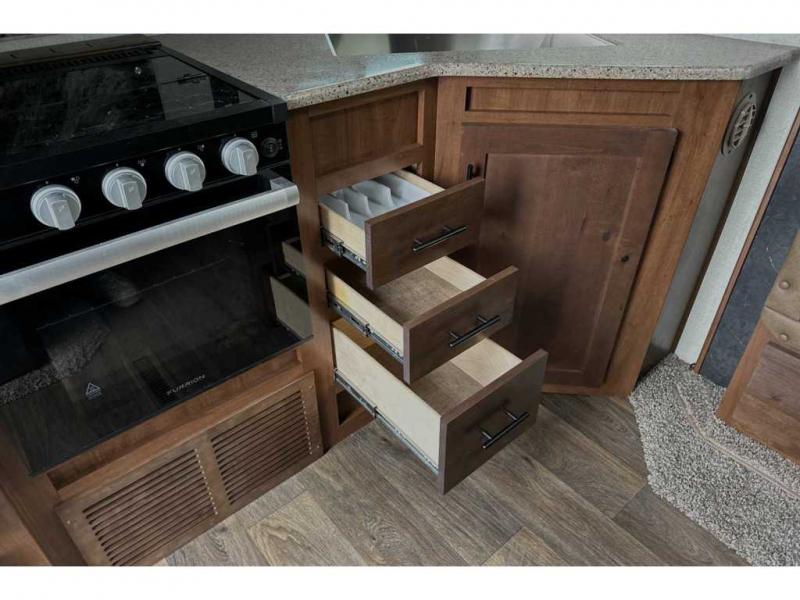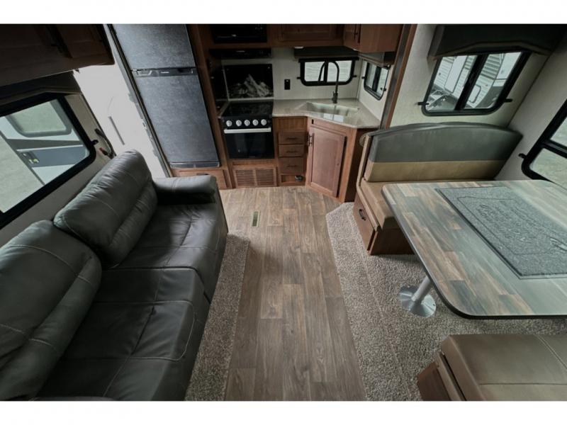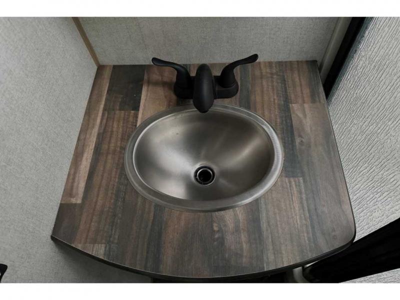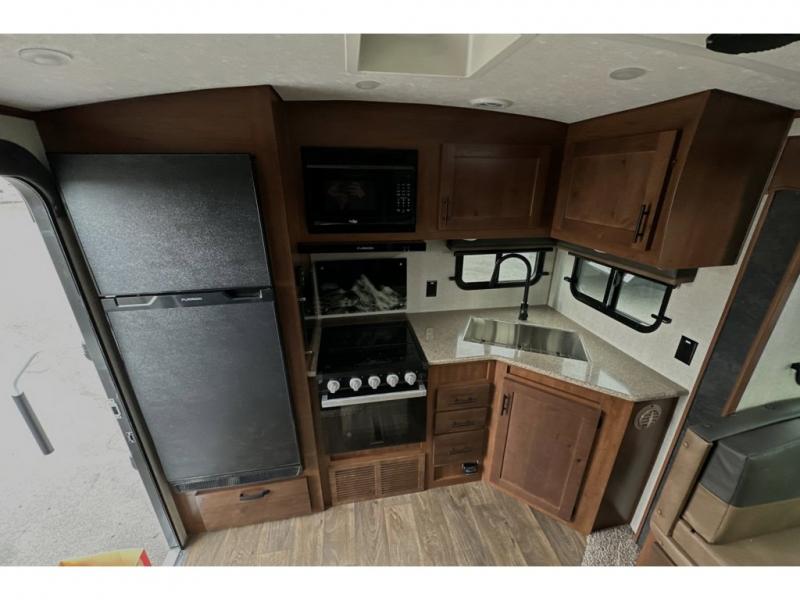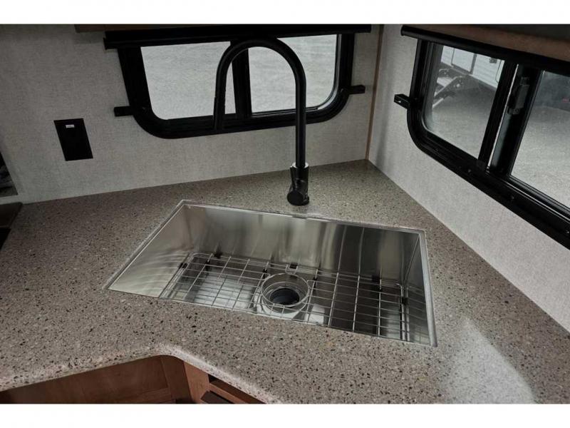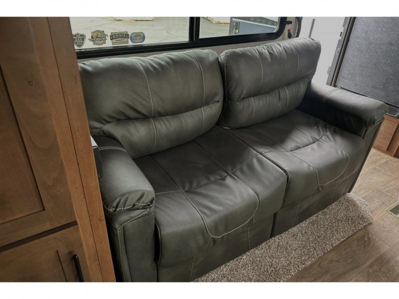 This rear kitchen travel trailer is made spacious thanks to the mountain dinette slide out in the main living area and the queen bed slide out in the front bedroom. You will also find a bench hamper and front wardrobe in the bedroom, along with your own exterior entry door. A sleeper sofa provides more sleeping space in the middle living room and the 40" TV will let you enjoy movie nights. And don't overlook the rear kitchen with plenty of counter space, a farm sink, and a sunken range with a glass front.