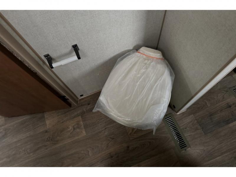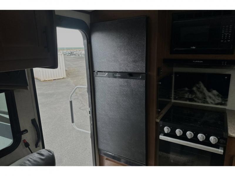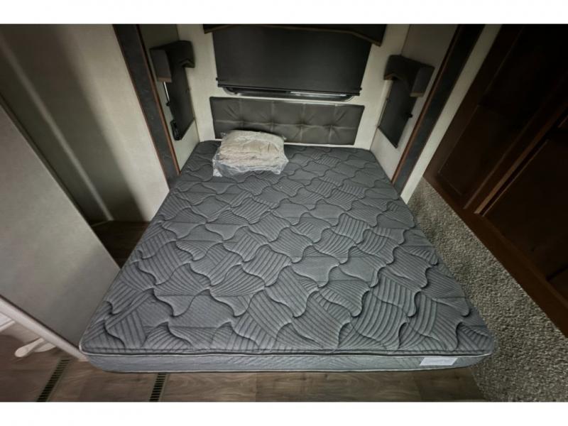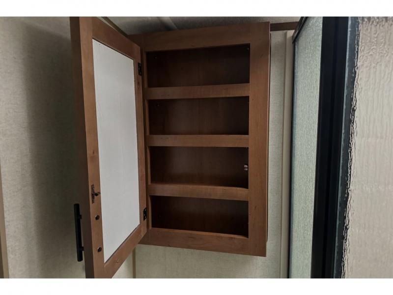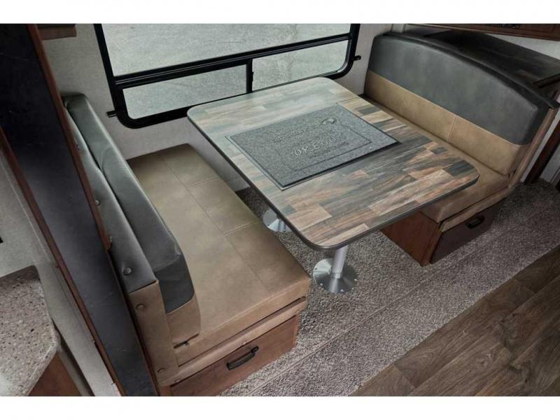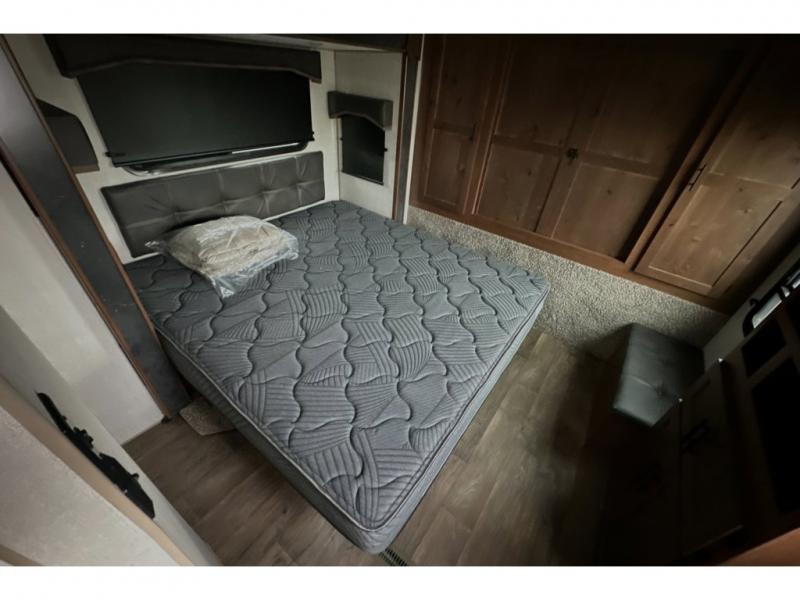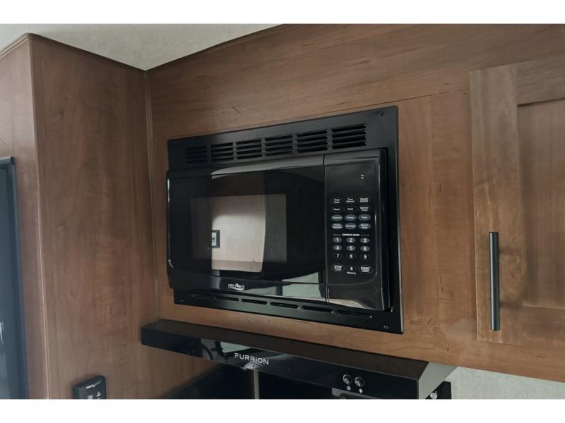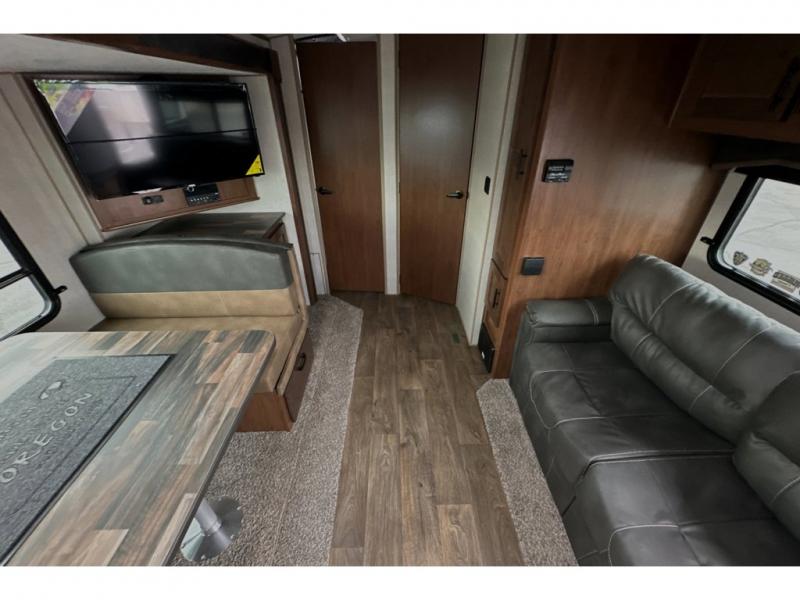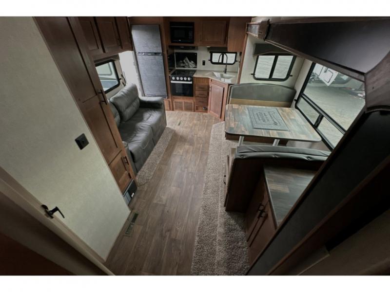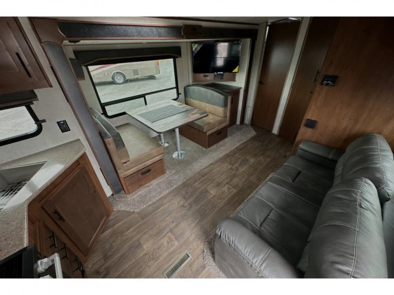 This rear kitchen travel trailer is made spacious thanks to the mountain dinette slide out in the main living area and the queen bed slide out in the front bedroom. You will also find a bench hamper and front wardrobe in the bedroom, along with your own exterior entry door. A sleeper sofa provides more sleeping space in the middle living room and the 40" TV will let you enjoy movie nights. And don't overlook the rear kitchen with plenty of counter space, a farm sink, and a sunken range with a glass front.