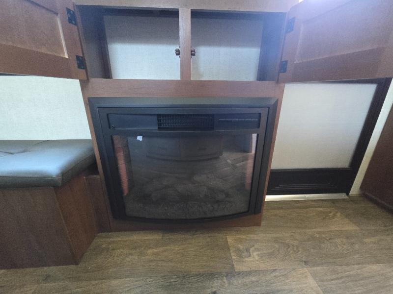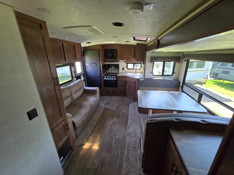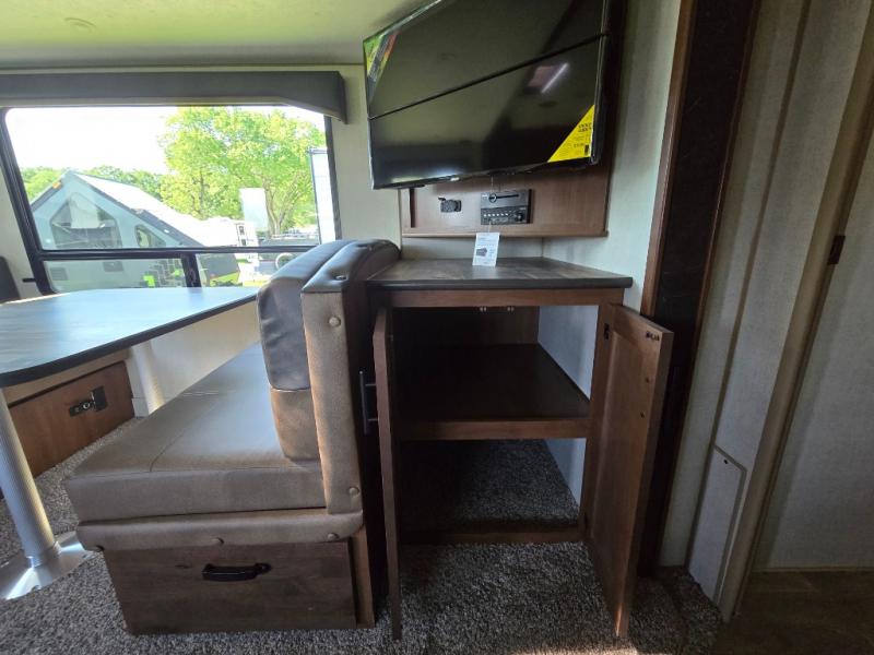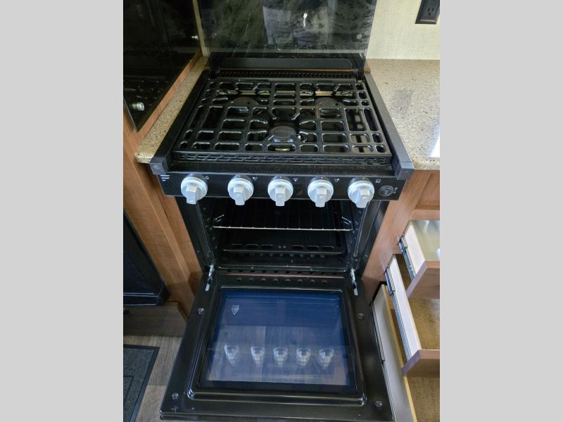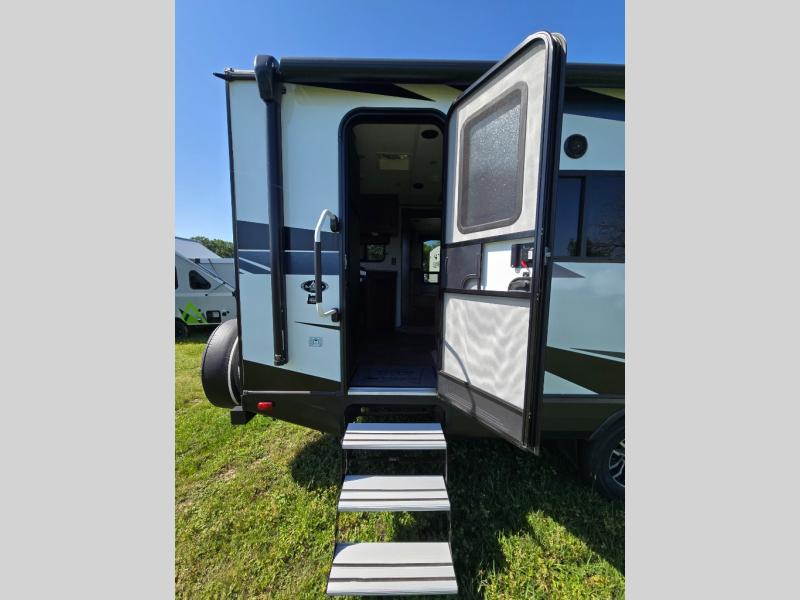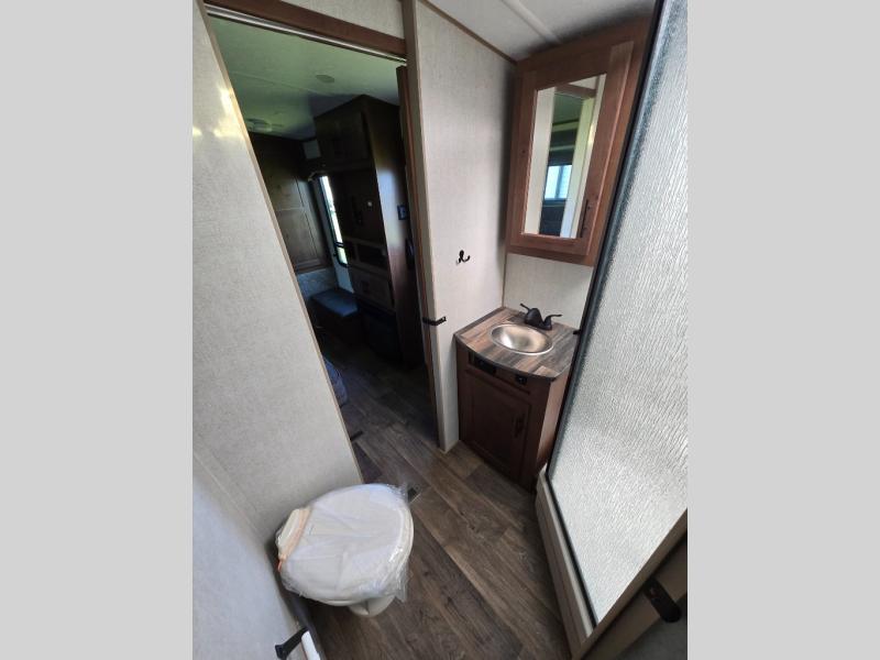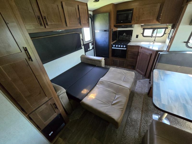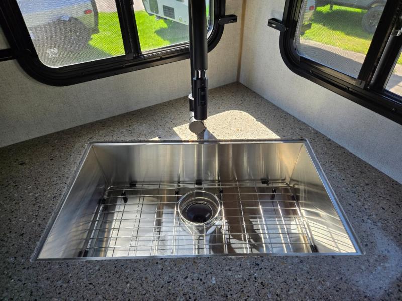This rear kitchen travel trailer is made spacious thanks to the mountain dinette slide out in the main living area and the queen bed slide out in the front bedroom. You will also find a bench hamper and front wardrobe in the bedroom, along with your own exterior entry door. A sleeper sofa provides more sleeping space in the middle living room and the 40" TV will let you enjoy movie nights. And don't overlook the rear kitchen with plenty of counter space, a farm sink, and a sunken range with a glass front.