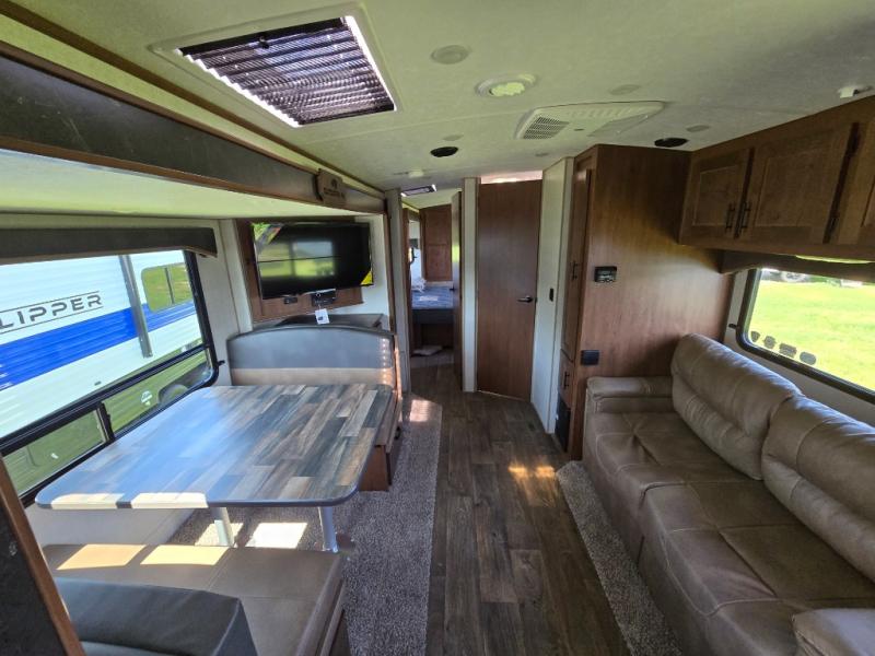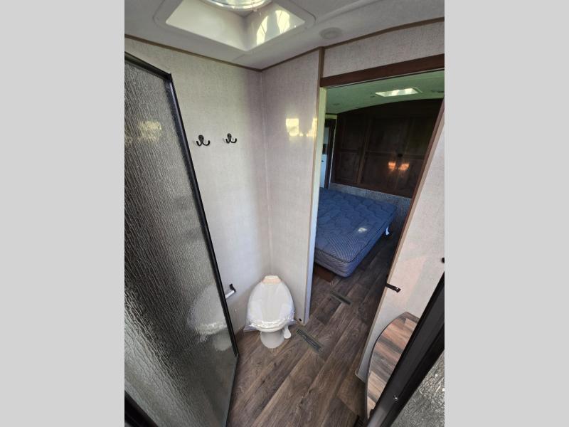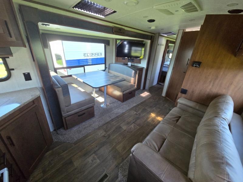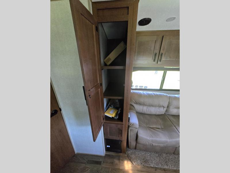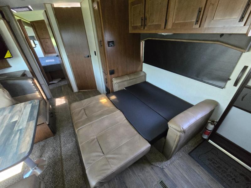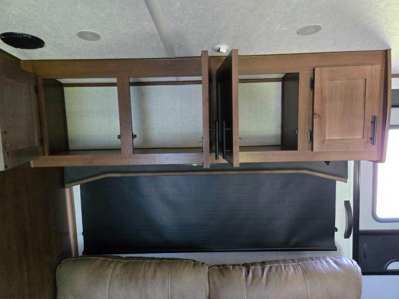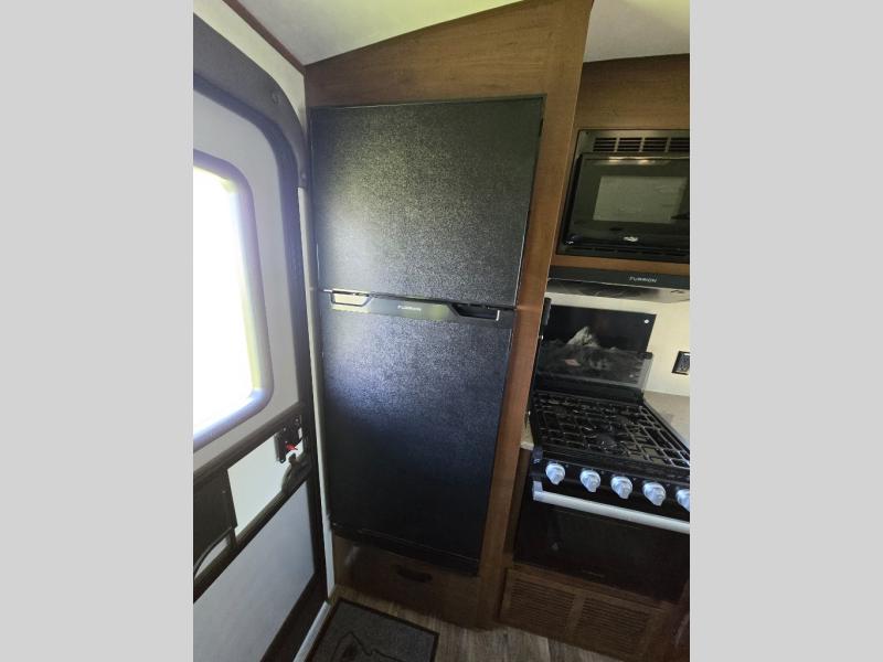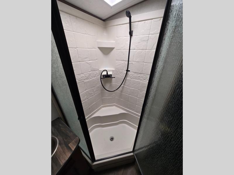 This rear kitchen travel trailer is made spacious thanks to the mountain dinette slide out in the main living area and the queen bed slide out in the front bedroom. You will also find a bench hamper and front wardrobe in the bedroom, along with your own exterior entry door. A sleeper sofa provides more sleeping space in the middle living room and the 40" TV will let you enjoy movie nights. And don't overlook the rear kitchen with plenty of counter space, a farm sink, and a sunken range with a glass front.
