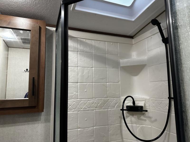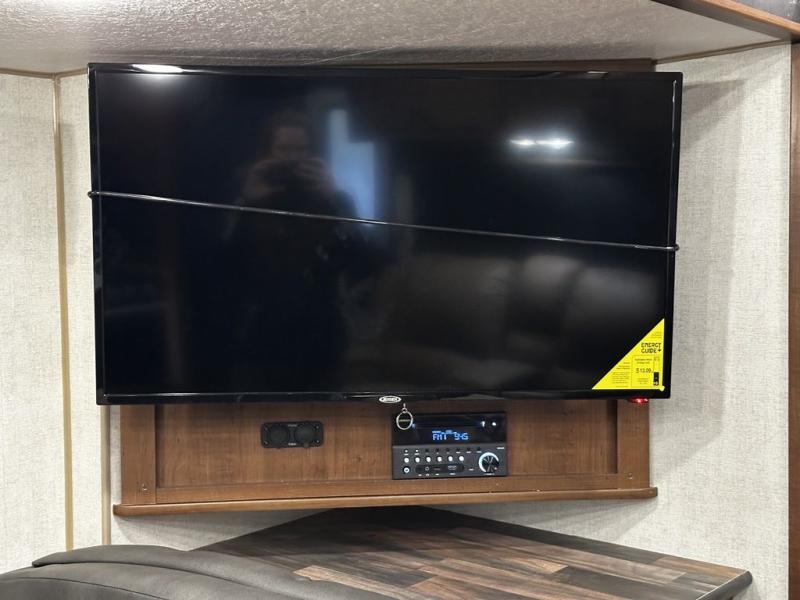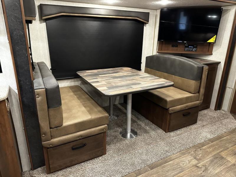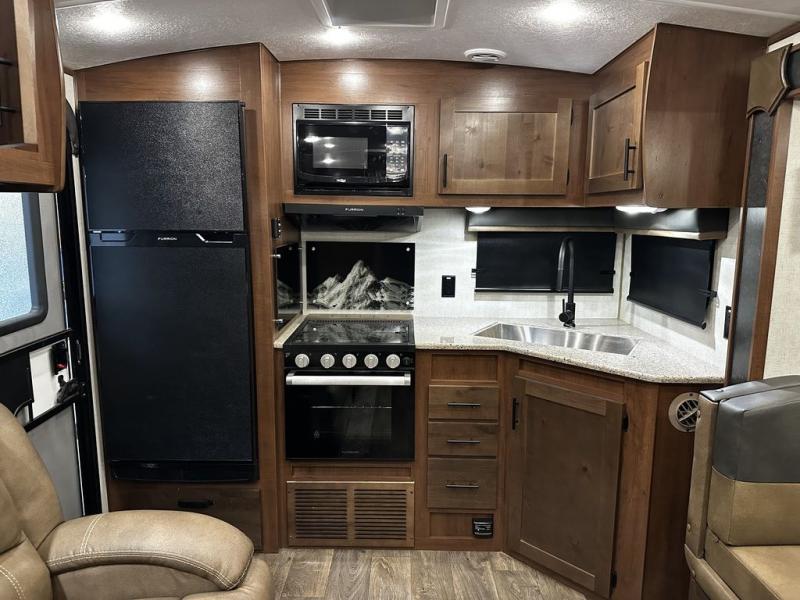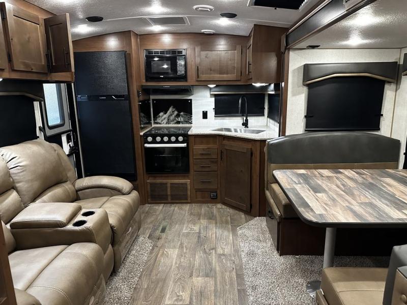 This rear kitchen travel trailer is made spacious thanks to the mountain dinette slide out in the main living area and the queen bed slide out in the front bedroom. You will also find a bench hamper and front wardrobe in the bedroom, along with your own exterior entry door. A sleeper sofa provides more sleeping space in the middle living room and the 40" TV will let you enjoy movie nights. And don't overlook the rear kitchen with plenty of counter space, a farm sink, and a sunken range with a glass front.