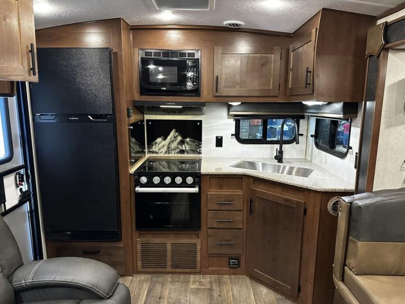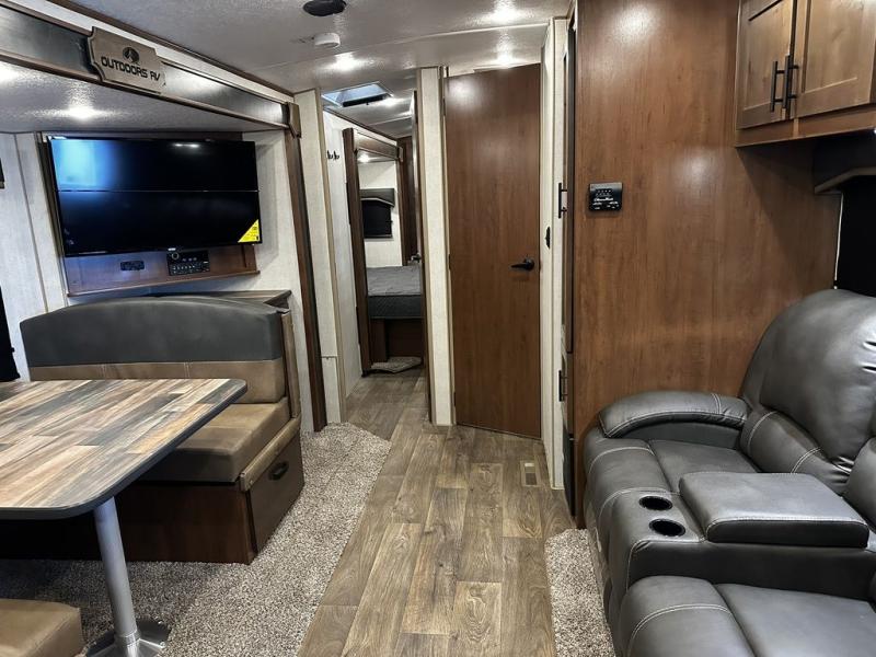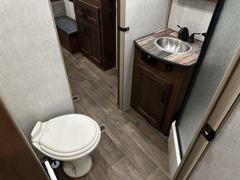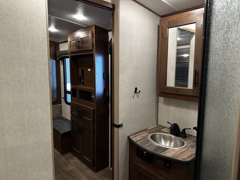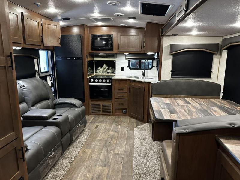 This rear kitchen travel trailer is made spacious thanks to the mountain dinette slide out in the main living area and the queen bed slide out in the front bedroom. You will also find a bench hamper and front wardrobe in the bedroom, along with your own exterior entry door. A sleeper sofa provides more sleeping space in the middle living room and the 40" TV will let you enjoy movie nights. And don't overlook the rear kitchen with plenty of counter space, a farm sink, and a sunken range with a glass front.