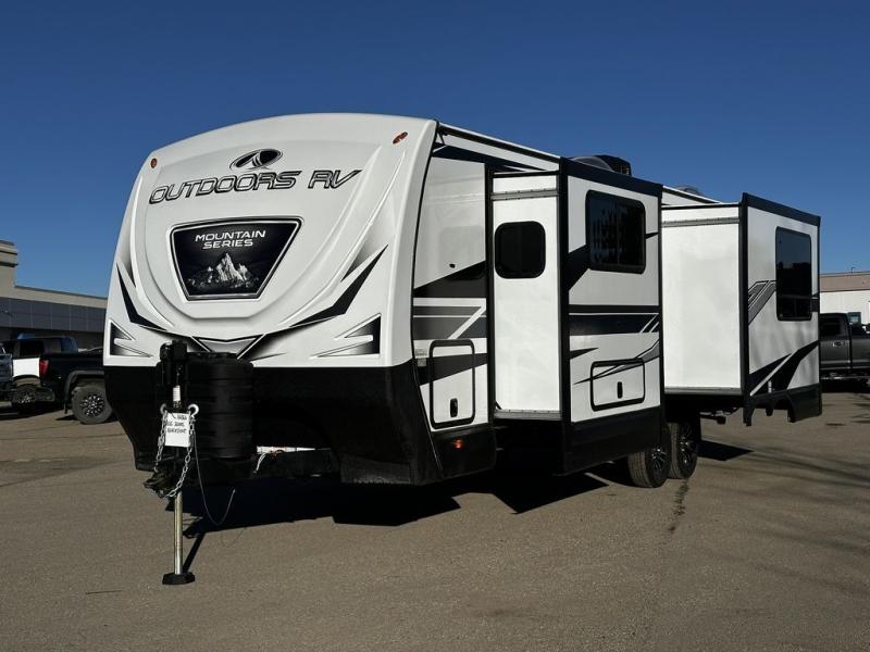With any Black Stone Mountain Series travel trailer by Outdoors RV you will enjoy climate designed four seasons camping thanks to the thermal pane windows and the fully enclosed, heated, and insulated underbelly. The custom built chassis and rugged integrated A-frame are built for strength and durability, along with the rugged 2" bonded aluminum frame walls. Each model includes LG solid surface countertops, granite designed backsplash, vaulted radius ceilings, and a mountain comfort premium mattress for all-around comfort. You will also love the XL panoramic slide out windows and the dual pane living room skylight with a shade to let natural light in!