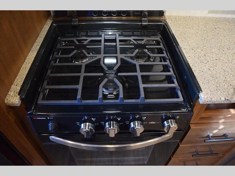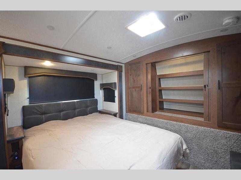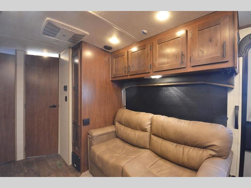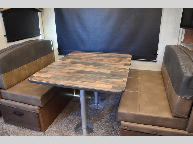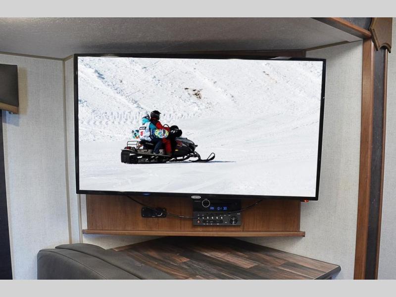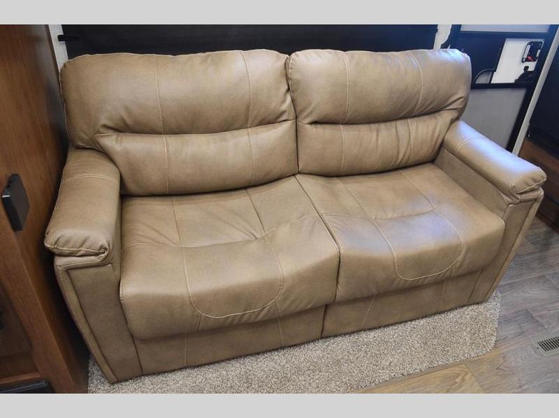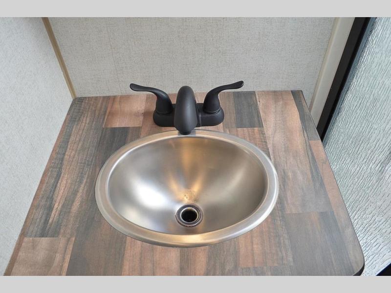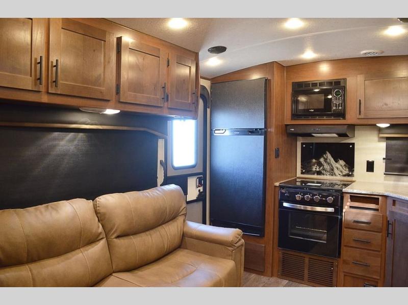 This rear kitchen travel trailer is made spacious thanks to the mountain dinette slide out in the main living area and the queen bed slide out in the front bedroom. You will also find a bench hamper and front wardrobe in the bedroom, along with your own exterior entry door. A sleeper sofa provides more sleeping space in the middle living room and the 40" TV will let you enjoy movie nights. And don't overlook the rear kitchen with plenty of counter space, a farm sink, and a sunken range with a glass front.