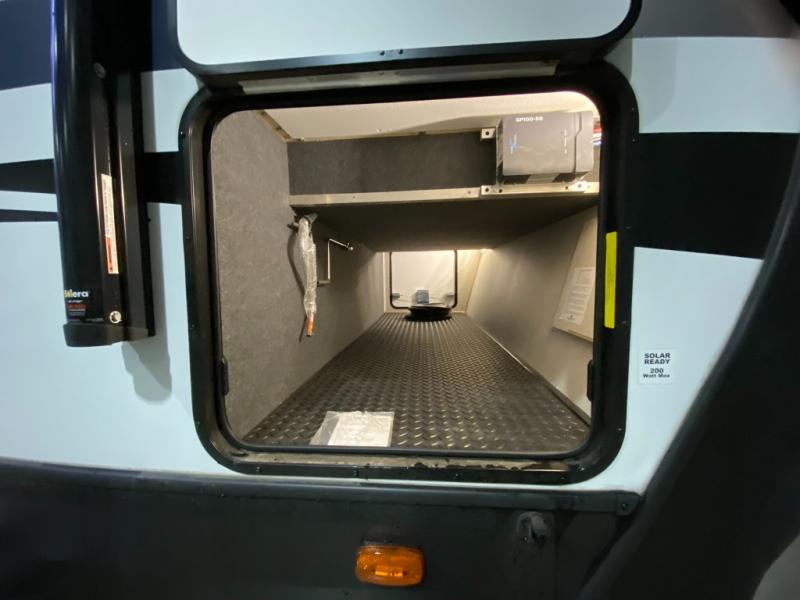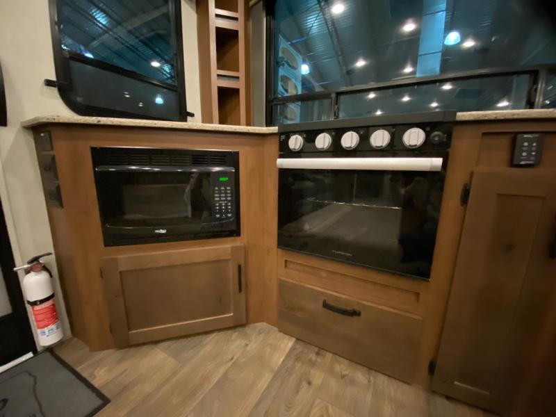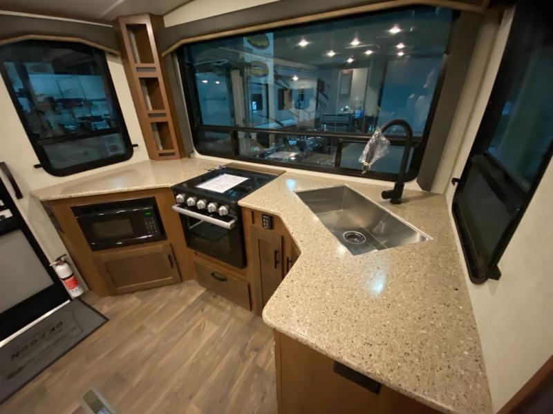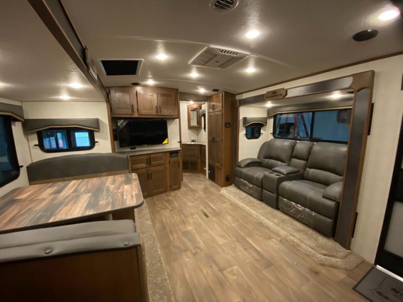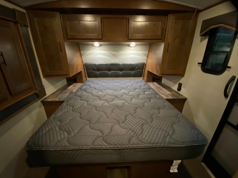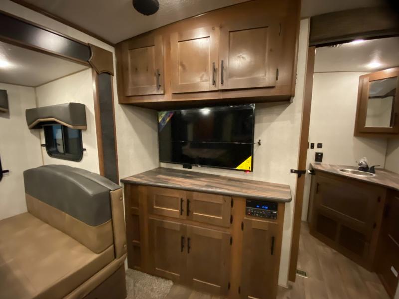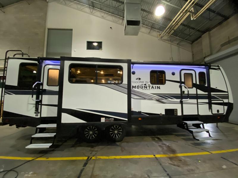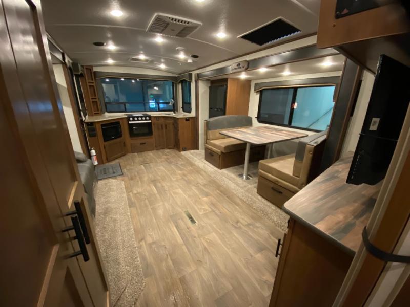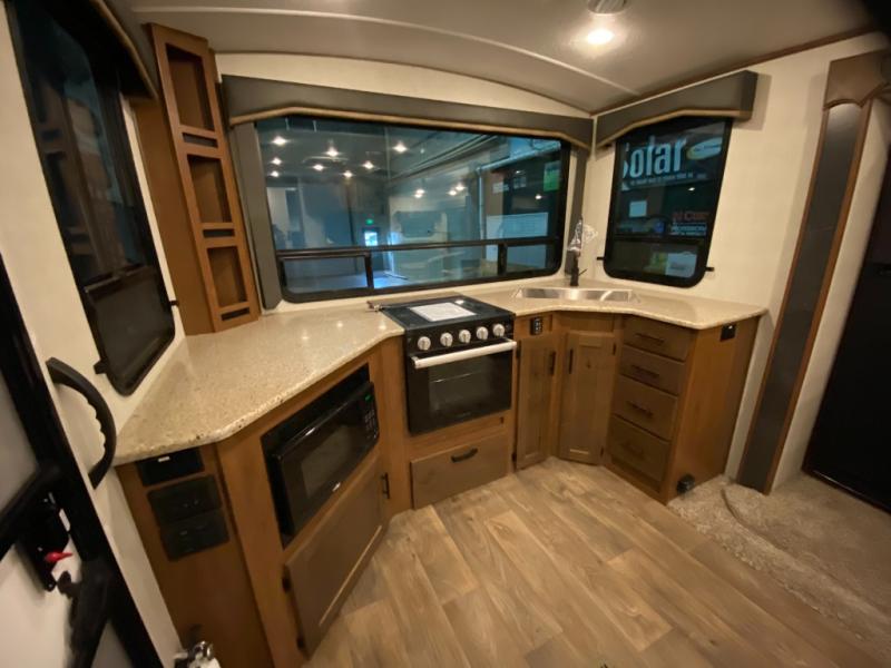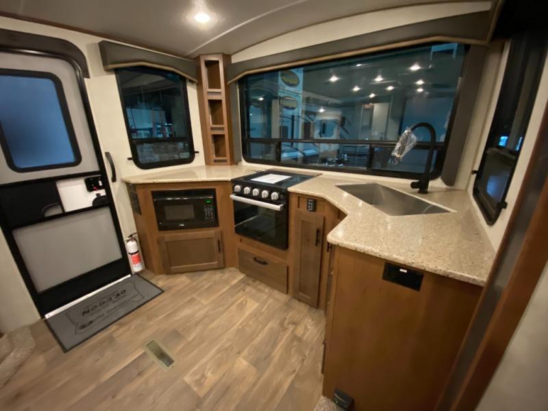 Dual entry doors in this travel trailer will allow you to enter in through the rear kitchen or the front master bedroom. A walk-through bath is easily accessible for everyone, and the main living area is made open thanks to the dual opposing slides. While dinner is being made on the three burner cooktop, you can play a game at the mountain dinette, or relax on the sofa with built-in recliners and watch a movie on the swing-out 40" TV. You'll appreciate plenty of storage space in this model, including a pantry, wardrobes on either side of the bed, plus a wardrobe slide in the bedroom for your favorite outfits!