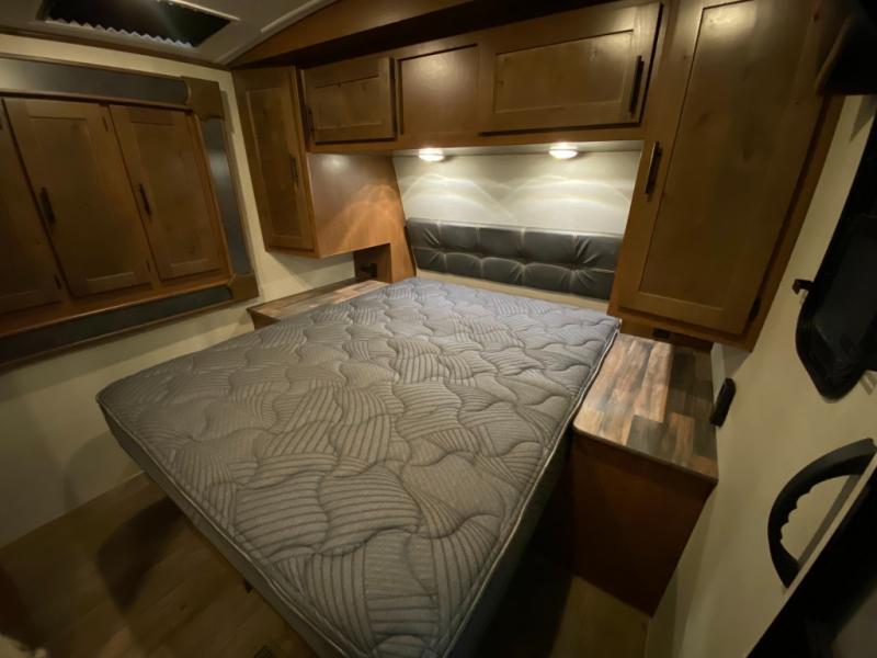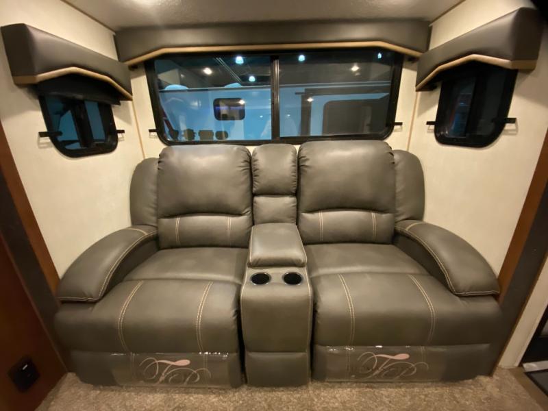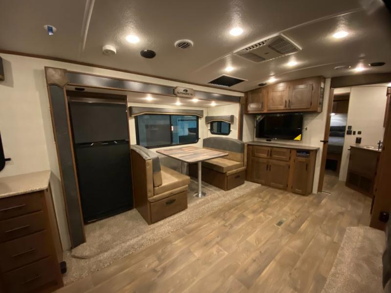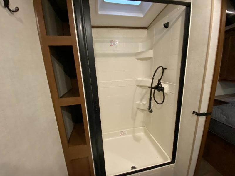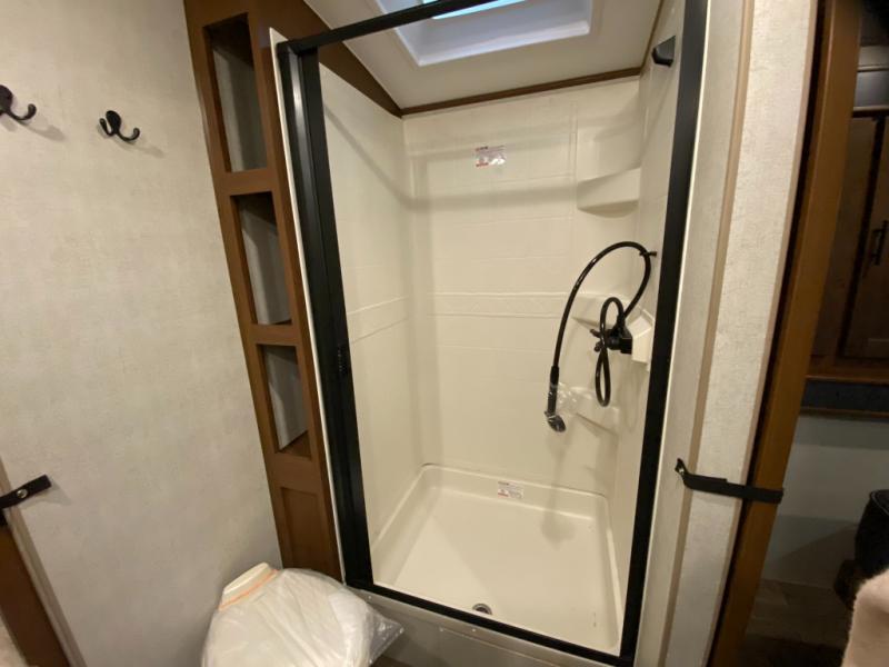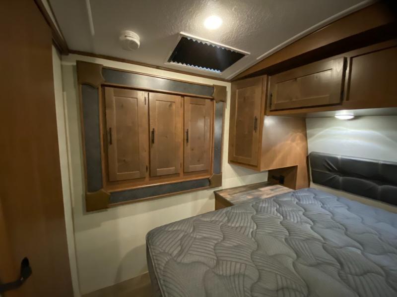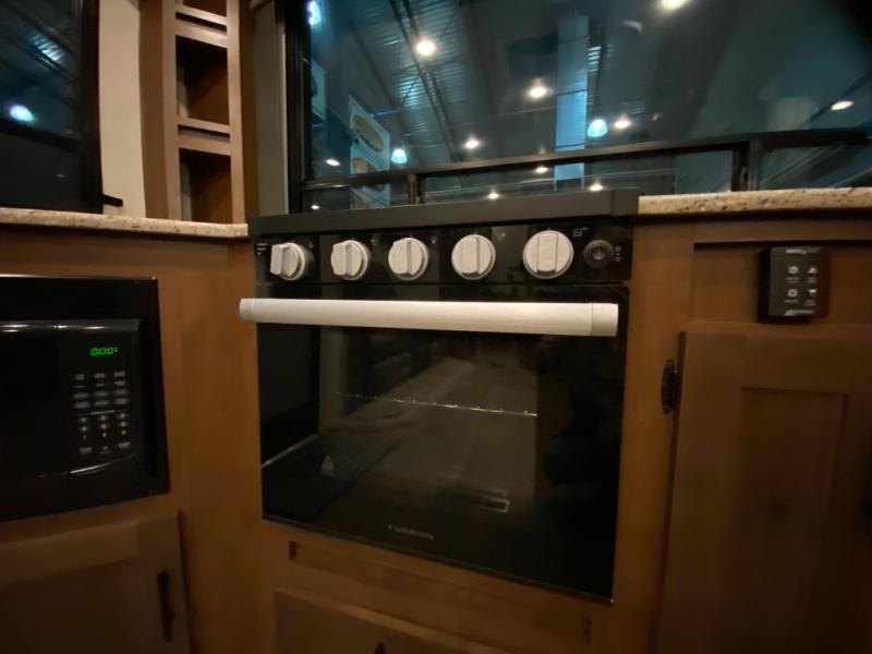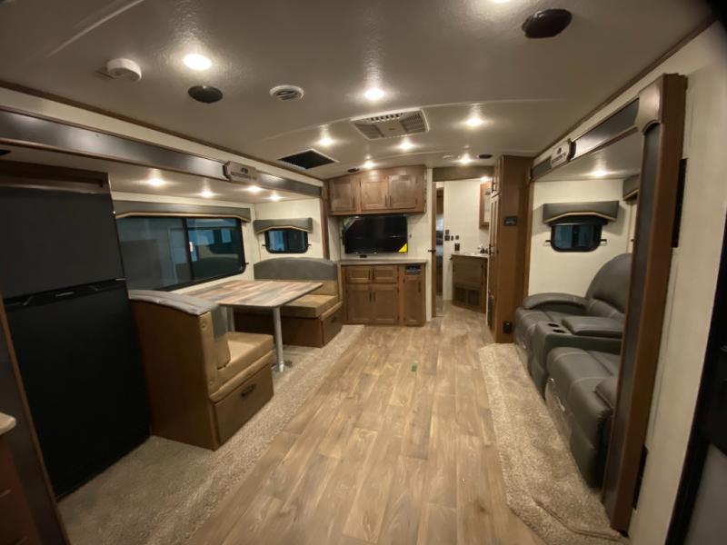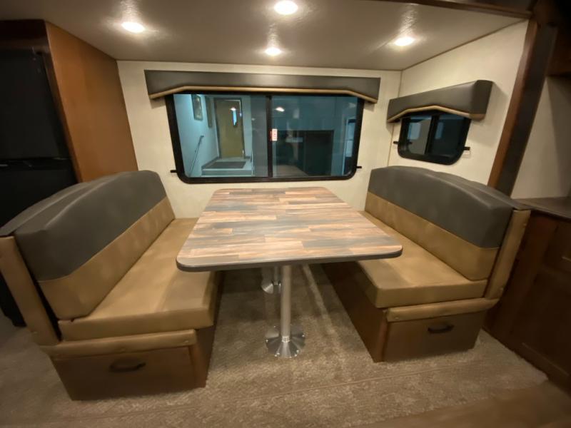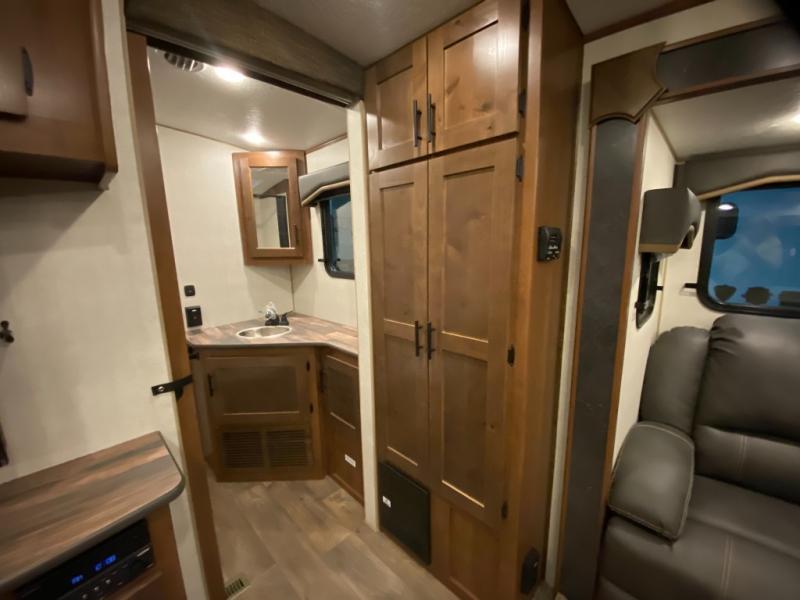 Dual entry doors in this travel trailer will allow you to enter in through the rear kitchen or the front master bedroom. A walk-through bath is easily accessible for everyone, and the main living area is made open thanks to the dual opposing slides. While dinner is being made on the three burner cooktop, you can play a game at the mountain dinette, or relax on the sofa with built-in recliners and watch a movie on the swing-out 40" TV. You'll appreciate plenty of storage space in this model, including a pantry, wardrobes on either side of the bed, plus a wardrobe slide in the bedroom for your favorite outfits!