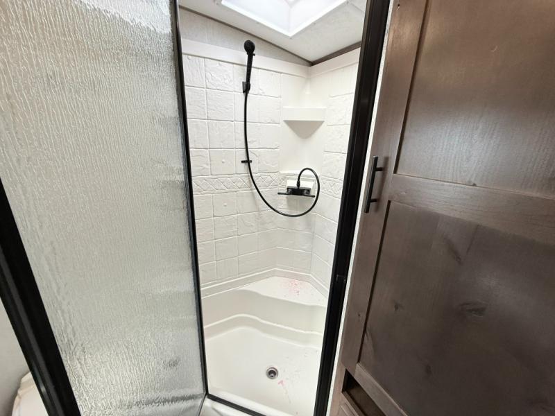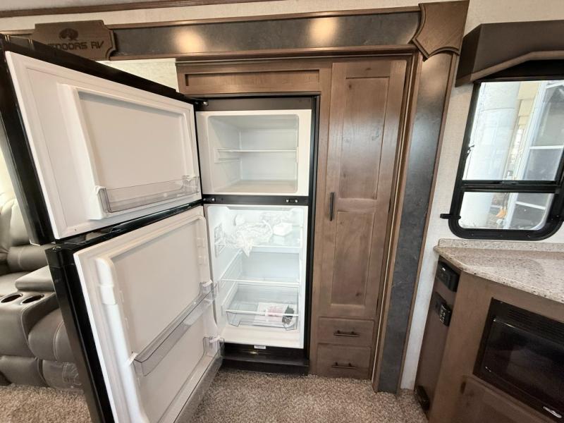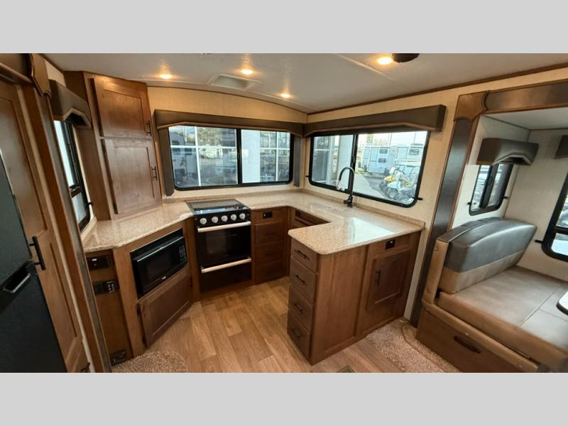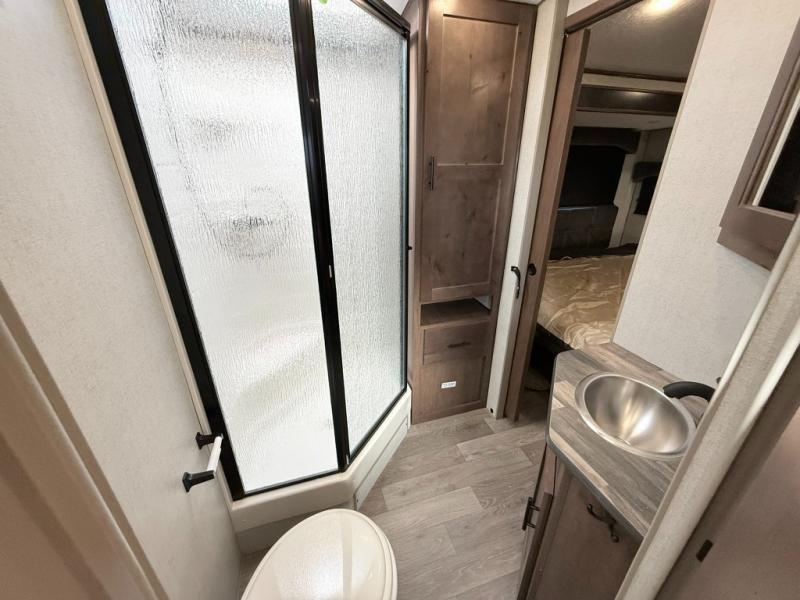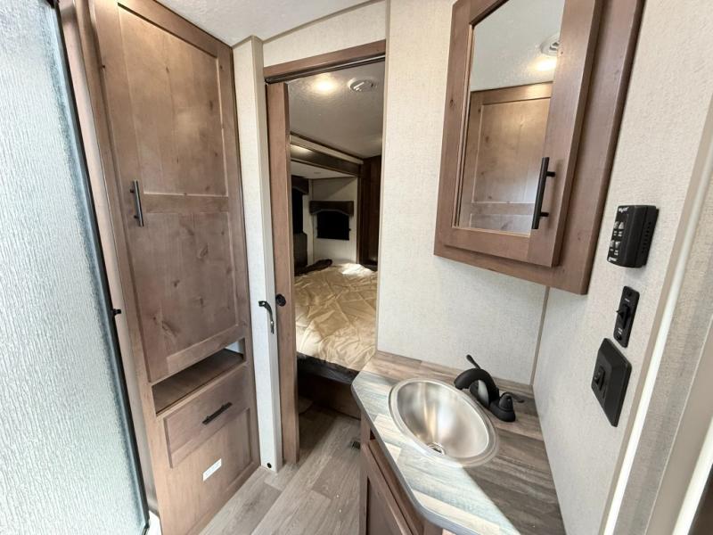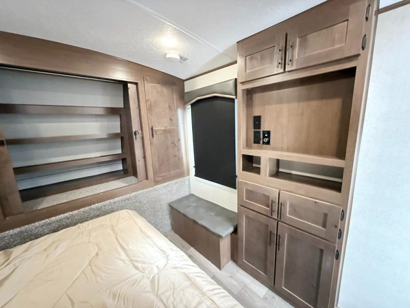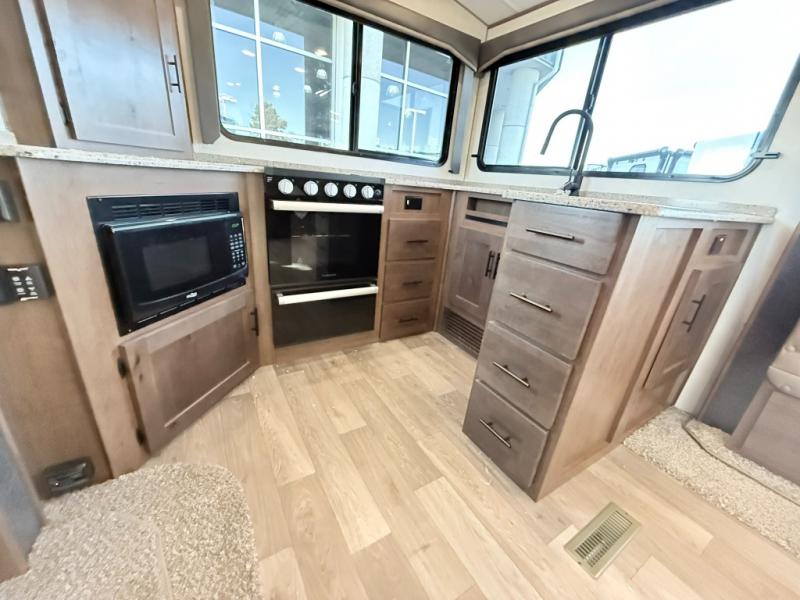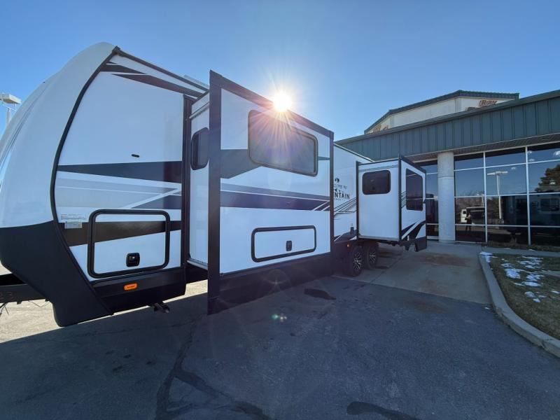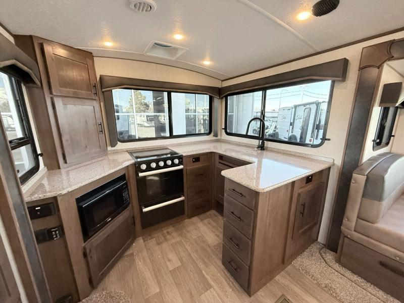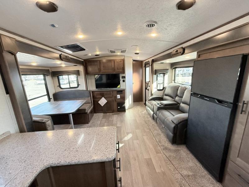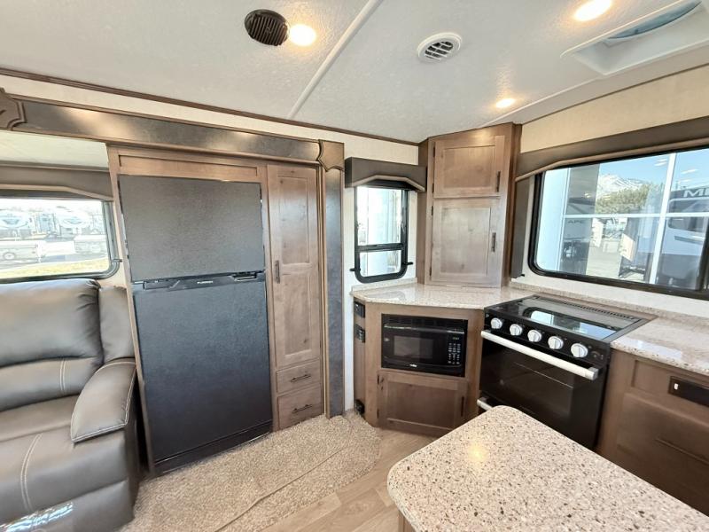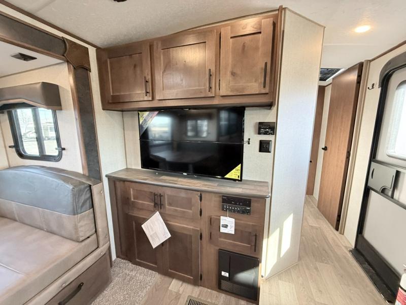 One step inside this roomy travel trailer and you'll be hooked! Your crew will love to visit in the main living area that includes dual opposing slides for tons of space, and there is a residential sofa with built-in recliners here to relax. The mountain dinette with a skylight will be the perfect place for a game of cards, and don't overlook the swing-out 40" TV here as well. This model abundant counter space in the rear kitchen and plenty of windows to take in the outdoor views as you cook. A dual entry bath is super convenient to have, and the front master bedroom will have you feeling right at home. Here, you'll find a queen bed slide out, a large front closet, plus a bench hamper to keep your space tidy.