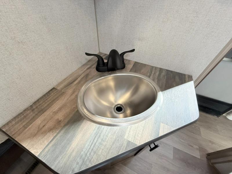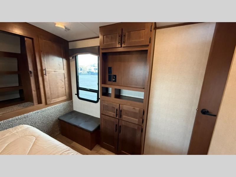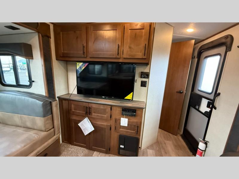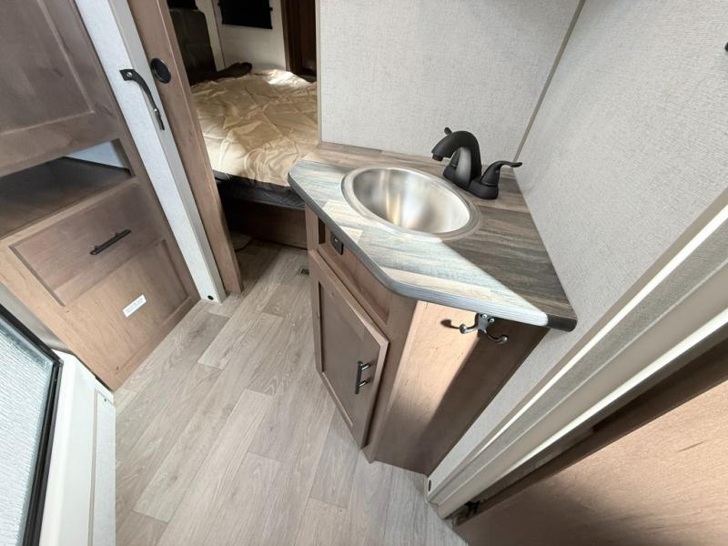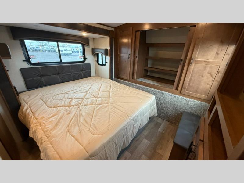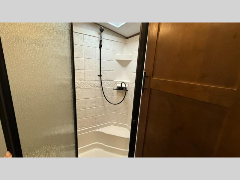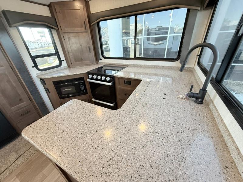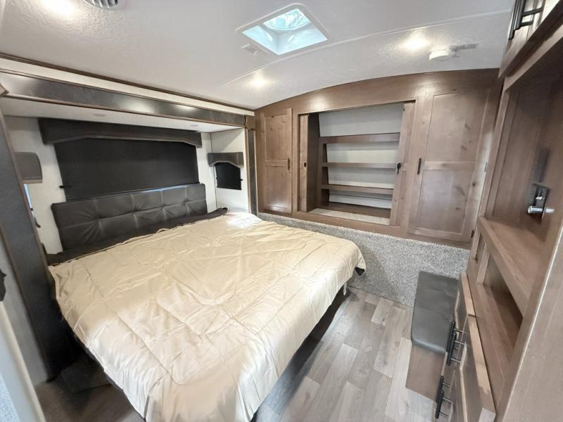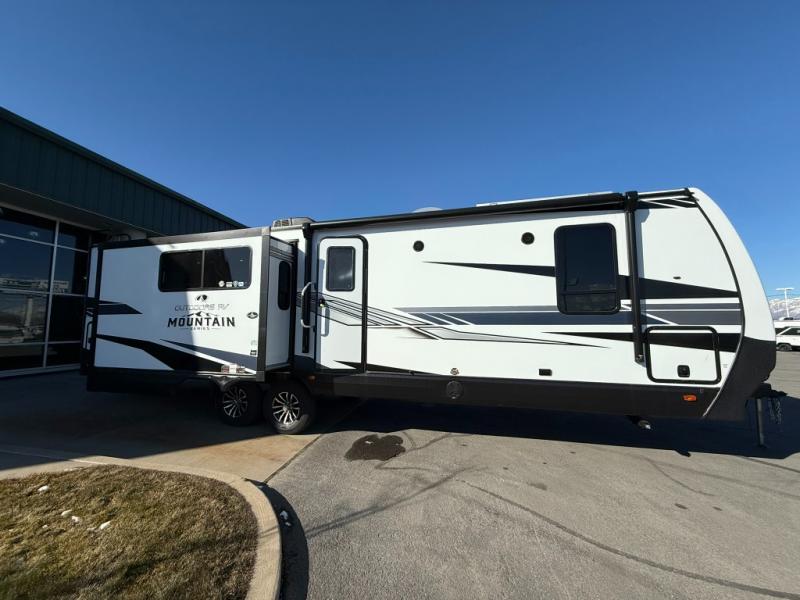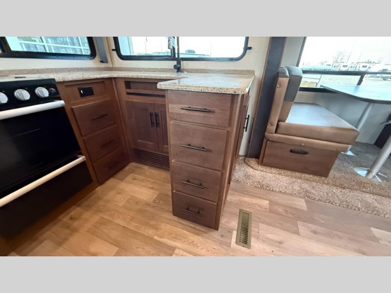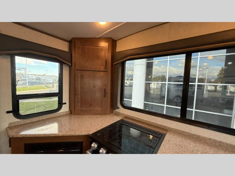 One step inside this roomy travel trailer and you'll be hooked! Your crew will love to visit in the main living area that includes dual opposing slides for tons of space, and there is a residential sofa with built-in recliners here to relax. The mountain dinette with a skylight will be the perfect place for a game of cards, and don't overlook the swing-out 40" TV here as well. This model abundant counter space in the rear kitchen and plenty of windows to take in the outdoor views as you cook. A dual entry bath is super convenient to have, and the front master bedroom will have you feeling right at home. Here, you'll find a queen bed slide out, a large front closet, plus a bench hamper to keep your space tidy.