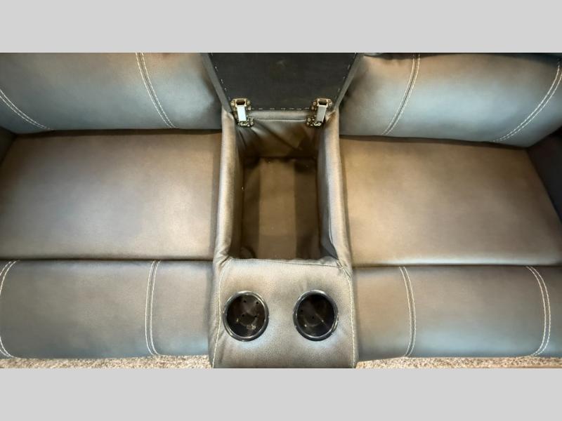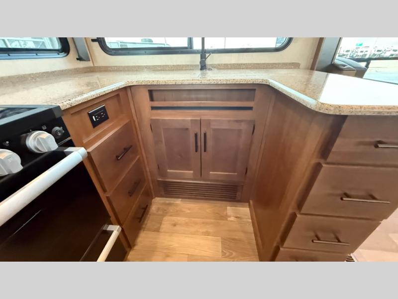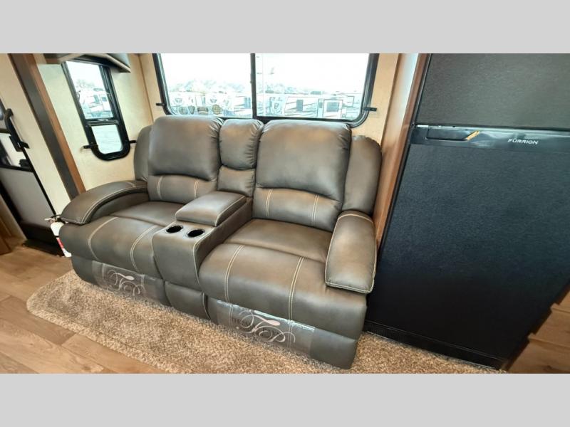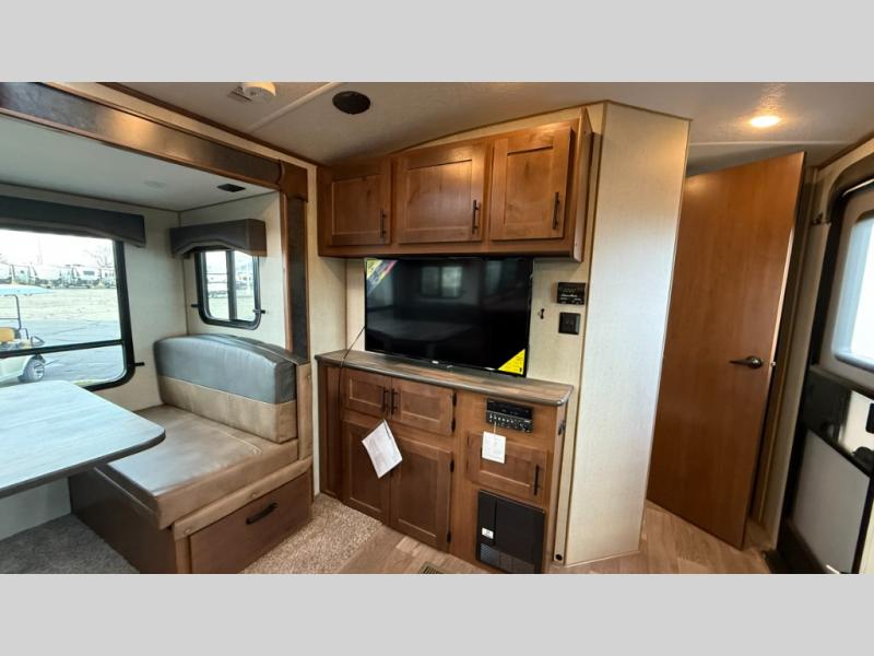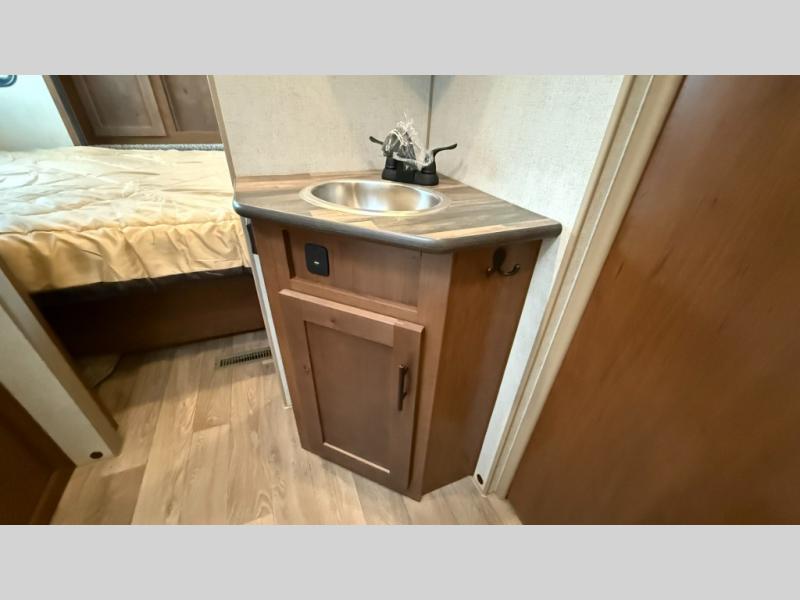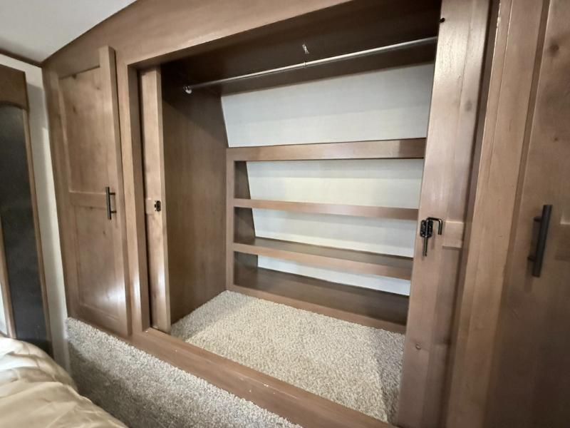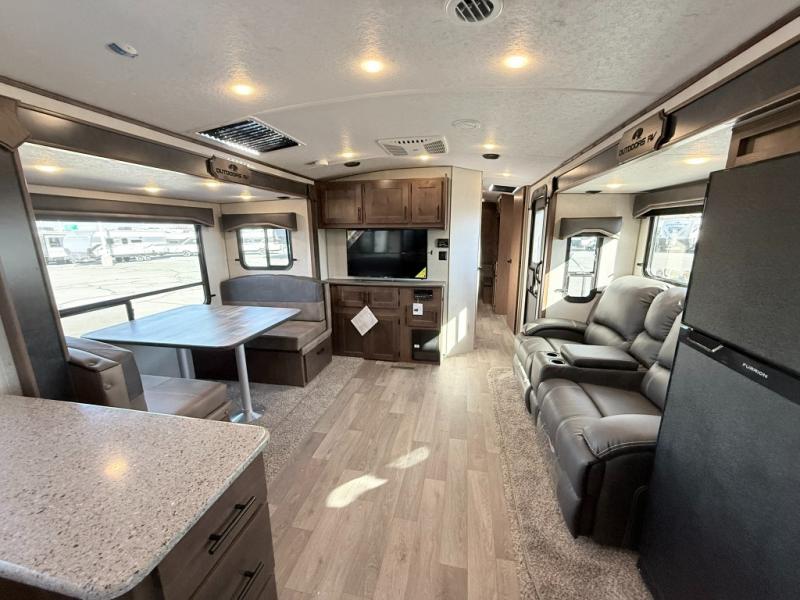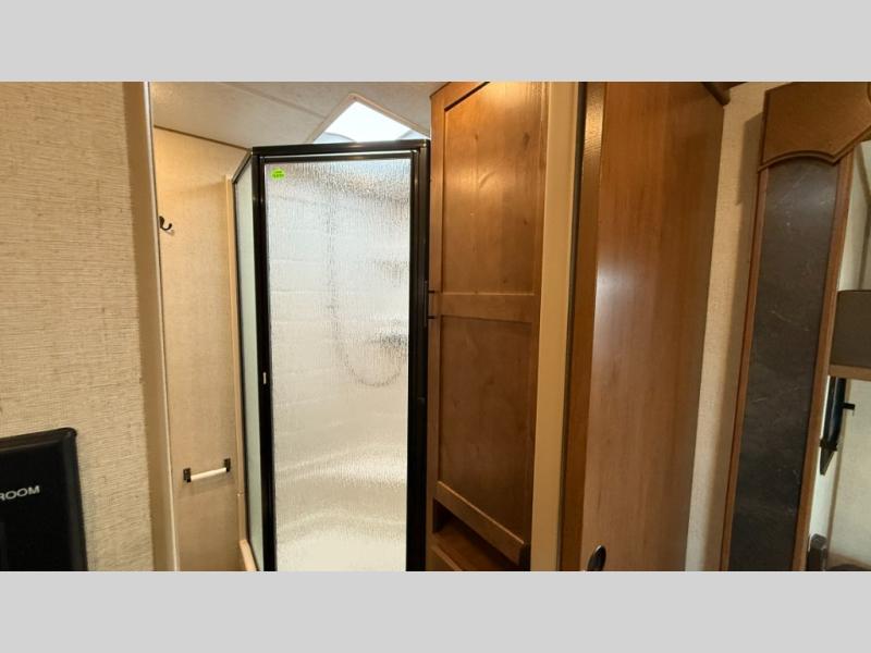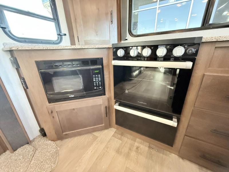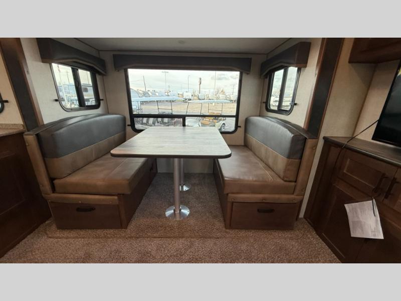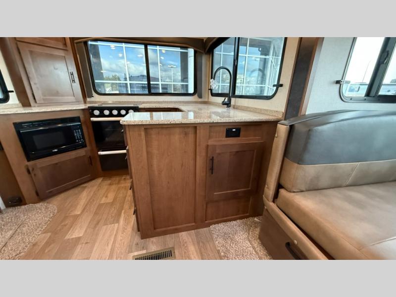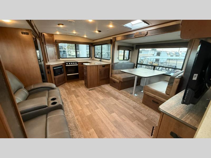 One step inside this roomy travel trailer and you'll be hooked! Your crew will love to visit in the main living area that includes dual opposing slides for tons of space, and there is a residential sofa with built-in recliners here to relax. The mountain dinette with a skylight will be the perfect place for a game of cards, and don't overlook the swing-out 40" TV here as well. This model abundant counter space in the rear kitchen and plenty of windows to take in the outdoor views as you cook. A dual entry bath is super convenient to have, and the front master bedroom will have you feeling right at home. Here, you'll find a queen bed slide out, a large front closet, plus a bench hamper to keep your space tidy.