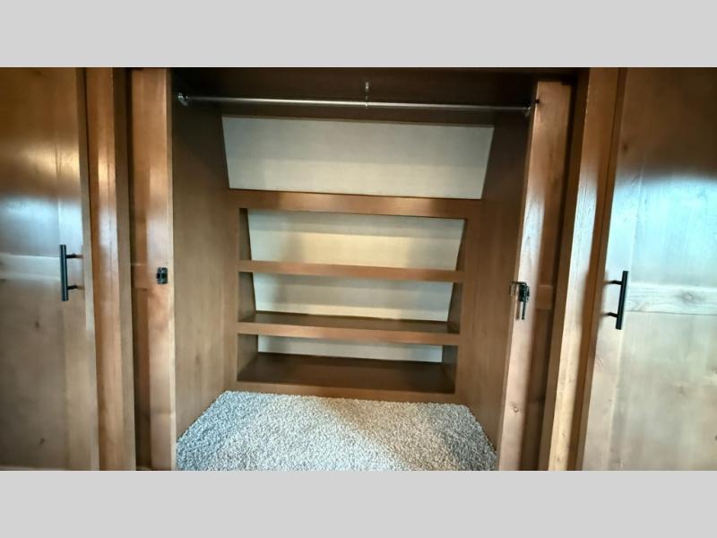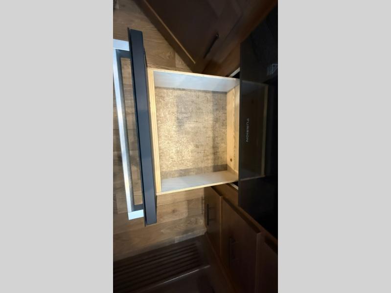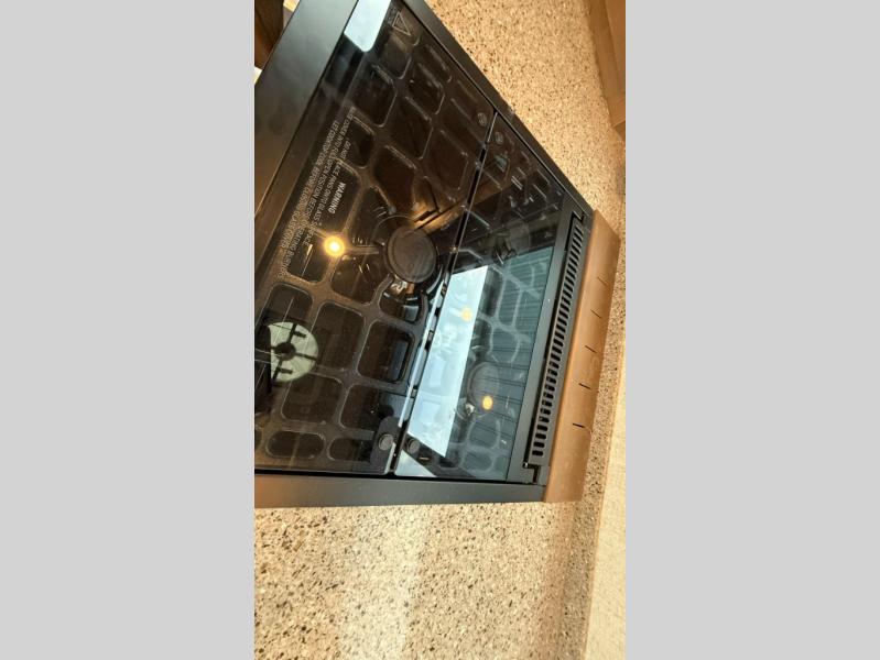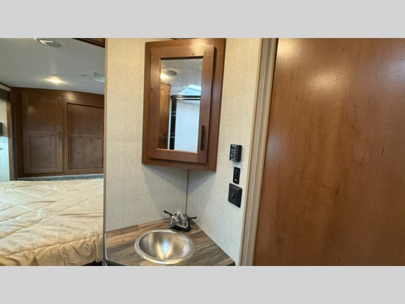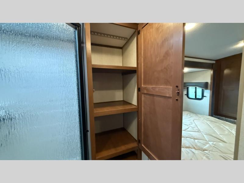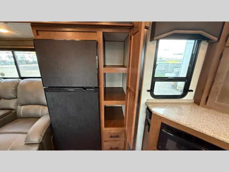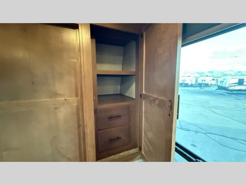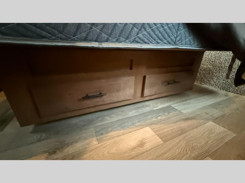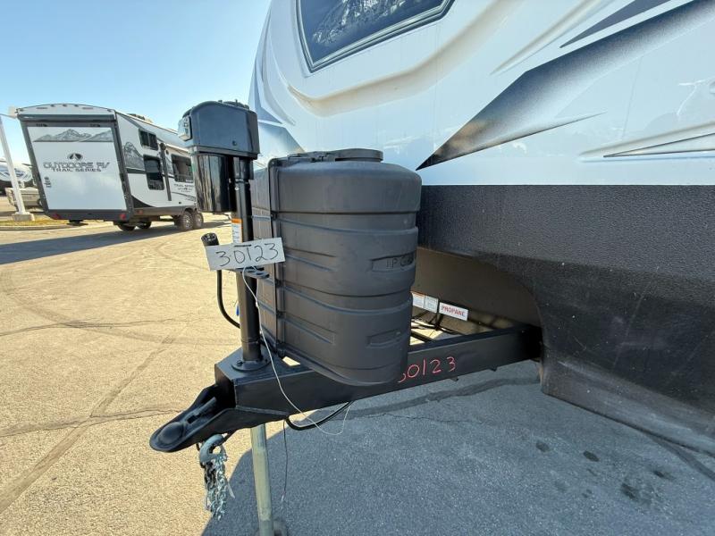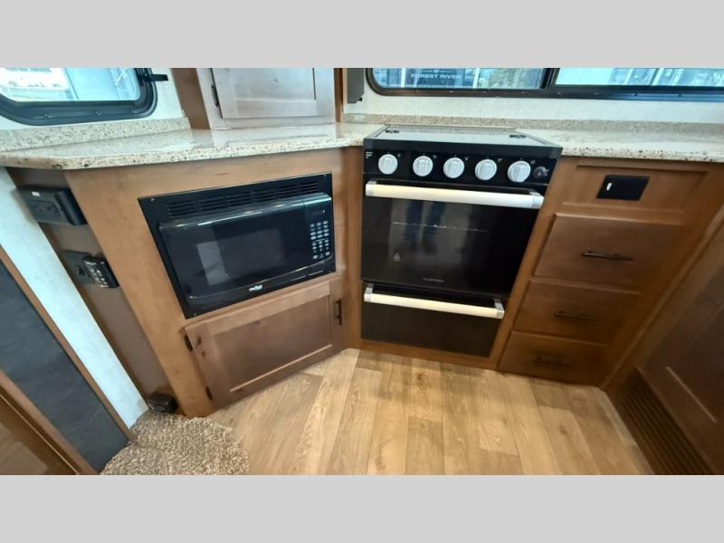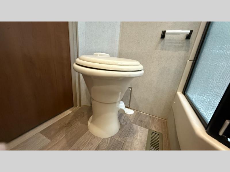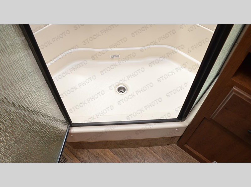 One step inside this roomy travel trailer and you'll be hooked! Your crew will love to visit in the main living area that includes dual opposing slides for tons of space, and there is a residential sofa with built-in recliners here to relax. The mountain dinette with a skylight will be the perfect place for a game of cards, and don't overlook the swing-out 40" TV here as well. This model abundant counter space in the rear kitchen and plenty of windows to take in the outdoor views as you cook. A dual entry bath is super convenient to have, and the front master bedroom will have you feeling right at home. Here, you'll find a queen bed slide out, a large front closet, plus a bench hamper to keep your space tidy.