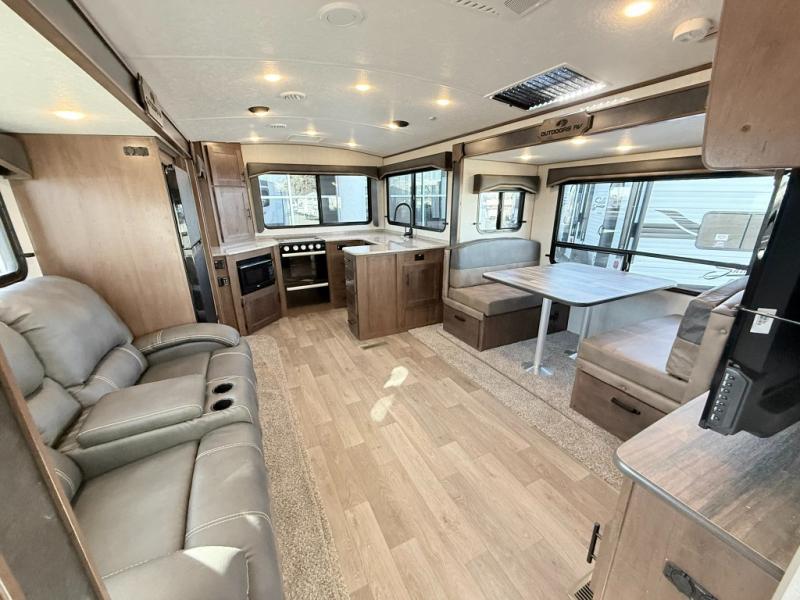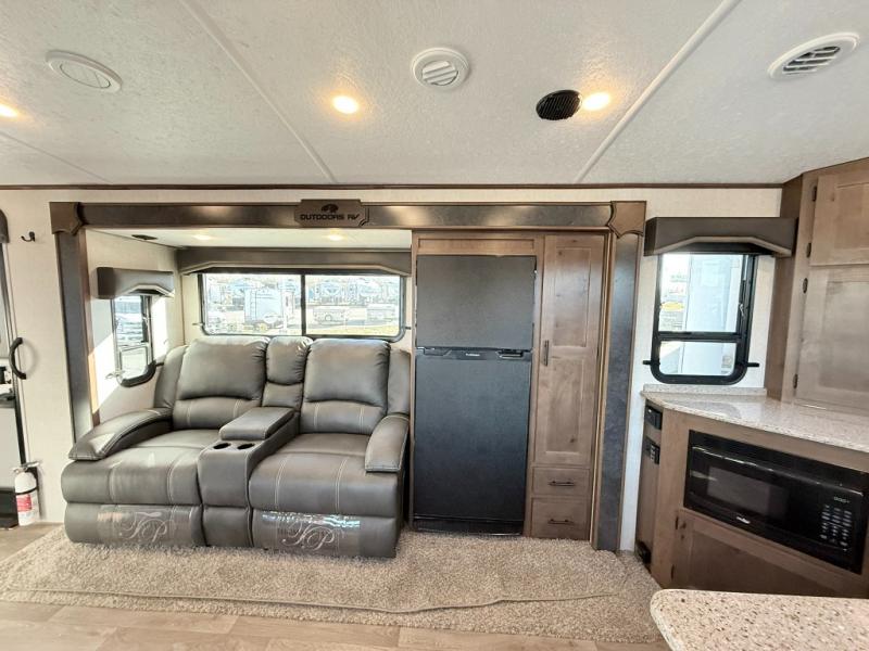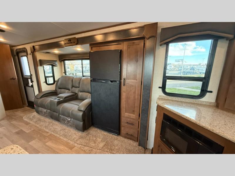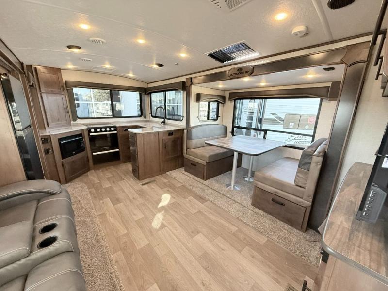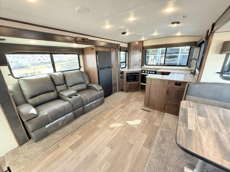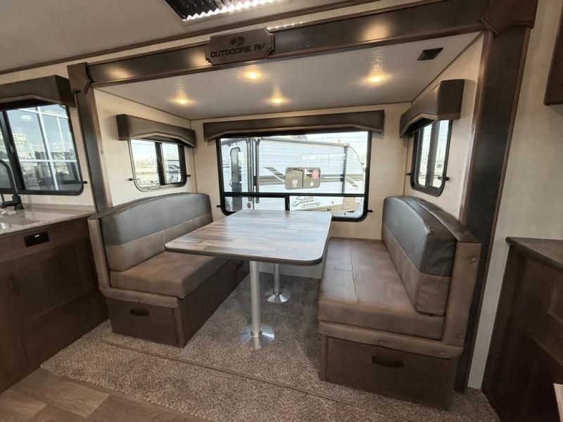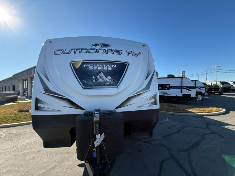 With any Black Stone Mountain Series travel trailer by Outdoors RV you will enjoy climate designed four seasons camping thanks to the thermal pane windows and the fully enclosed, heated, and insulated underbelly. The custom built chassis and rugged integrated A-frame are built for strength and durability, along with the rugged 2" bonded aluminum frame walls. Each model includes LG solid surface countertops, granite designed backsplash, vaulted radius ceilings, and a mountain comfort premium mattress for all-around comfort. You will also love the XL panoramic slide out windows and the dual pane living room skylight with a shade to let natural light in!