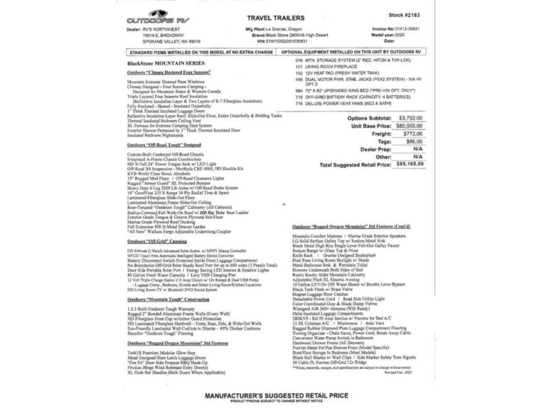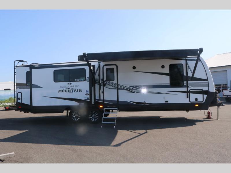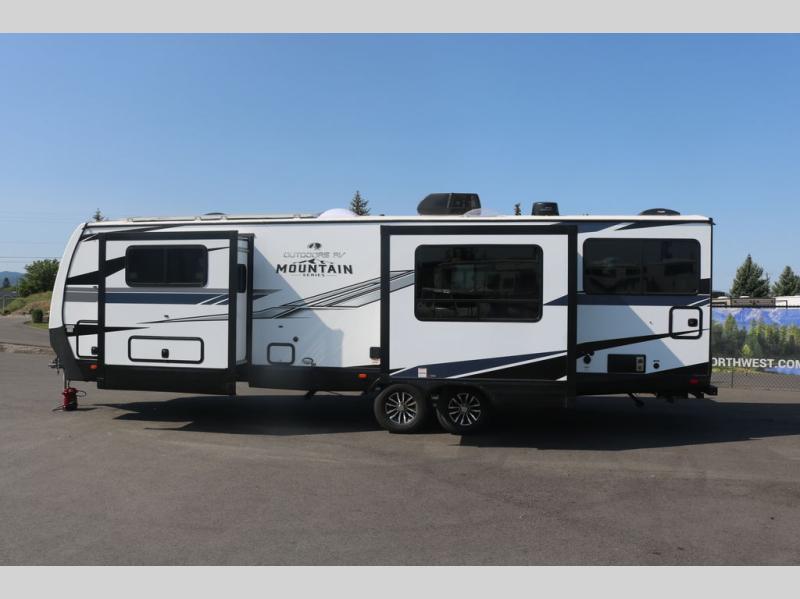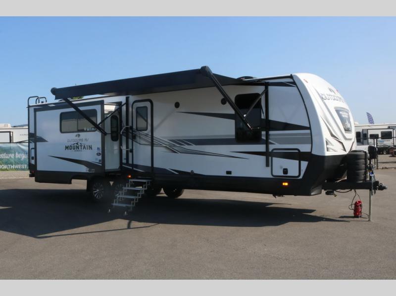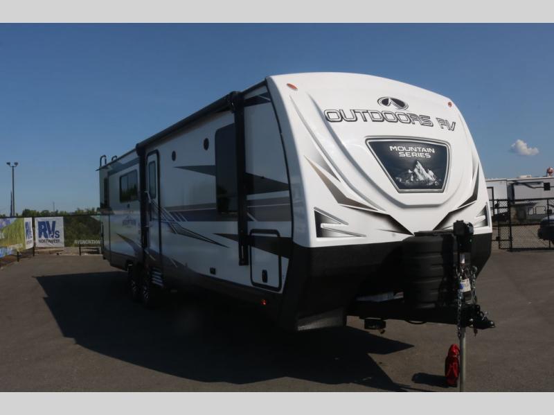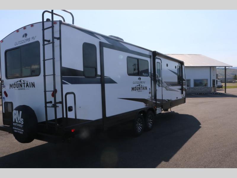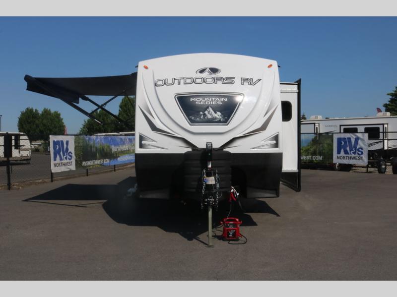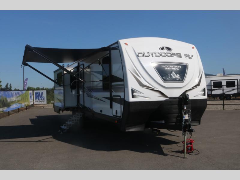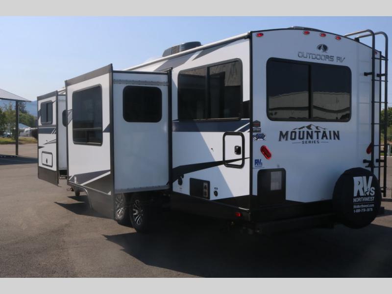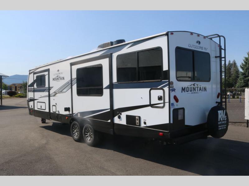 With any Black Stone Mountain Series travel trailer by Outdoors RV you will enjoy climate designed four seasons camping thanks to the thermal pane windows and the fully enclosed, heated, and insulated underbelly. The custom built chassis and rugged integrated A-frame are built for strength and durability, along with the rugged 2" bonded aluminum frame walls. Each model includes LG solid surface countertops, granite designed backsplash, vaulted radius ceilings, and a mountain comfort premium mattress for all-around comfort. You will also love the XL panoramic slide out windows and the dual pane living room skylight with a shade to let natural light in!