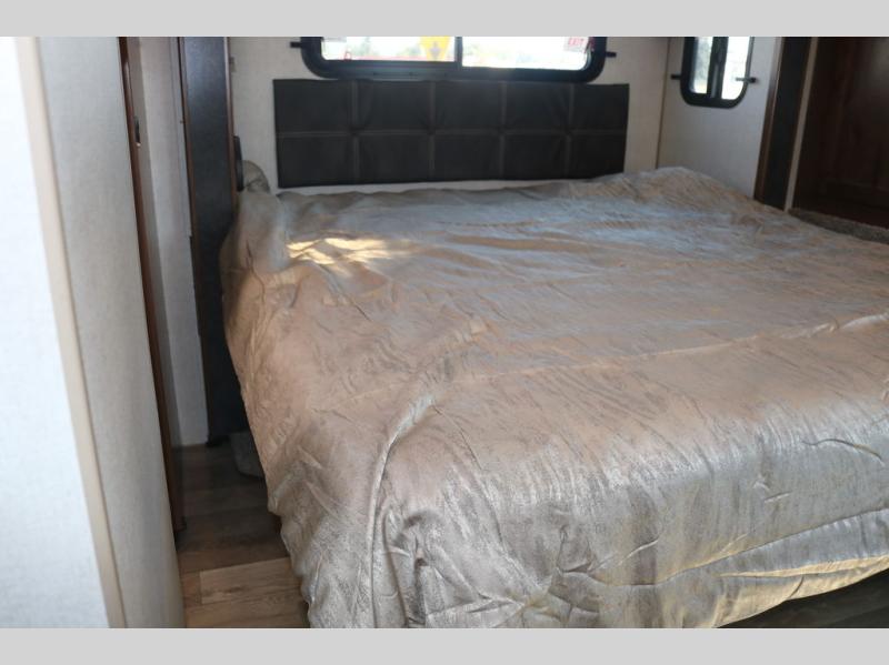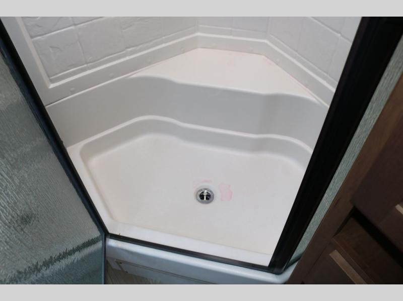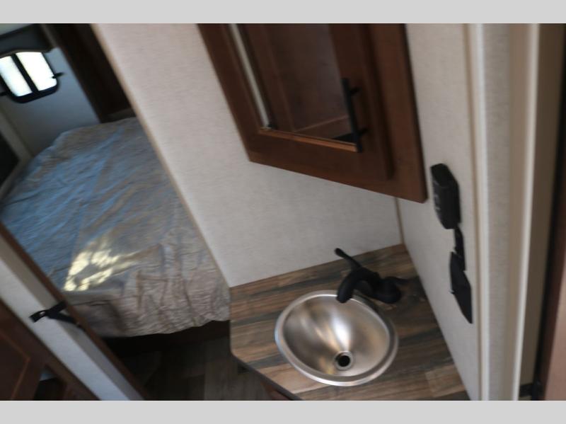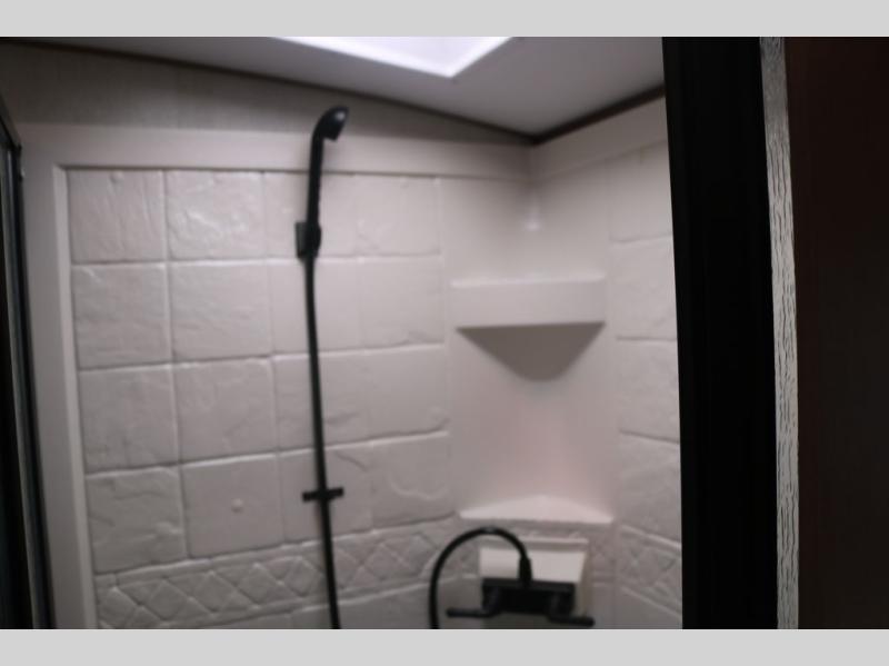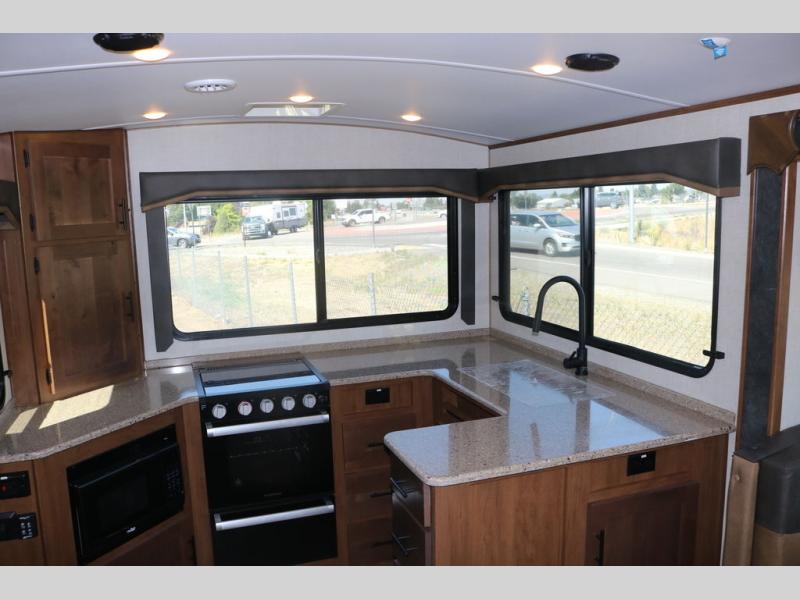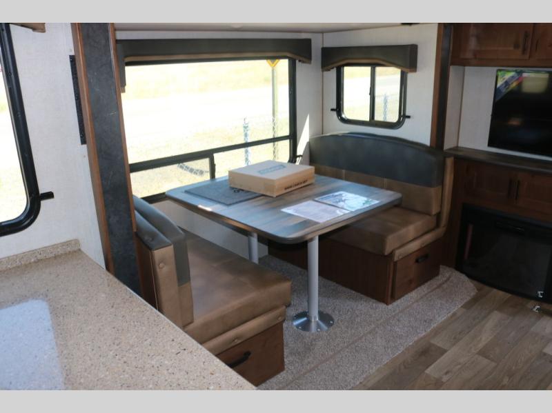 One step inside this roomy travel trailer and you'll be hooked! Your crew will love to visit in the main living area that includes dual opposing slides for tons of space, and there is a residential sofa with built-in recliners here to relax. The mountain dinette with a skylight will be the perfect place for a game of cards, and don't overlook the swing-out 40" TV here as well. This model abundant counter space in the rear kitchen and plenty of windows to take in the outdoor views as you cook. A dual entry bath is super convenient to have, and the front master bedroom will have you feeling right at home. Here, you'll find a queen bed slide out, a large front closet, plus a bench hamper to keep your space tidy.
