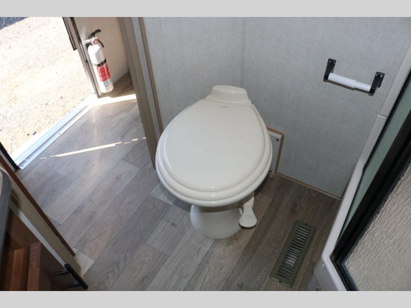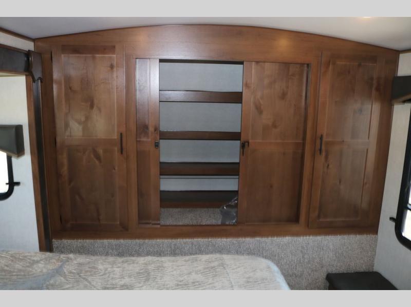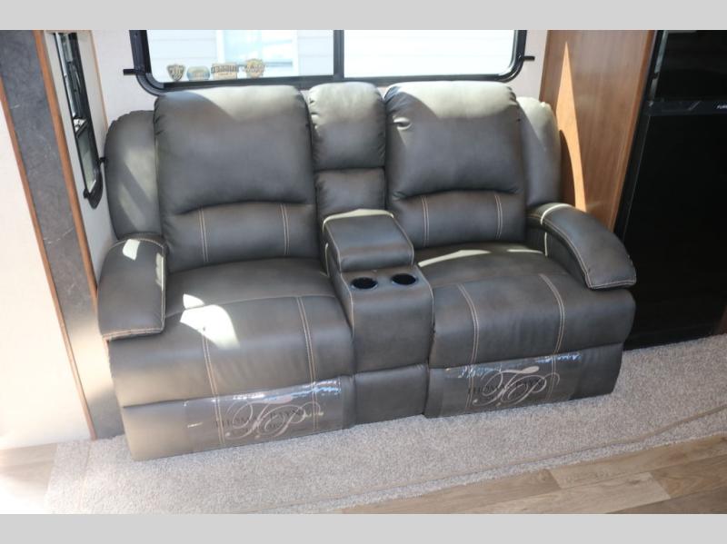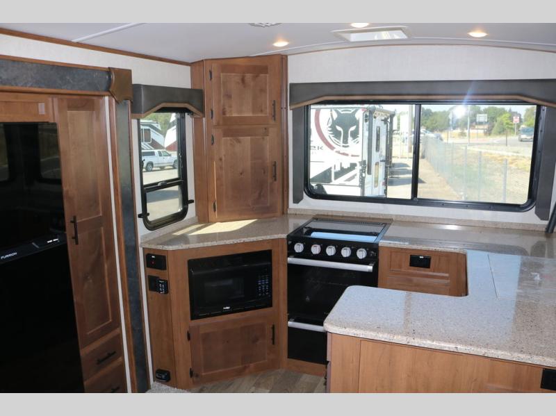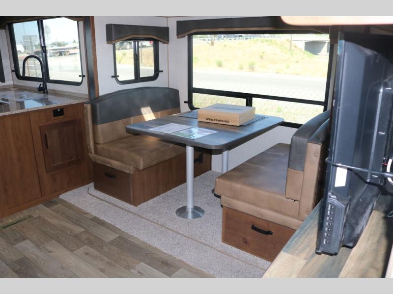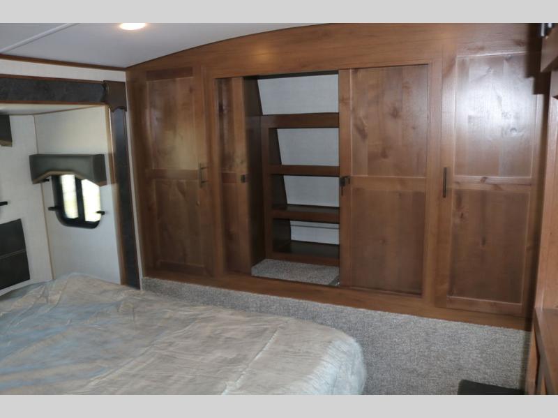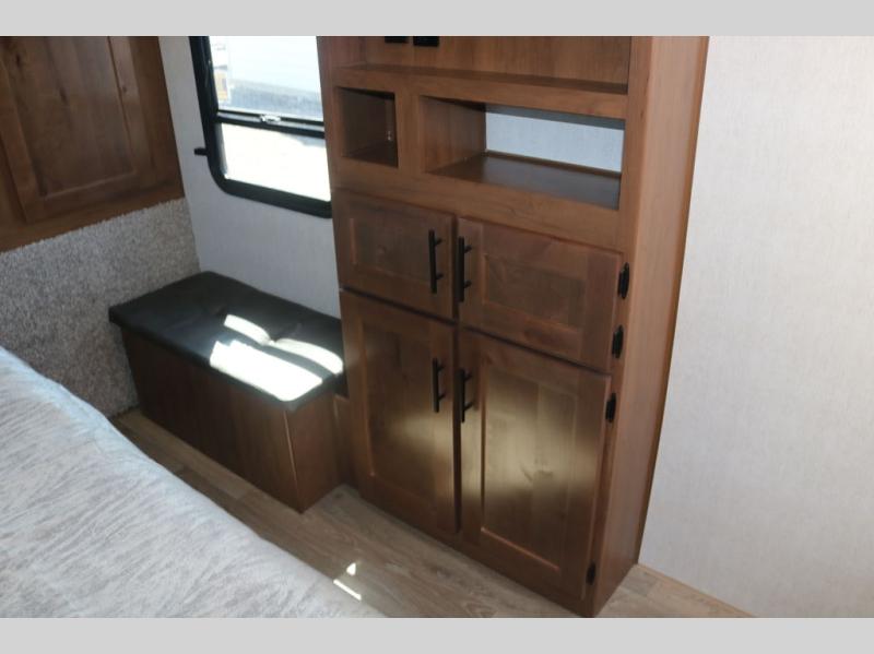 One step inside this roomy travel trailer and you'll be hooked! Your crew will love to visit in the main living area that includes dual opposing slides for tons of space, and there is a residential sofa with built-in recliners here to relax. The mountain dinette with a skylight will be the perfect place for a game of cards, and don't overlook the swing-out 40" TV here as well. This model abundant counter space in the rear kitchen and plenty of windows to take in the outdoor views as you cook. A dual entry bath is super convenient to have, and the front master bedroom will have you feeling right at home. Here, you'll find a queen bed slide out, a large front closet, plus a bench hamper to keep your space tidy.