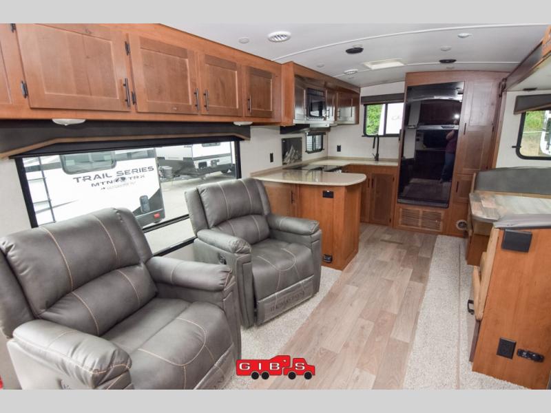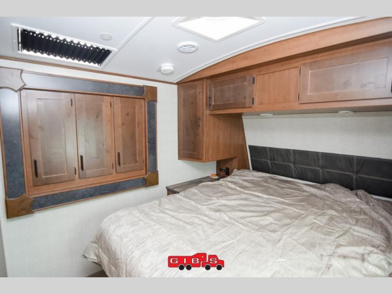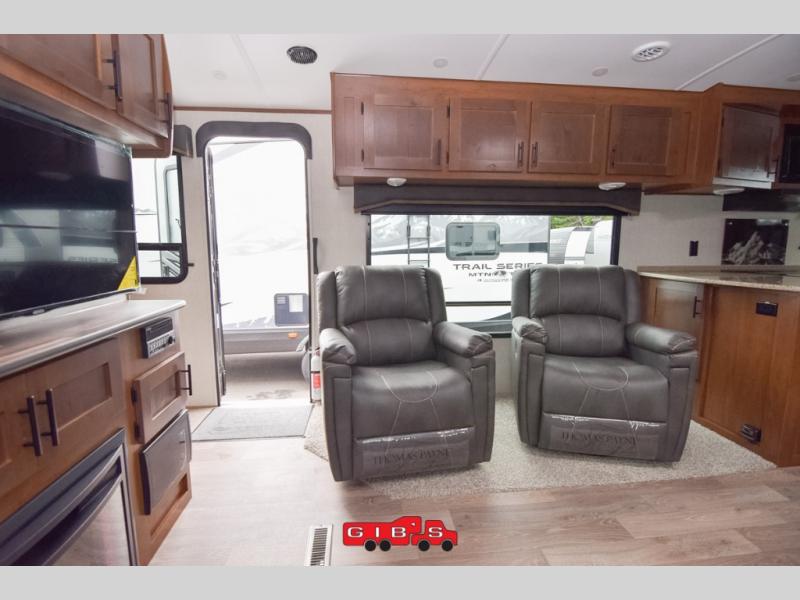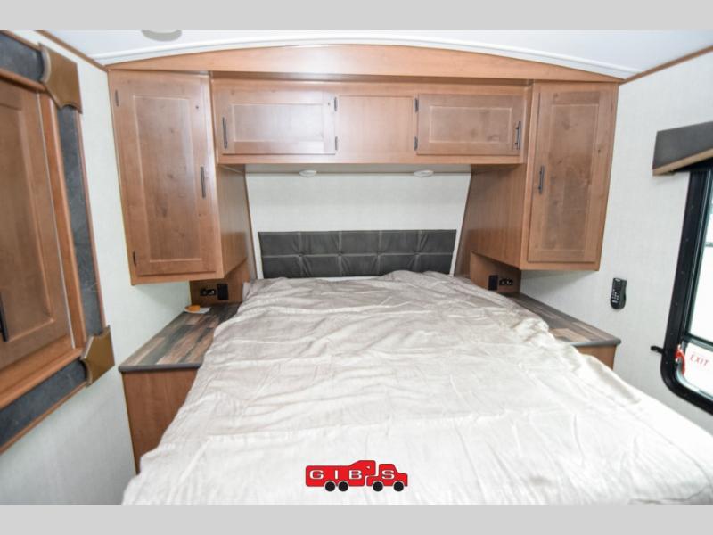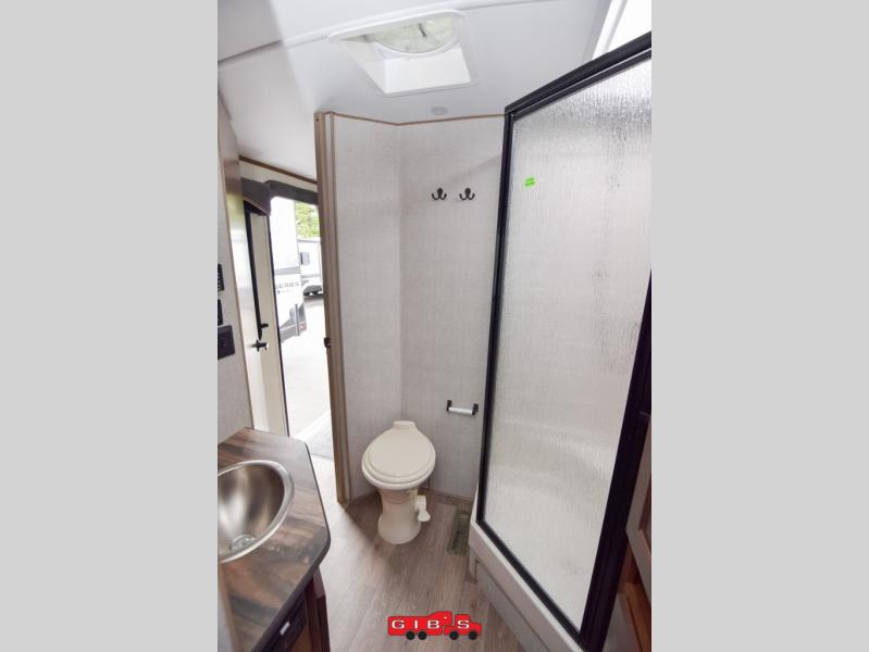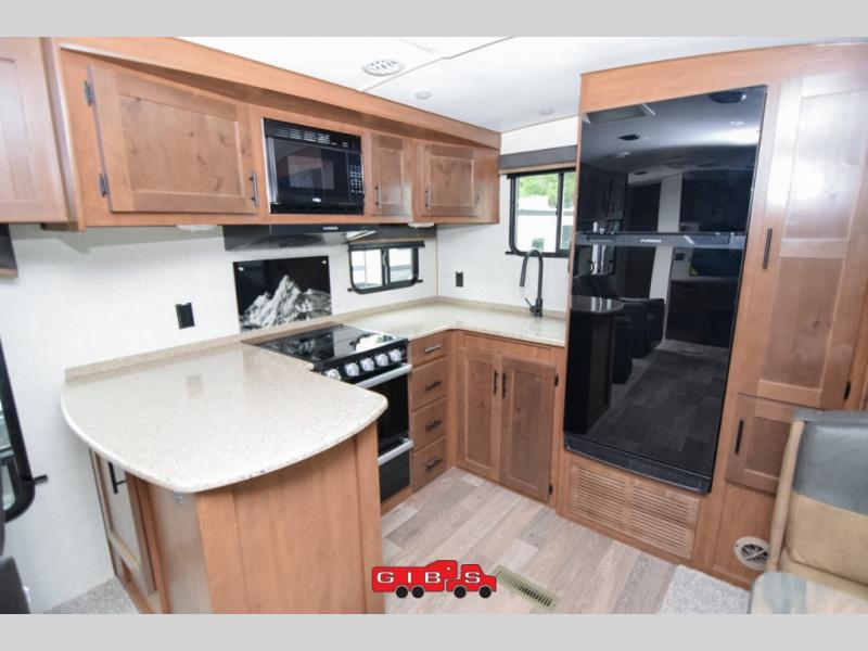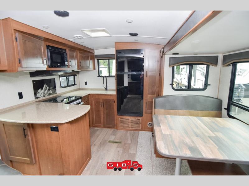 It's time to upgrade your travel trailer with a unit with more space and comfort, and this is the one! The rear kitchen includes a pantry next to the refrigerator so you can easily grab your ingredients for home-cooked meals, and the skylight over the dinette will let natural light in as the kids play a game. There are dual lounge recliners and a sleeper sofa in great view of the entertainment center, so you don't miss out on your favorite shows! You're going to love the front master bedroom that includes added room at the end of the bed so you can get dressed each morning with plenty of space, and the dual entry bath with a skylight is an added feature you won't want to camp without!