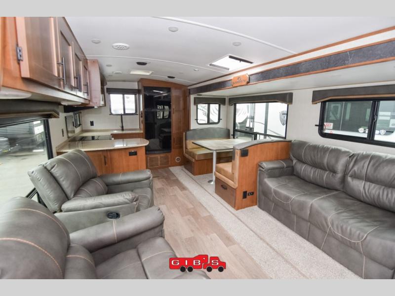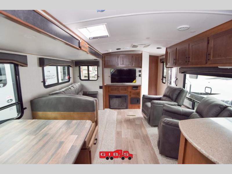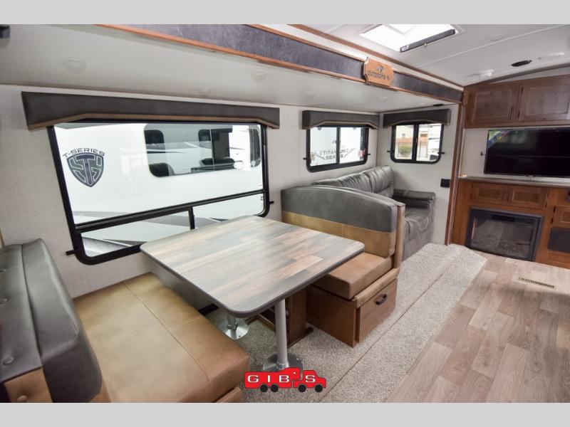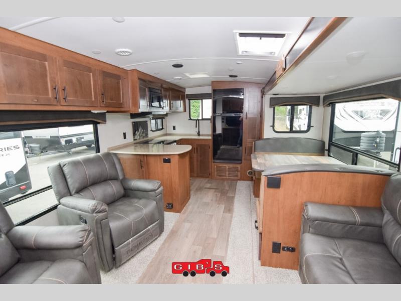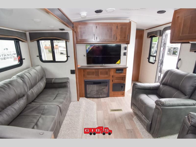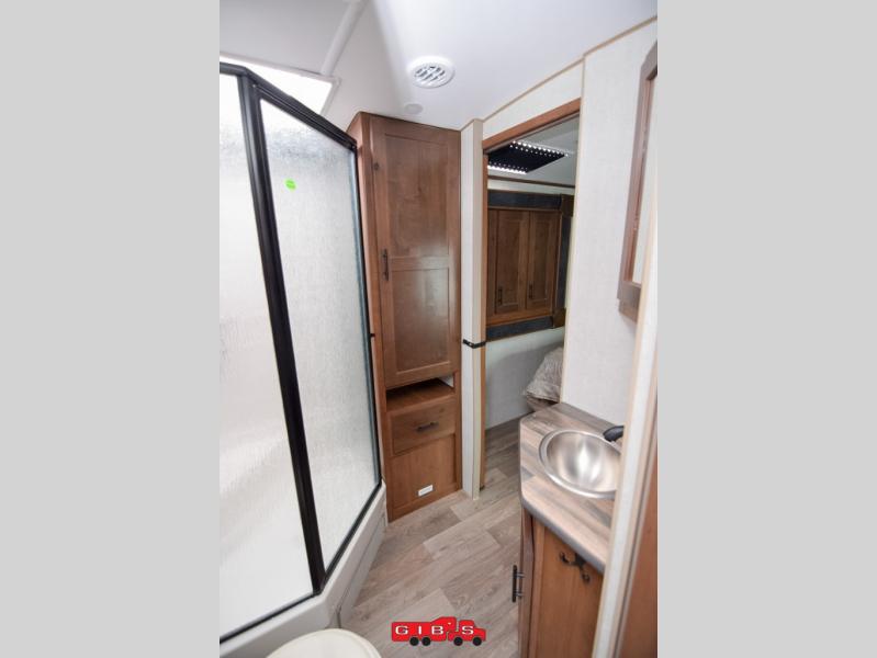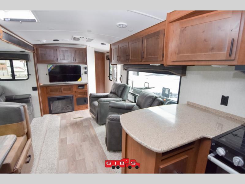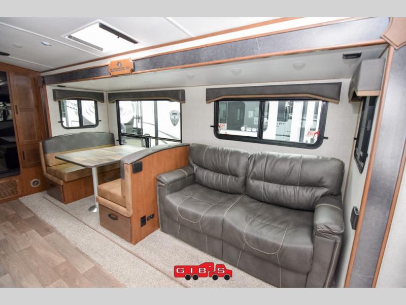 It's time to upgrade your travel trailer with a unit with more space and comfort, and this is the one! The rear kitchen includes a pantry next to the refrigerator so you can easily grab your ingredients for home-cooked meals, and the skylight over the dinette will let natural light in as the kids play a game. There are dual lounge recliners and a sleeper sofa in great view of the entertainment center, so you don't miss out on your favorite shows! You're going to love the front master bedroom that includes added room at the end of the bed so you can get dressed each morning with plenty of space, and the dual entry bath with a skylight is an added feature you won't want to camp without!
