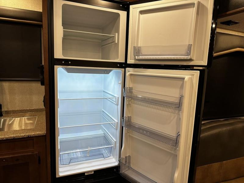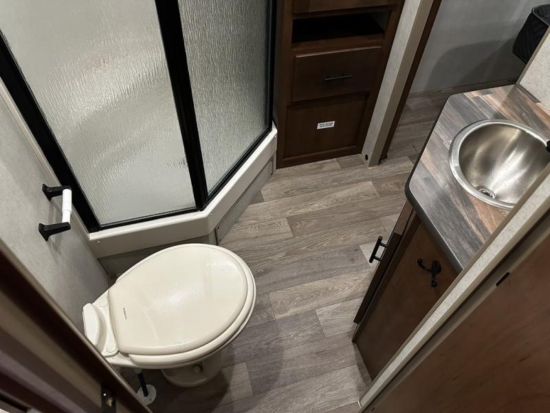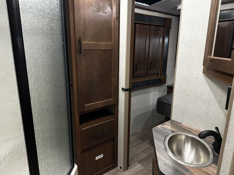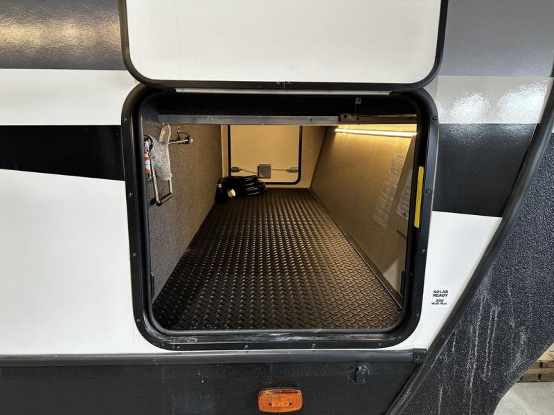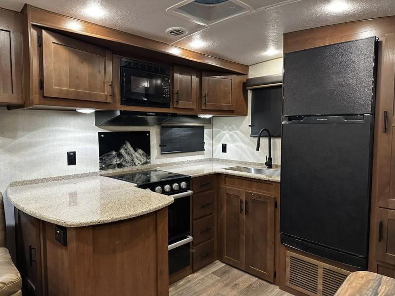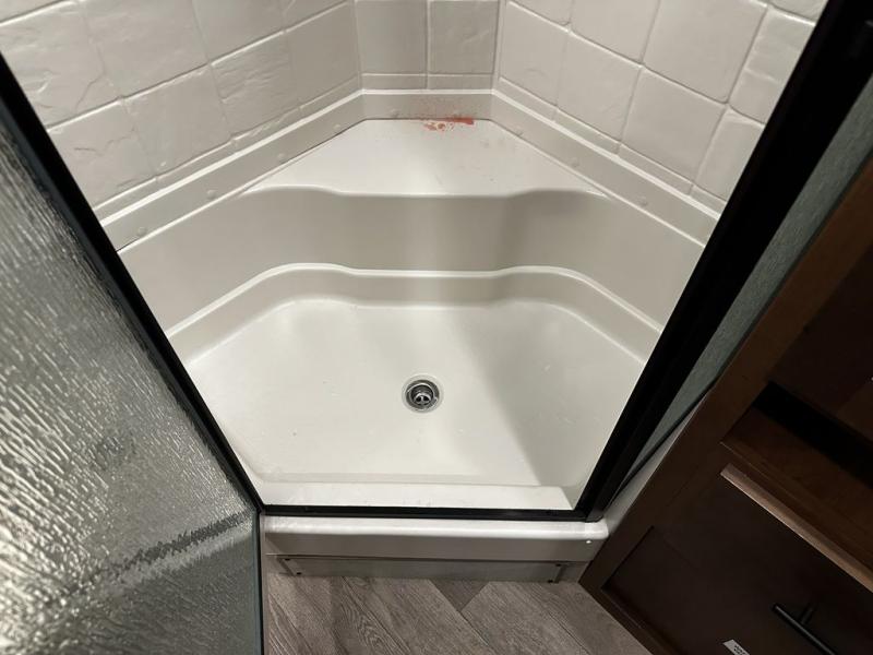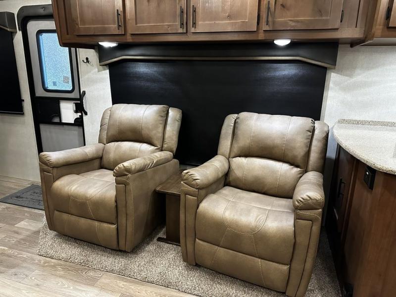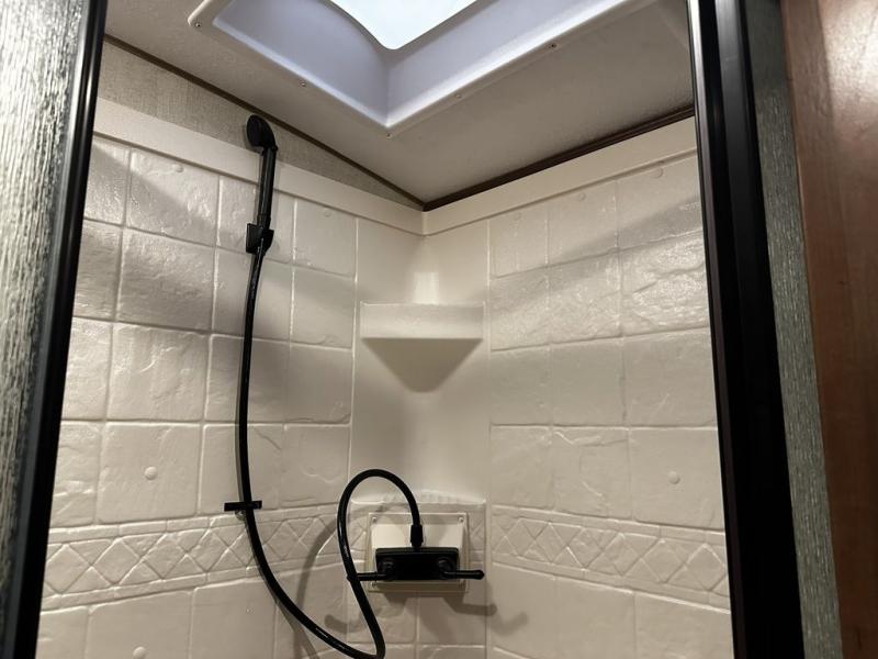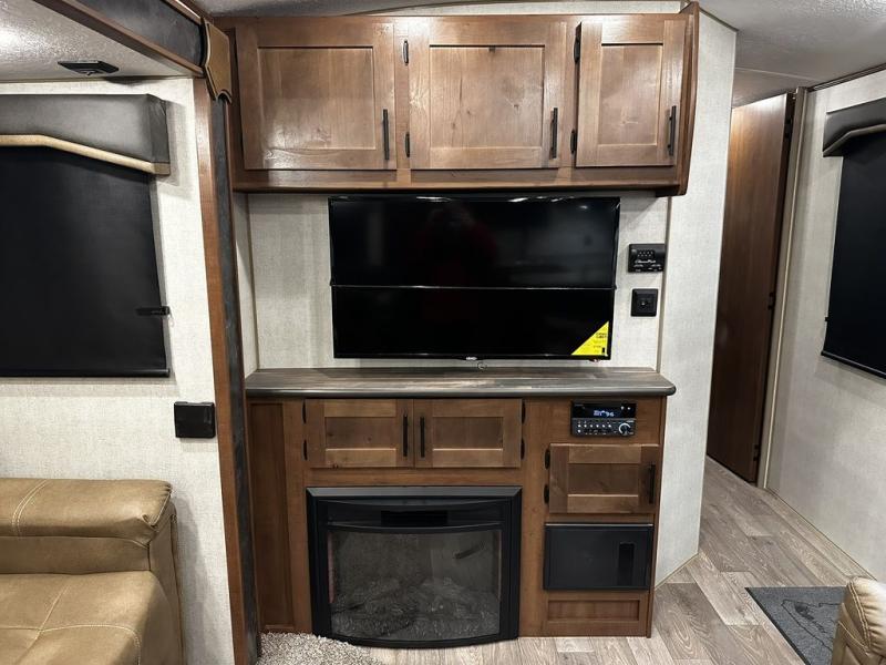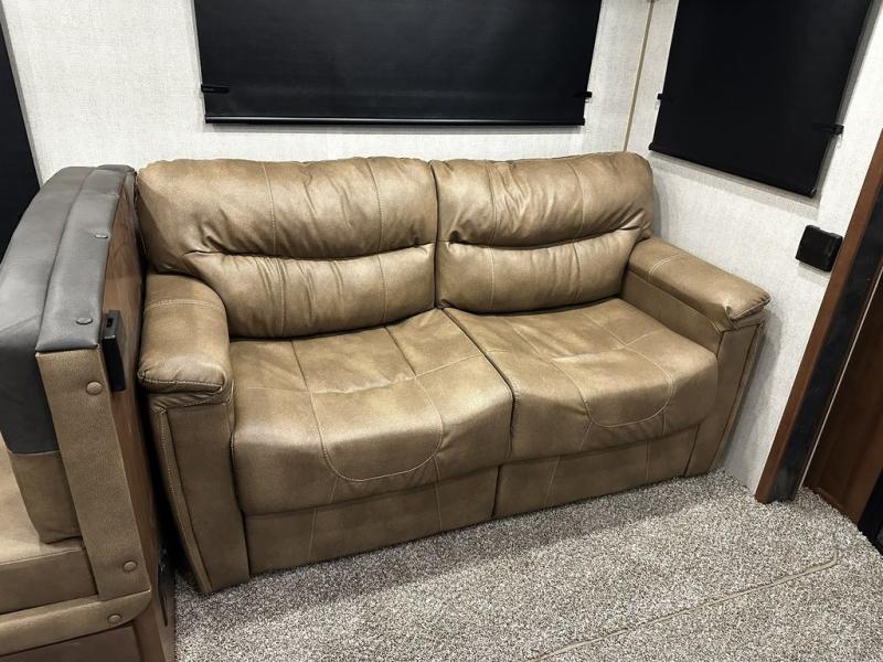 It's time to upgrade your travel trailer with a unit with more space and comfort, and this is the one! The rear kitchen includes a pantry next to the refrigerator so you can easily grab your ingredients for home-cooked meals, and the skylight over the dinette will let natural light in as the kids play a game. There are dual lounge recliners and a sleeper sofa in great view of the entertainment center, so you don't miss out on your favorite shows! You're going to love the front master bedroom that includes added room at the end of the bed so you can get dressed each morning with plenty of space, and the dual entry bath with a skylight is an added feature you won't want to camp without!