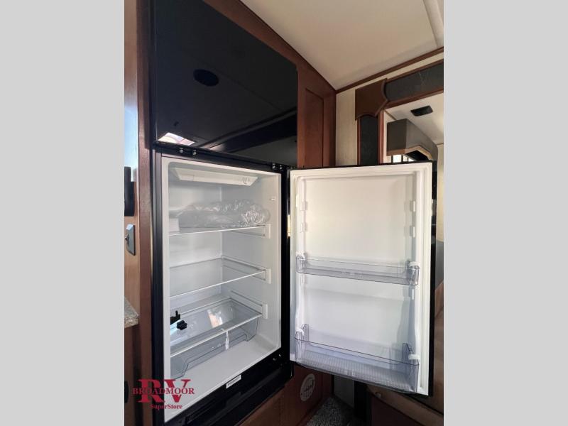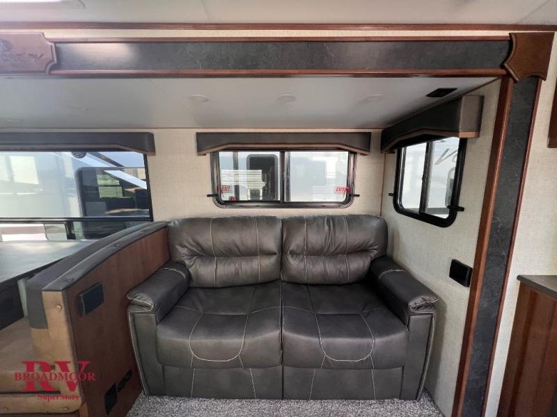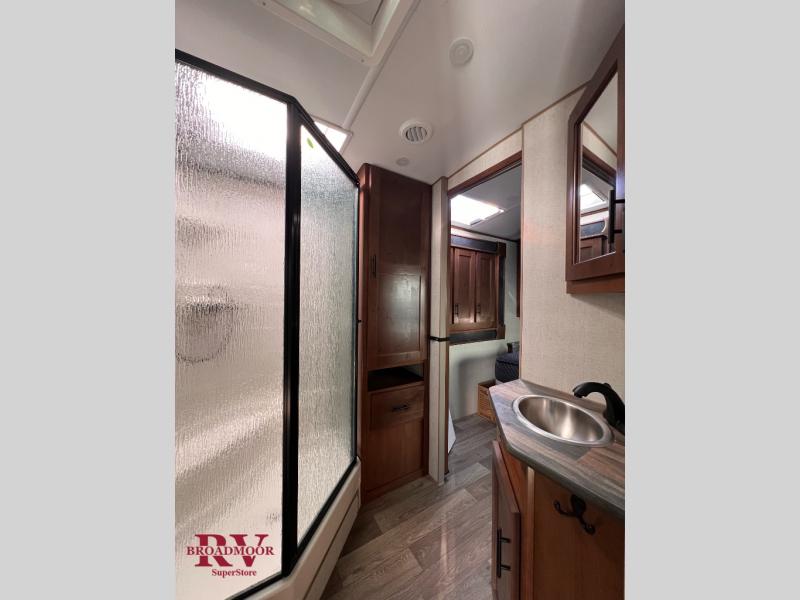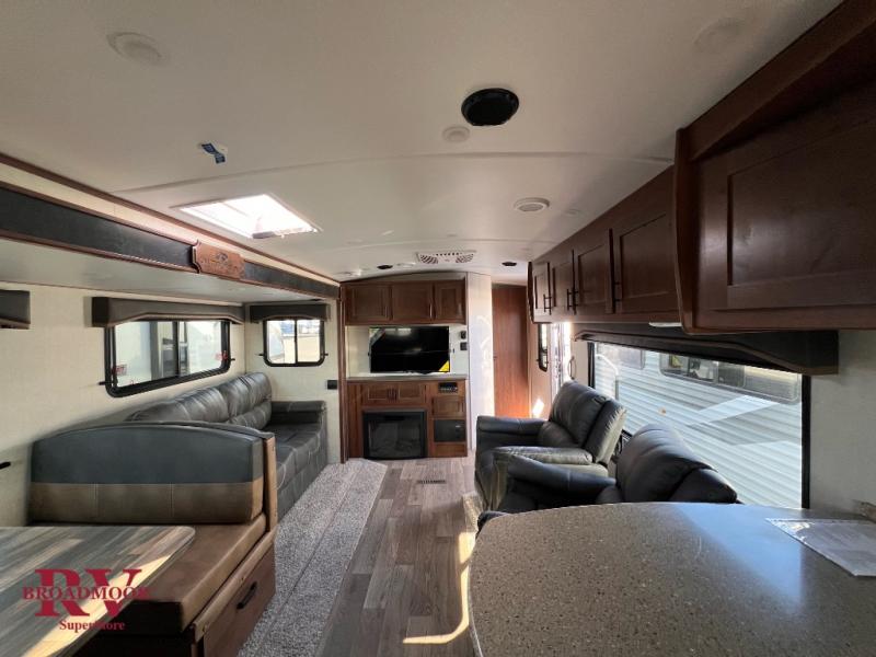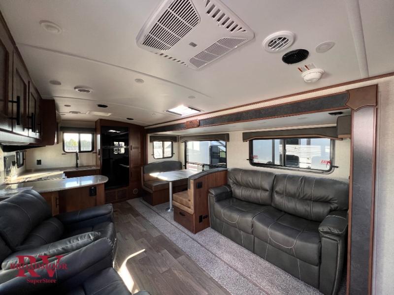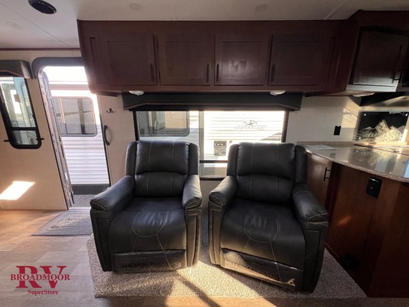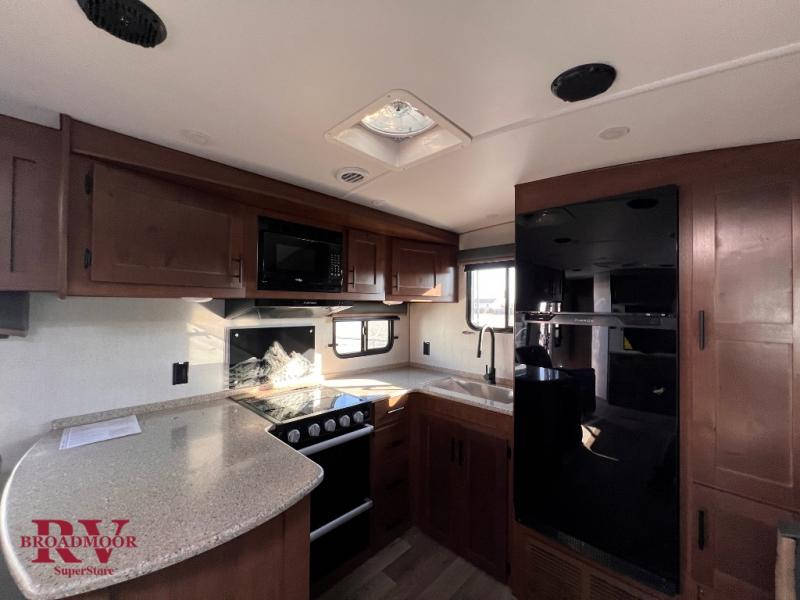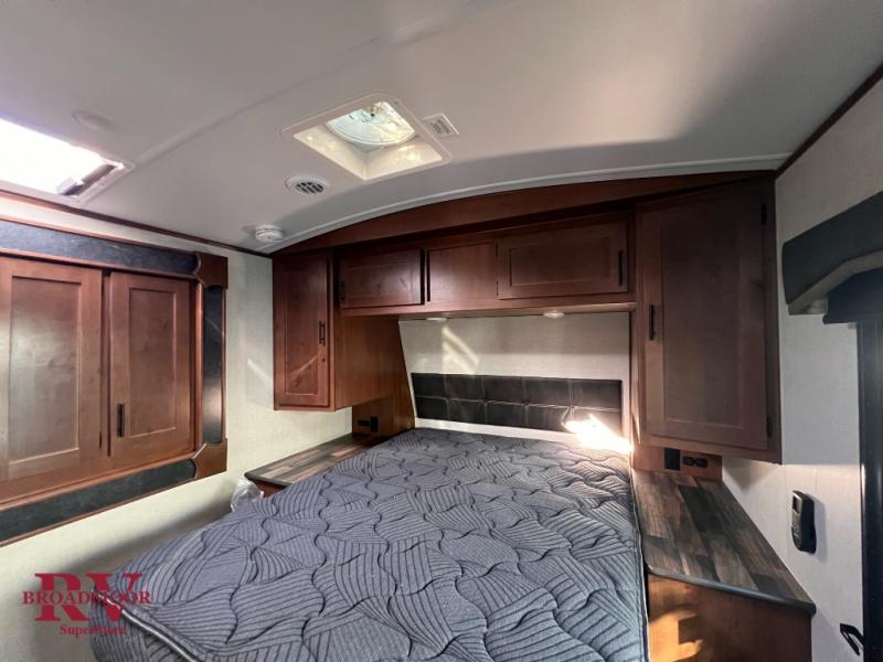 It's time to upgrade your travel trailer with a unit with more space and comfort, and this is the one! The rear kitchen includes a pantry next to the refrigerator so you can easily grab your ingredients for home-cooked meals, and the skylight over the dinette will let natural light in as the kids play a game. There are dual lounge recliners and a sleeper sofa in great view of the entertainment center, so you don't miss out on your favorite shows! You're going to love the front master bedroom that includes added room at the end of the bed so you can get dressed each morning with plenty of space, and the dual entry bath with a skylight is an added feature you won't want to camp without!