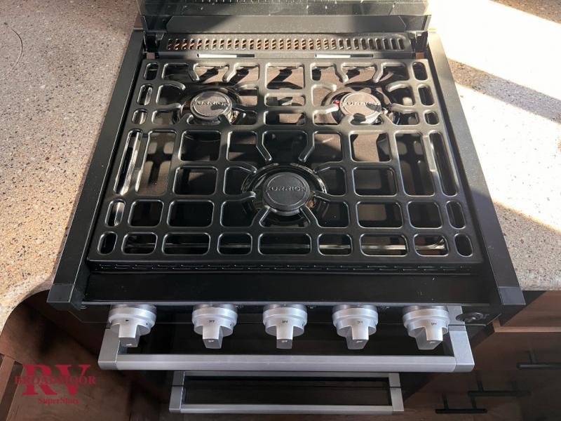 Optional Equipment Installed On This Unit: Mtn. Storage System, Living Room Fireplace, 12V Heat Pad, 50AMP Service, Dual Power Stab Jacks, Premium Mattress, Off-Grid Battery Rack, Deluxe Power Vent Fans (Bed, Bath, Kitchen)