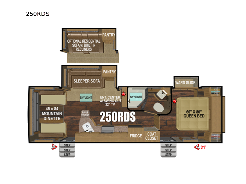 This dual entry travel trailer will be perfect for your trips to the mountains. The rear mountain dinette includes a large window for outdoor views, and you'll find additional seating space on the sleeper sofa. The chef of your group can work up their magic in the full kitchen that includes a sunken range and a flip-up counter for more counter space. Within the front private bedroom you'll find a queen bed, wardrobes on either side of the bed, plus a wardrobe slide for more space and storage.