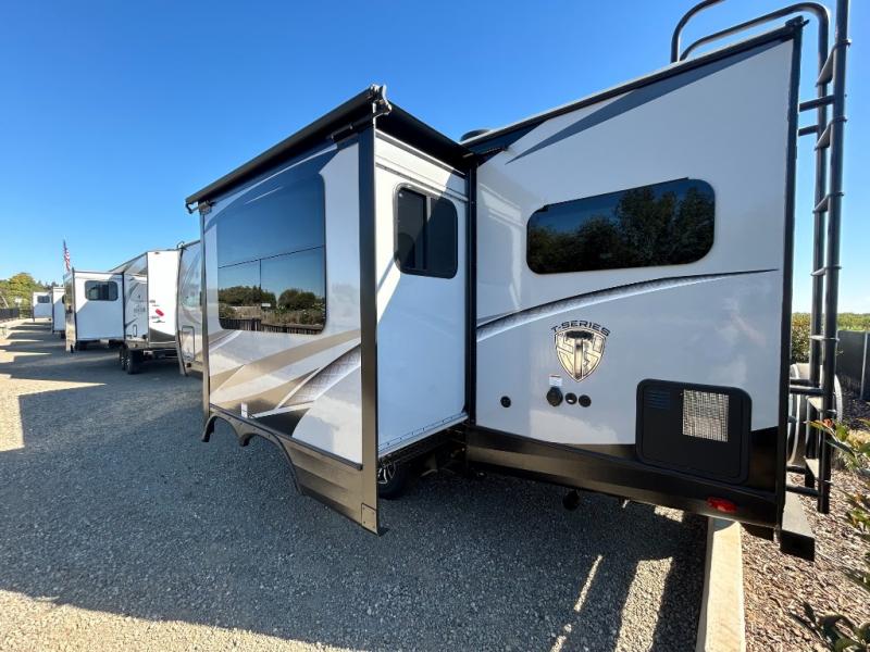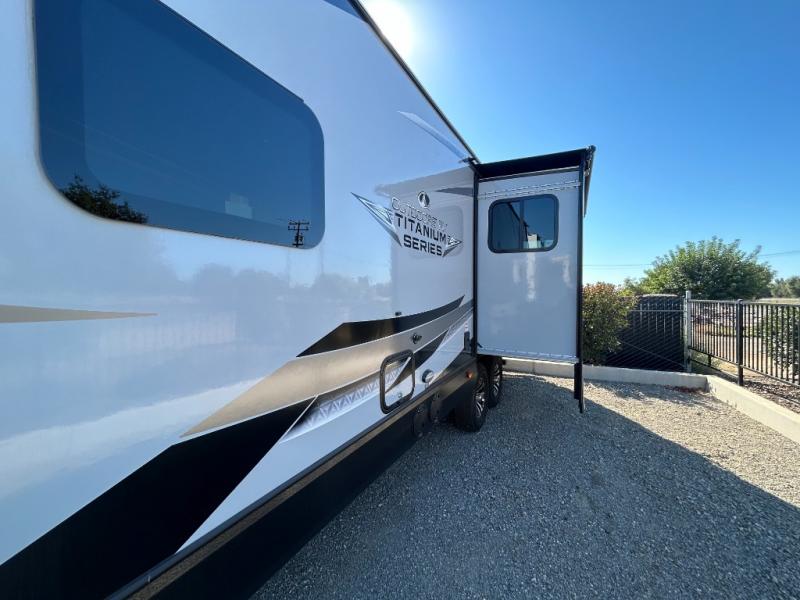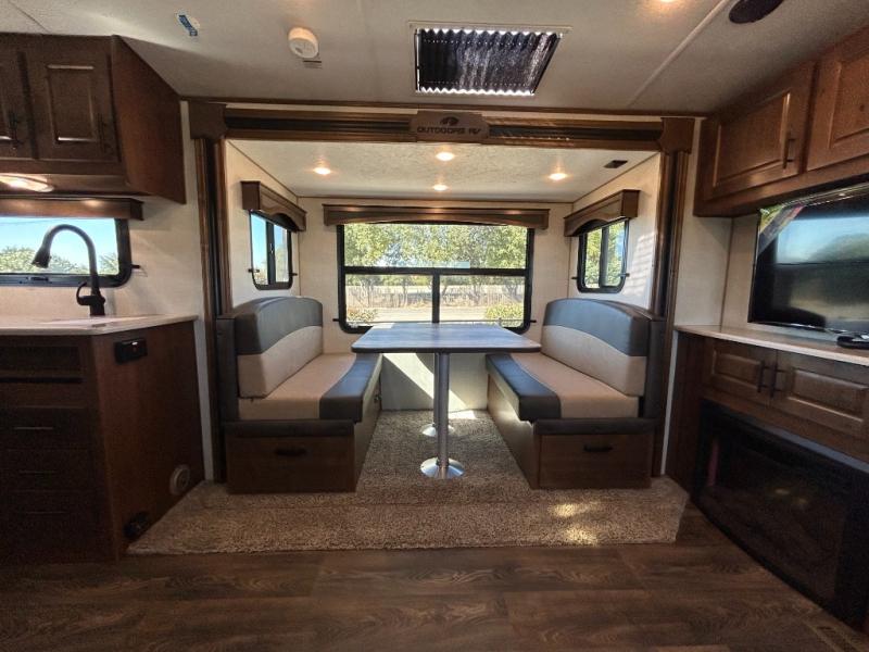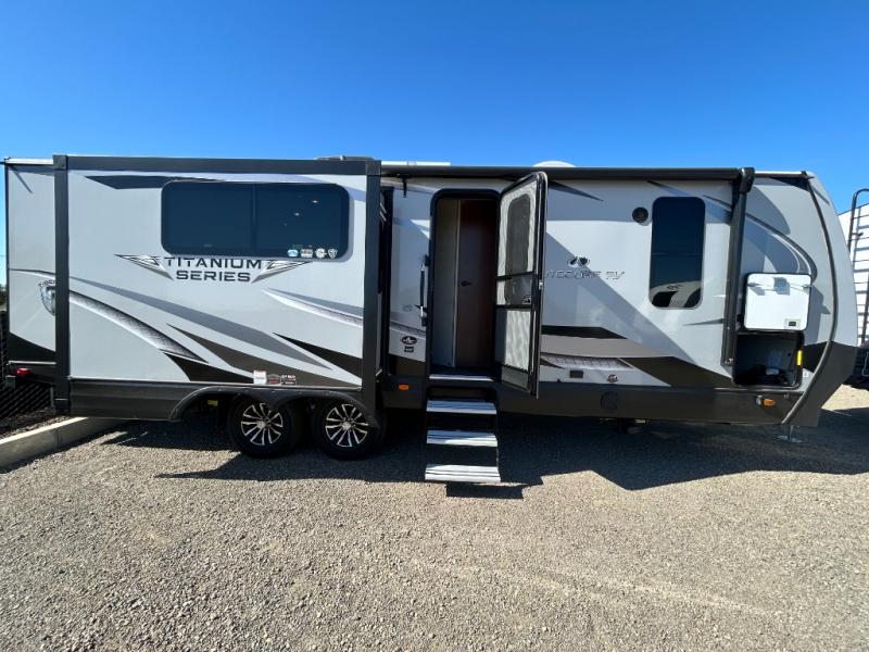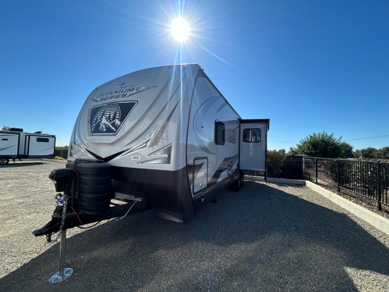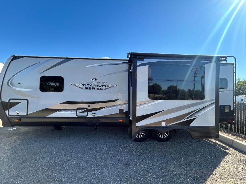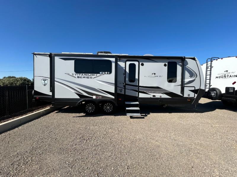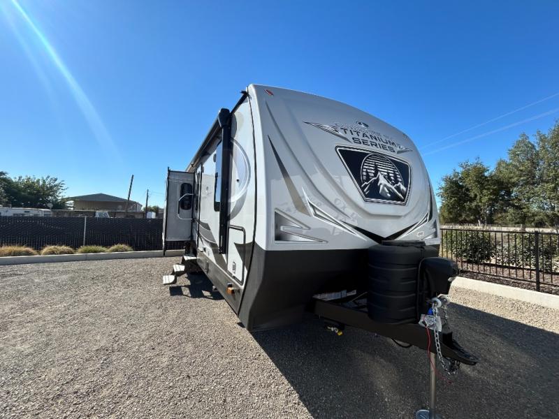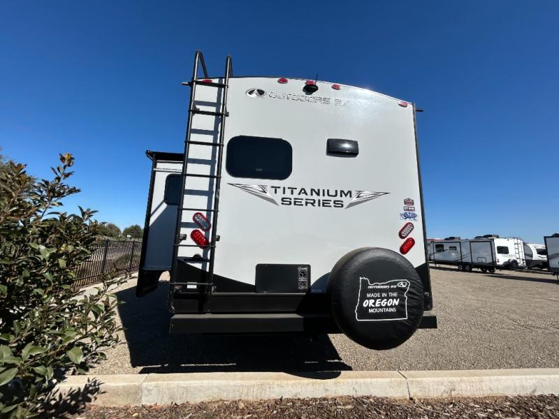 With any Black Stone Titanium Series travel trailer by Outdoors RV you will enjoy the sleek design frameless thermal pane windows, along with the silver fiberglass front cap and Titanium Series graphics package. The rugged 8' chassis with 5,200 lb. axles and XL ground clearance will make maneuvering tougher terrain easier than ever, and there is a ground control TT auto leveling system for hassle-free set-up. Each model includes LG solid surface countertops, mountain lodge interiors, hardwood slide out fascia(s), and many more comforts!
