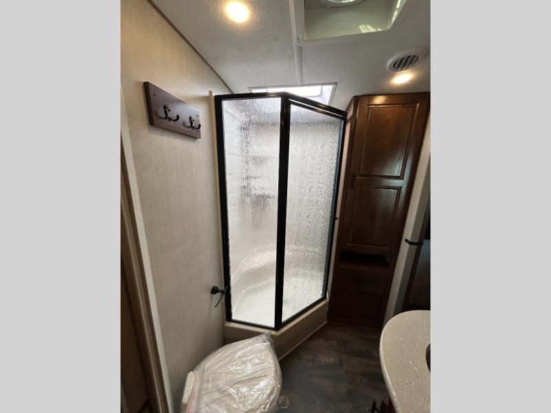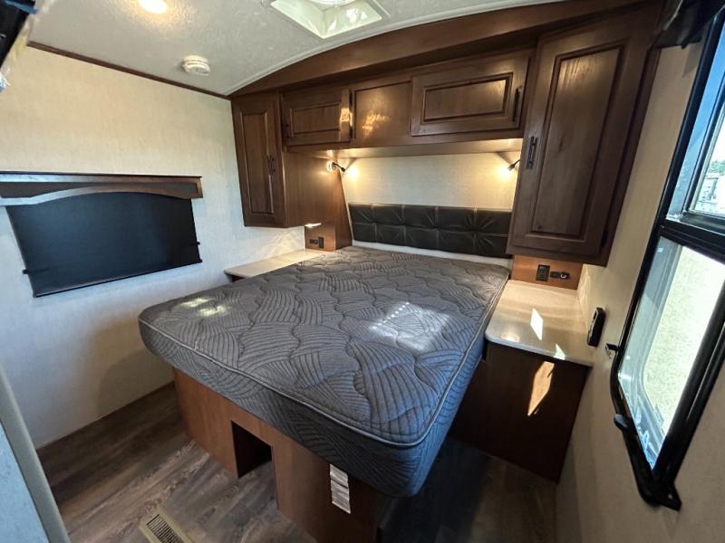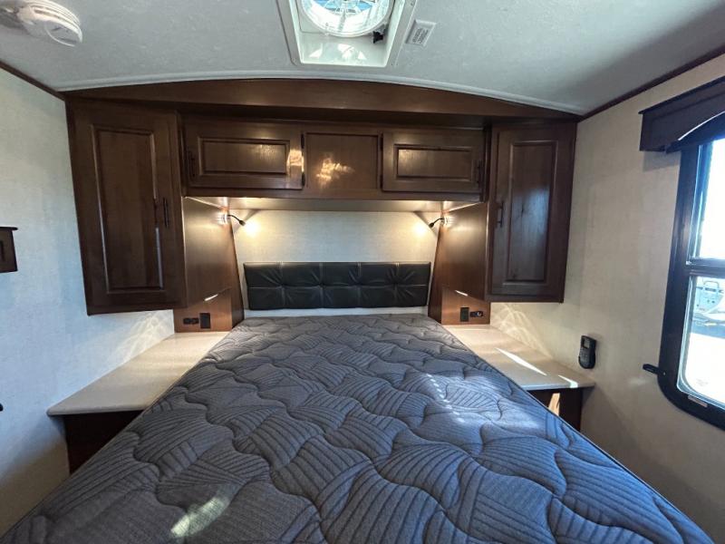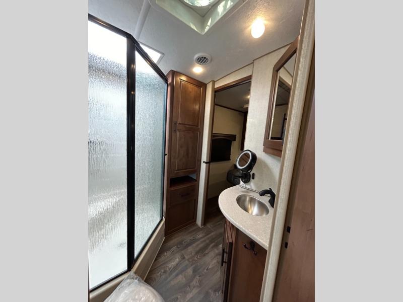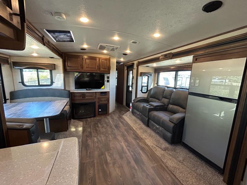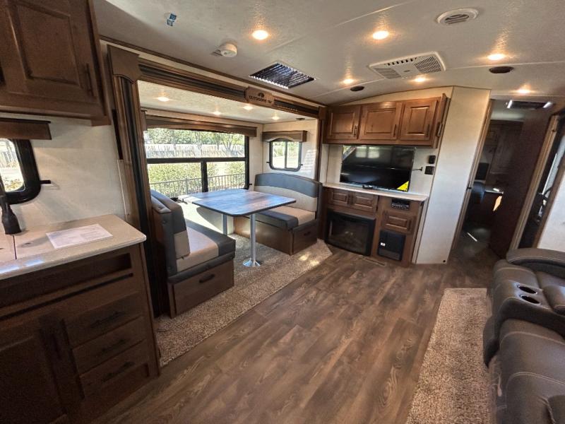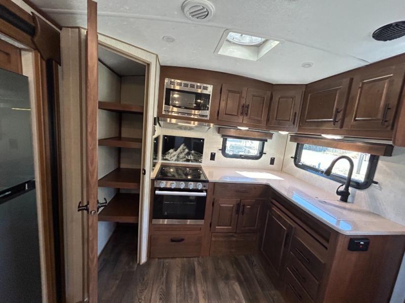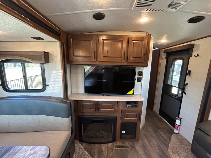 Enjoy added space in this travel trailer with dual opposing slides in the main living area. Your crew can visit on the residential sofa with built-in recliners or play a game at the mountain dinette while the chef whips up dinner in the rear kitchen. A spacious dual entry bath will allow you to clean up after your adventures, and a front master bedroom will have you feeling right at home. This model also includes a swing-out 40" TV in the main living area so rainy days can be spent watching movies!