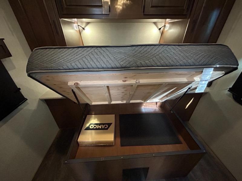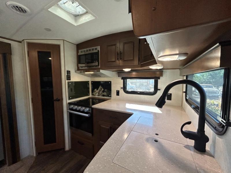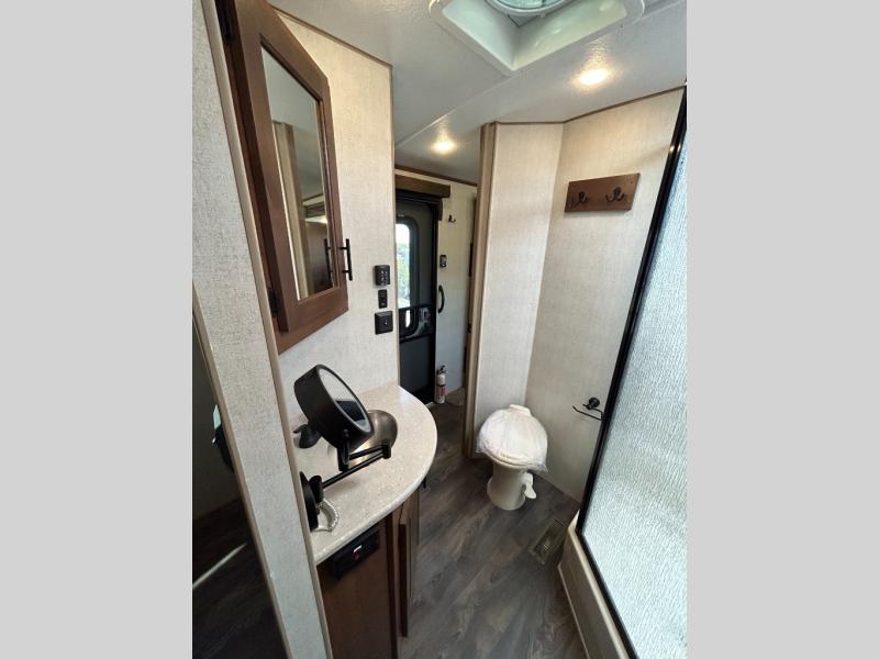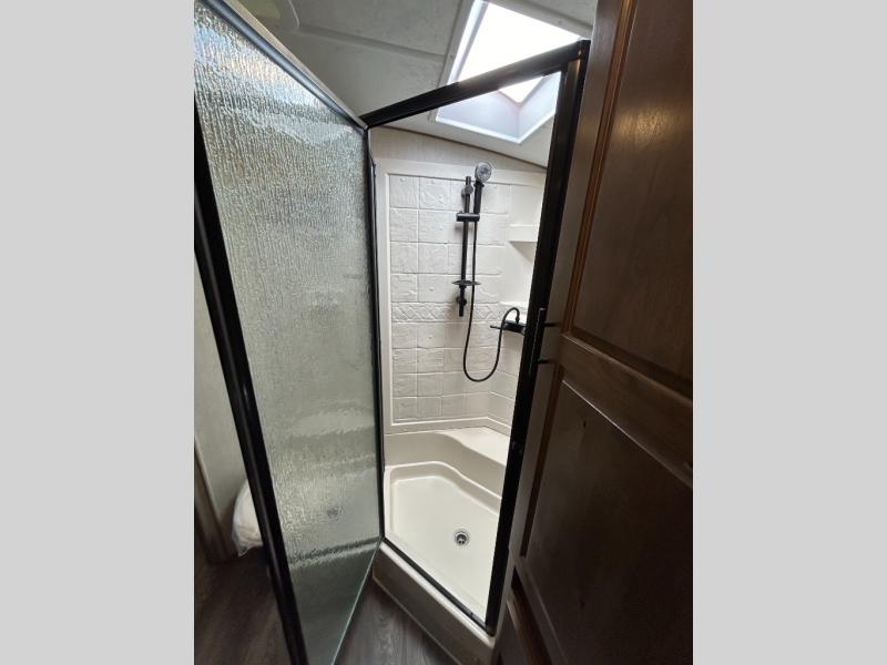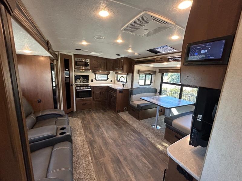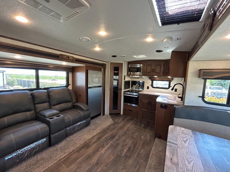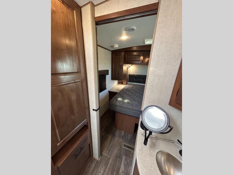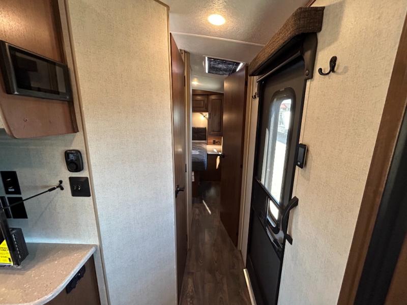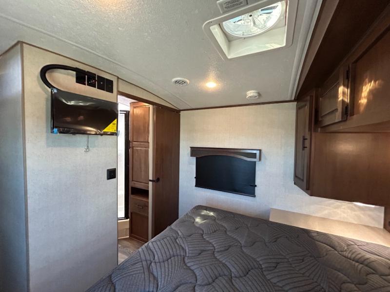 Enjoy added space in this travel trailer with dual opposing slides in the main living area. Your crew can visit on the residential sofa with built-in recliners or play a game at the mountain dinette while the chef whips up dinner in the rear kitchen. A spacious dual entry bath will allow you to clean up after your adventures, and a front master bedroom will have you feeling right at home. This model also includes a swing-out 40" TV in the main living area so rainy days can be spent watching movies!
