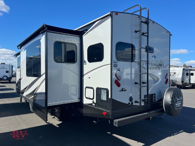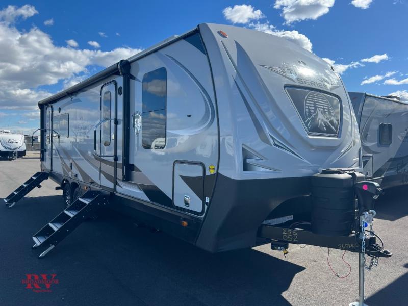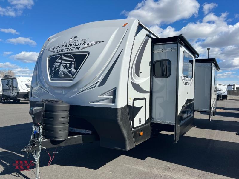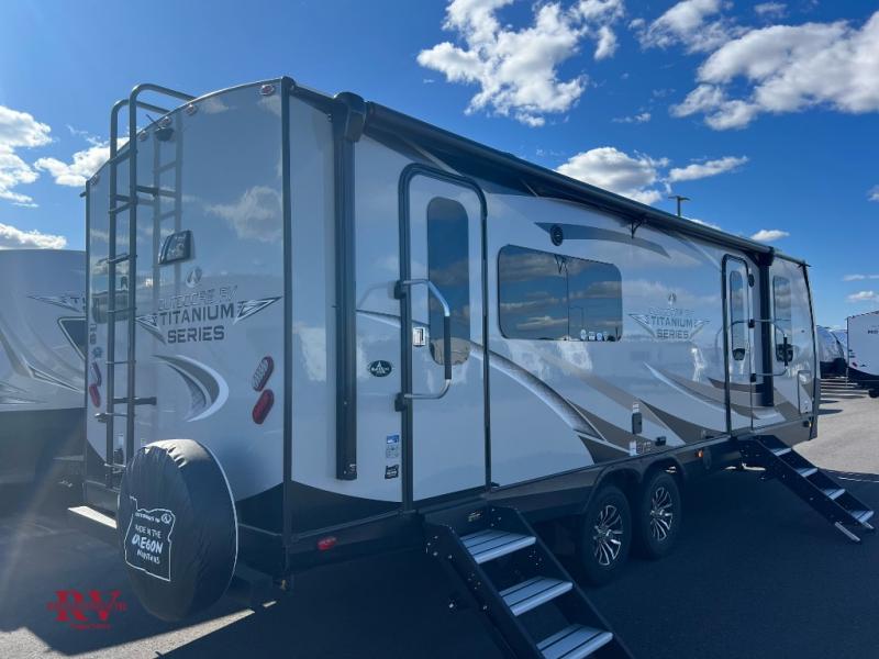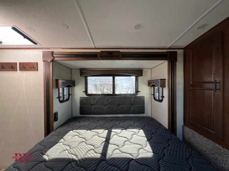 With any Black Stone Titanium Series travel trailer by Outdoors RV you will enjoy the sleek design frameless thermal pane windows, along with the silver fiberglass front cap and Titanium Series graphics package. The rugged 8' chassis with 5,200 lb. axles and XL ground clearance will make maneuvering tougher terrain easier than ever, and there is a ground control TT auto leveling system for hassle-free set-up. Each model includes LG solid surface countertops, mountain lodge interiors, hardwood slide out fascia(s), and many more comforts!