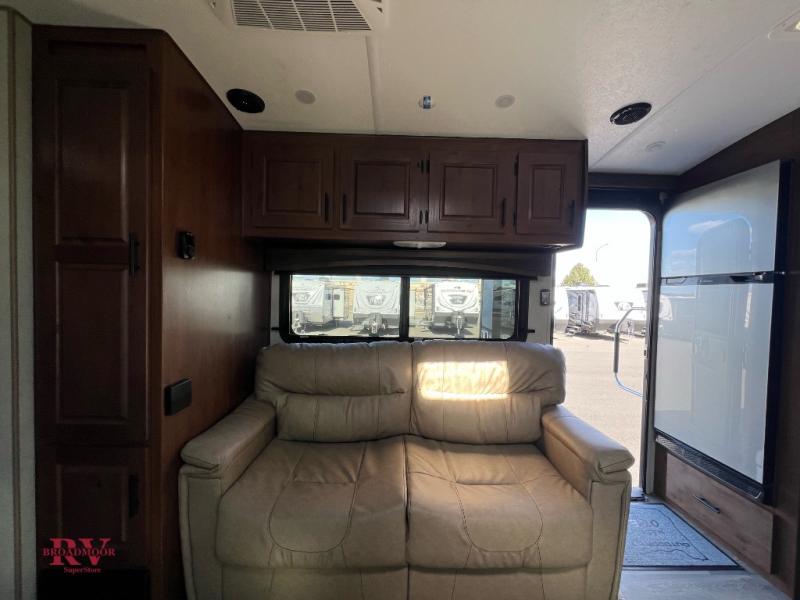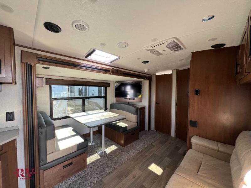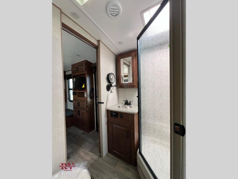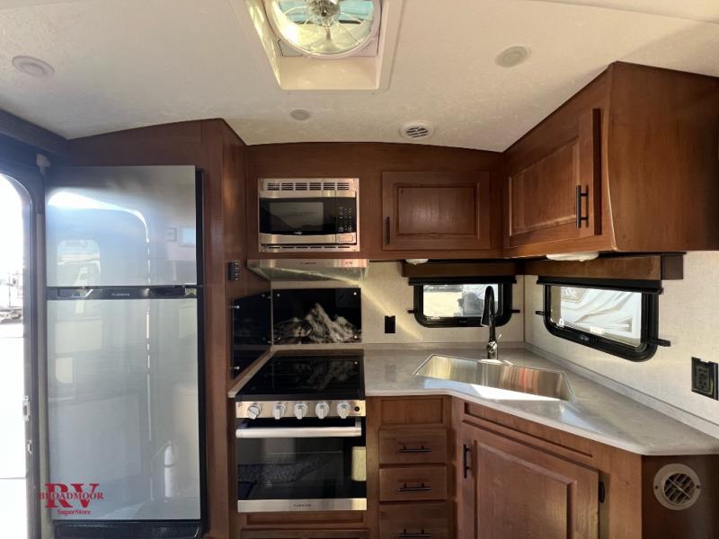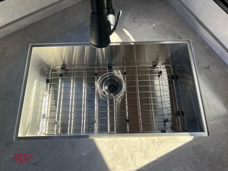 This rear kitchen travel trailer is made spacious thanks to the mountain dinette slide out in the main living area and the queen bed slide out in the front bedroom. You will also find a bench hamper and front wardrobe in the bedroom, along with your own exterior entry door. A sleeper sofa provides more sleeping space in the middle living room and the 40" TV will let you enjoy movie nights. And don't overlook the rear kitchen with plenty of counter space, a farm sink, and a sunken range with a glass front.