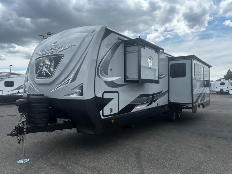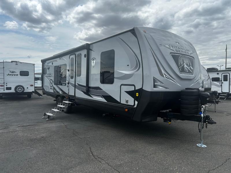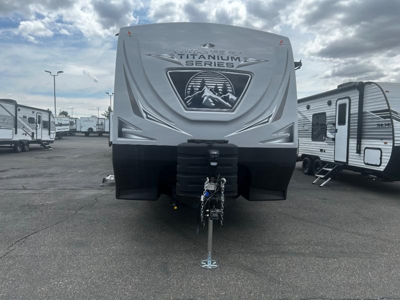 With any Black Stone Titanium Series travel trailer by Outdoors RV you will enjoy the sleek design frameless thermal pane windows, along with the silver fiberglass front cap and Titanium Series graphics package. The rugged 8' chassis with 5,200 lb. axles and XL ground clearance will make maneuvering tougher terrain easier than ever, and there is a ground control TT auto leveling system for hassle-free set-up. Each model includes LG solid surface countertops, mountain lodge interiors, hardwood slide out fascia(s), and many more comforts!