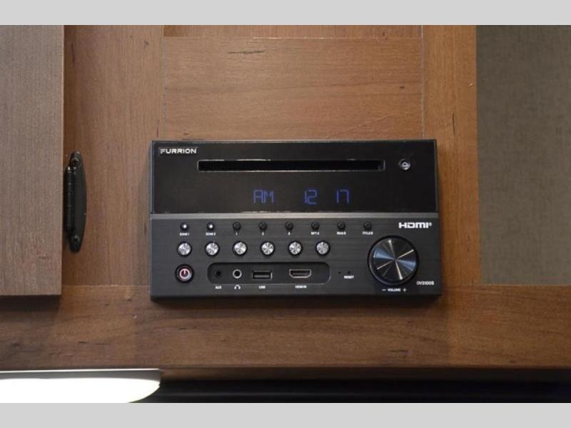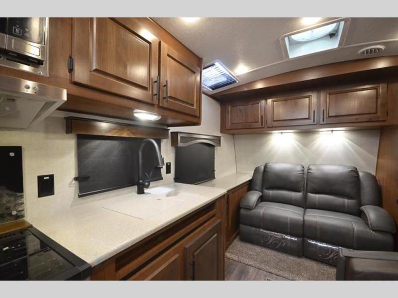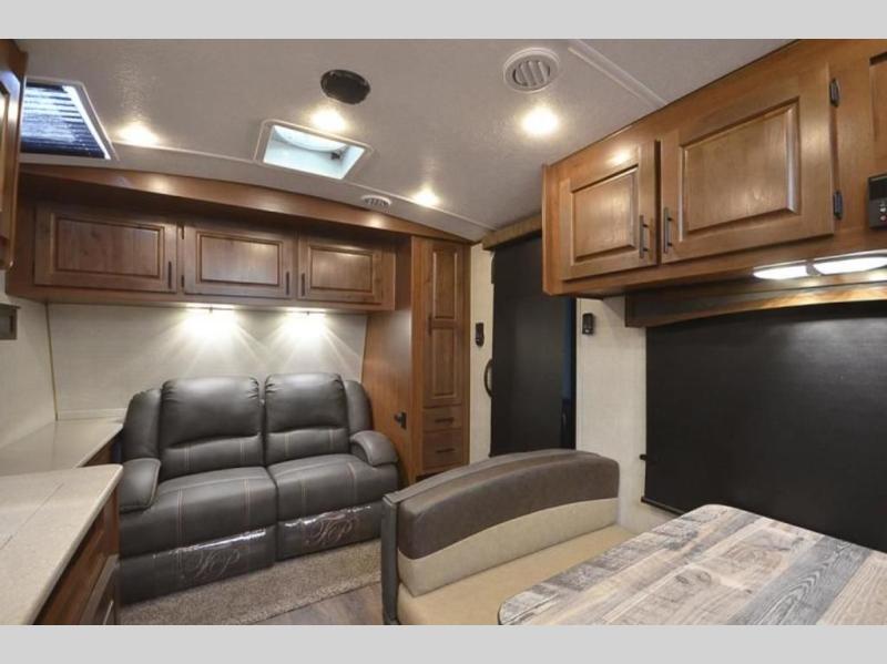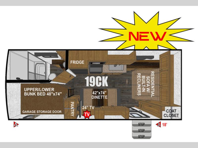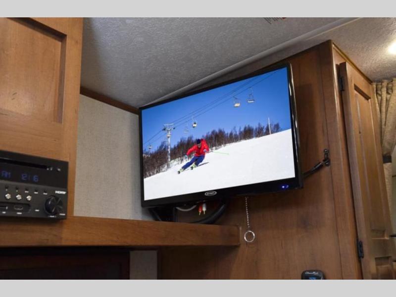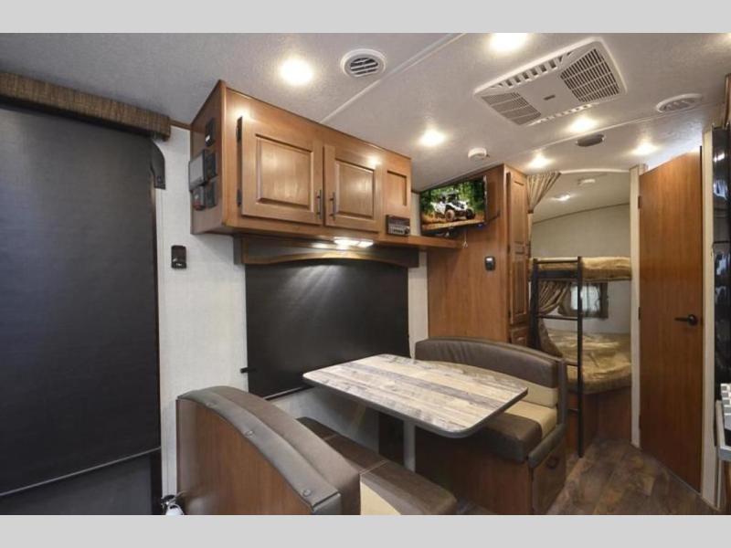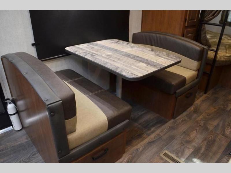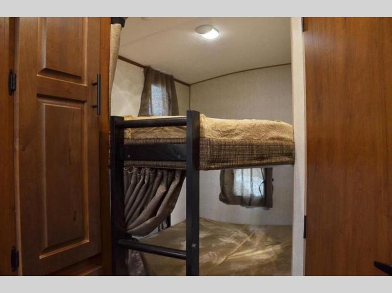 There is a lot packed into this smaller sized travel trailer! The double-size bunk beds in the back will provide fun sleeping space, and there is an exterior garage storage door where you can pack in gear directly under the bunks. The combined kitchen and living area includes a residential sofa with built-in recliners. There is also a 42" x 74" dinette table with a 24" TV to watch your favorite movies on when you aren't playing games or enjoying a meal at the dinette. Freshen up each morning in the rear corner bathroom conveniently next to the bunk beds!