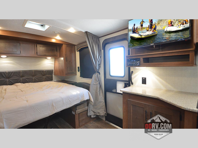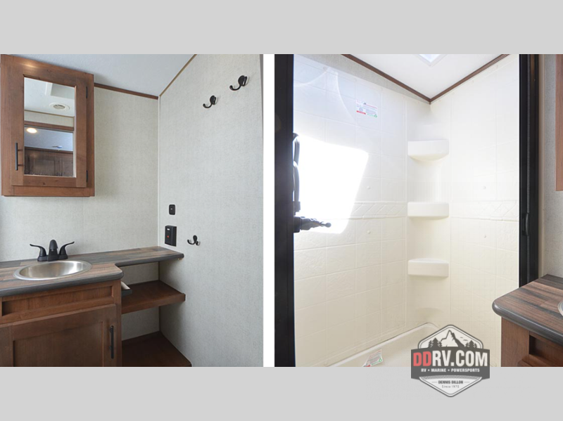 Versatility and comfort is found in this spacious travel trailer. There is a queen Murphy bed up front that can fold away into the wall so you can dine at the fold down booth dinette. The residential sofa with built-in recliners will be the perfect place to relax as you watch a movie on the swing out 32" TV, and the single slide out here will provide more interior space. This model includes a rear corner kitchen with plenty of counter space to prep meals and the full bath is in the other rear corner for privacy. You'll also enjoy the shower skylight for more head room, plus a living area skylight for more natural light.