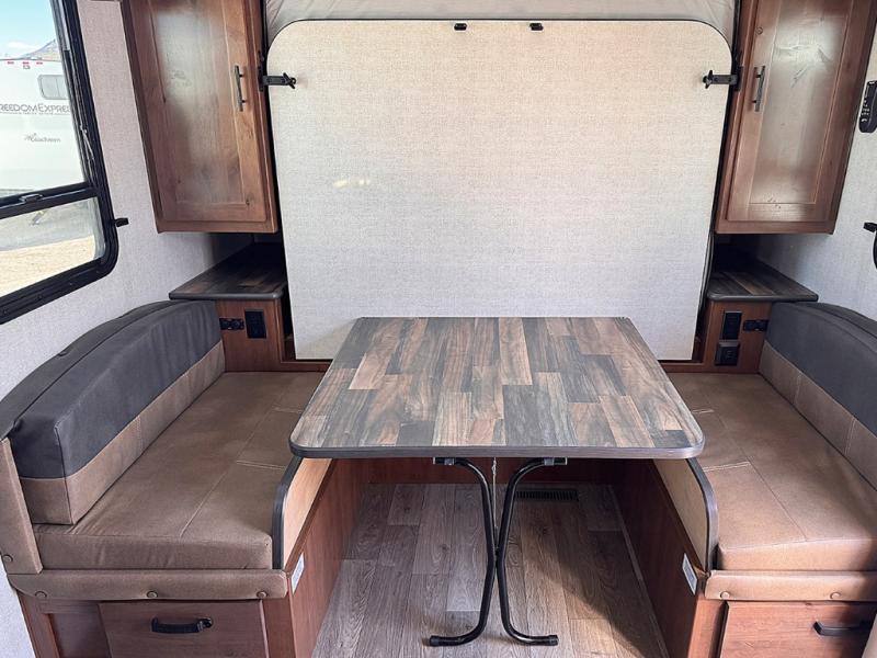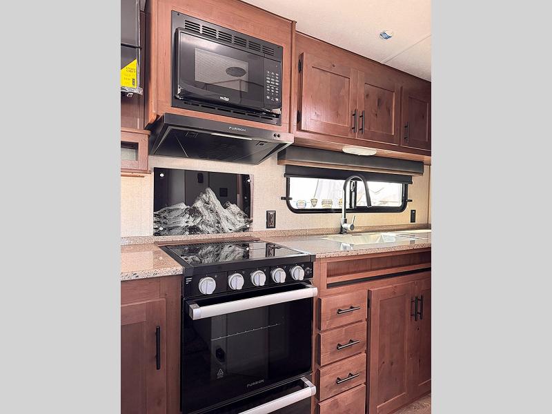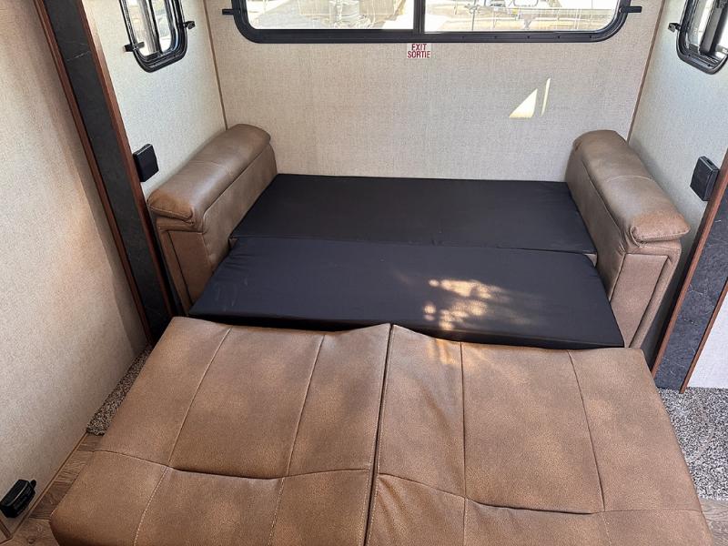 Versatility and comfort is found in this spacious travel trailer. There is a queen Murphy bed up front that can fold away into the wall so you can dine at the fold down booth dinette. The residential sofa with built-in recliners will be the perfect place to relax as you watch a movie on the swing out 32" TV, and the single slide out here will provide more interior space. This model includes a rear corner kitchen with plenty of counter space to prep meals and the full bath is in the other rear corner for privacy. You'll also enjoy the shower skylight for more head room, plus a living area skylight for more natural light.