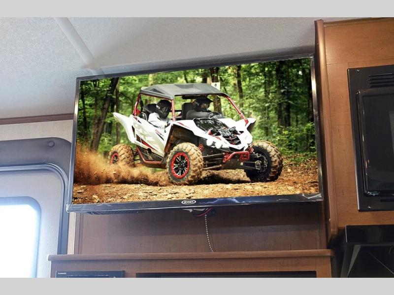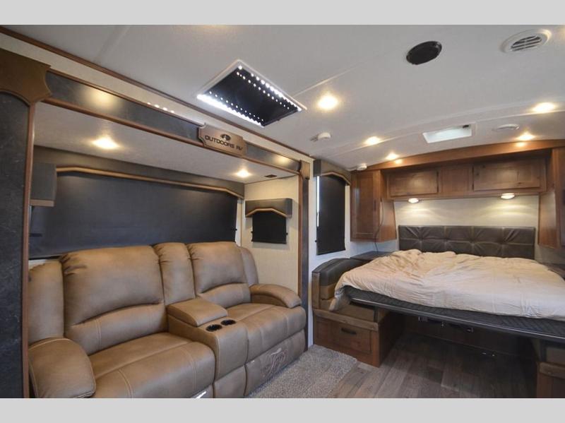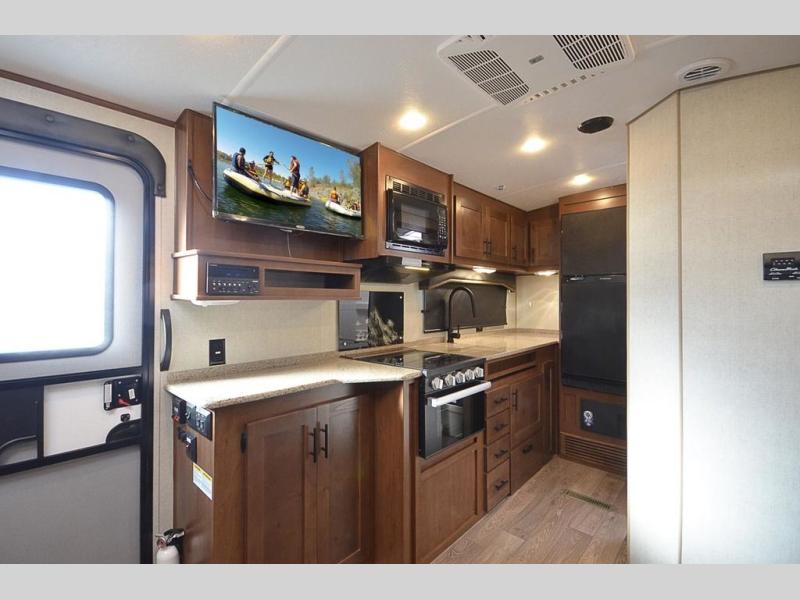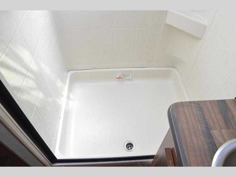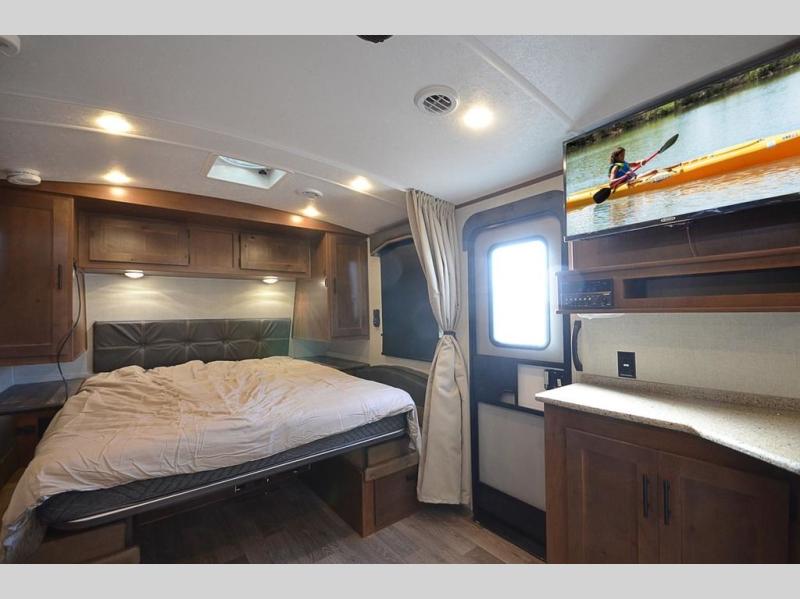Versatility and comfort is found in this spacious travel trailer. There is a queen Murphy bed up front that can fold away into the wall so you can dine at the fold down booth dinette. The residential sofa with built-in recliners will be the perfect place to relax as you watch a movie on the swing out 32" TV, and the single slide out here will provide more interior space. This model includes a rear corner kitchen with plenty of counter space to prep meals and the full bath is in the other rear corner for privacy. You'll also enjoy the shower skylight for more head room, plus a living area skylight for more natural light.