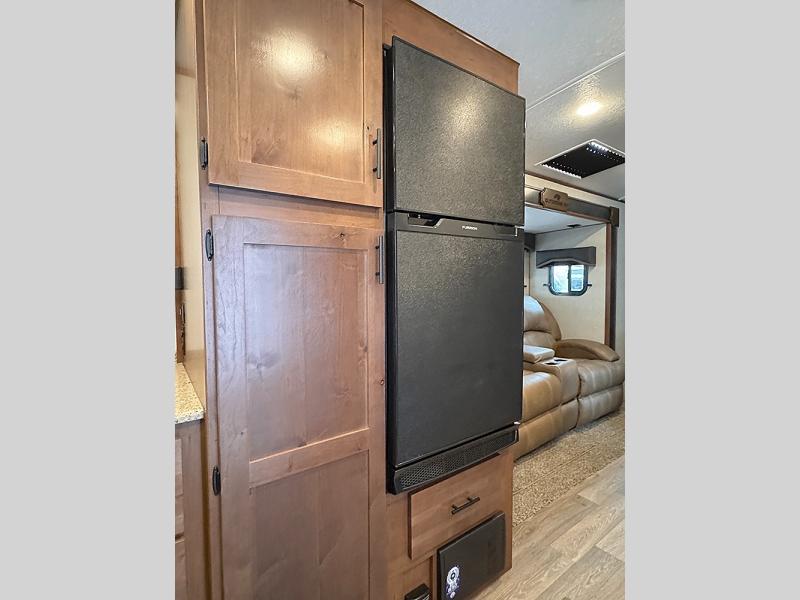 You're going to love this rear kitchen travel trailer with abundant counter space for cooking at-home meals, and the entry door is now here for convenience. The 40" x 90" fold down table dinette provides a place to dine or play games, and there is a swing-out 32" TV across from the residential sofa with built-in recliners slide for movie nights. A full bath on board lets you stay clean throughout your camping trips, and there is a bath skylight for natural lighting here as well. The front area includes a 60" x 80" queen wall bed that can be pulled down when you're ready for a good night's rest!