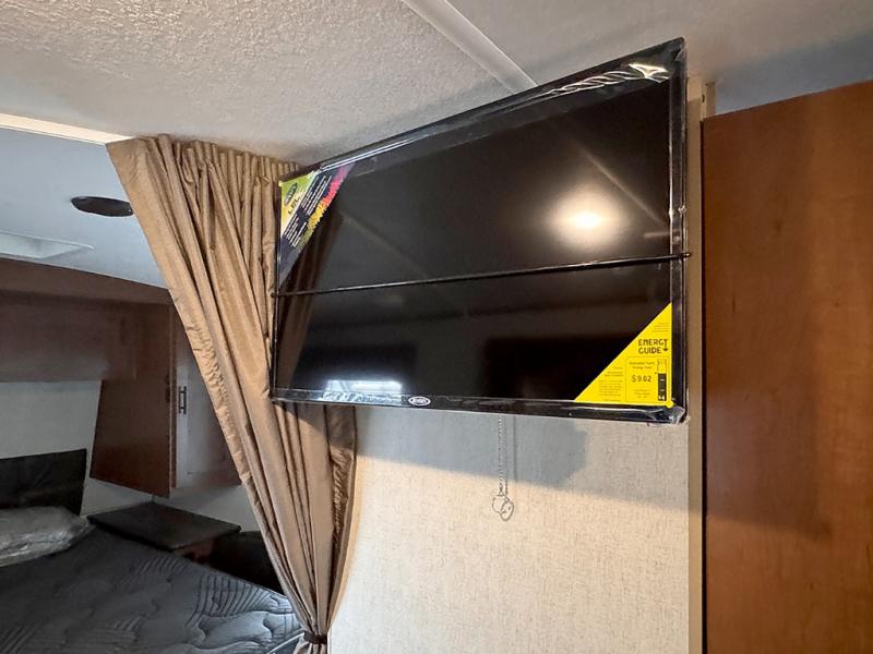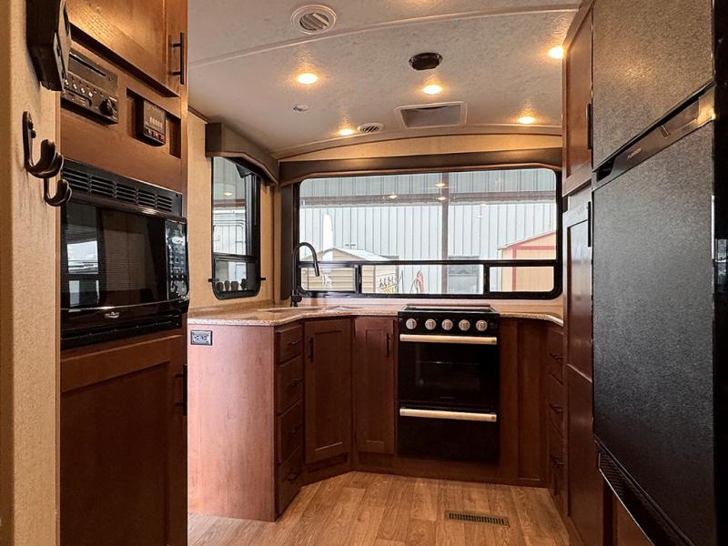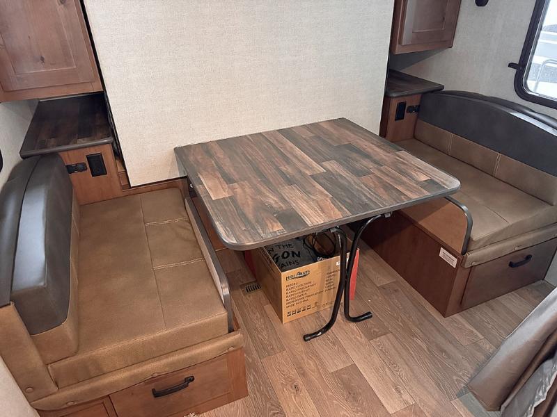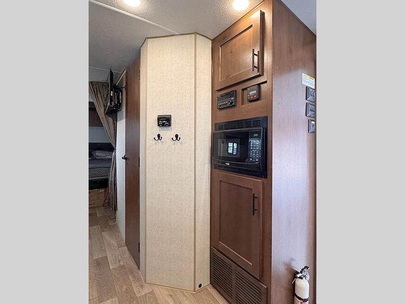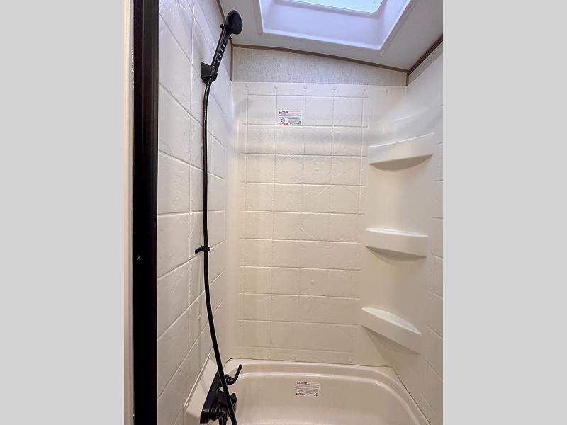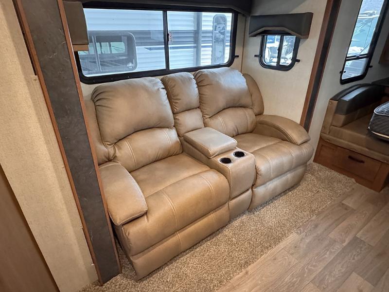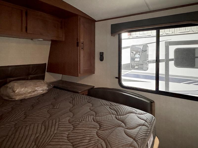 You're going to love this rear kitchen travel trailer with abundant counter space for cooking at-home meals, and the entry door is now here for convenience. The 40" x 90" fold down table dinette provides a place to dine or play games, and there is a swing-out 32" TV across from the residential sofa with built-in recliners slide for movie nights. A full bath on board lets you stay clean throughout your camping trips, and there is a bath skylight for natural lighting here as well. The front area includes a 60" x 80" queen wall bed that can be pulled down when you're ready for a good night's rest!