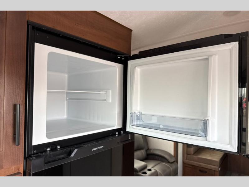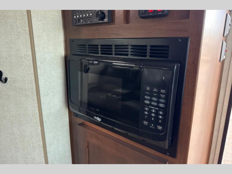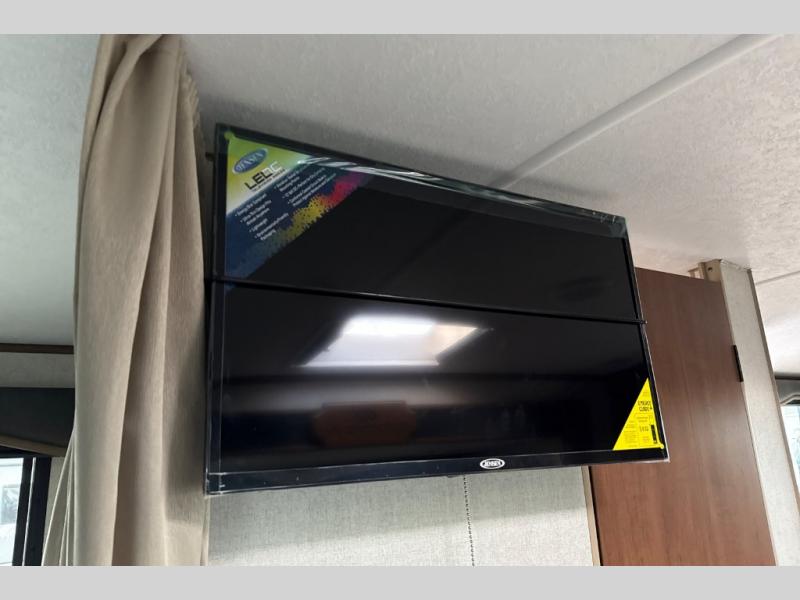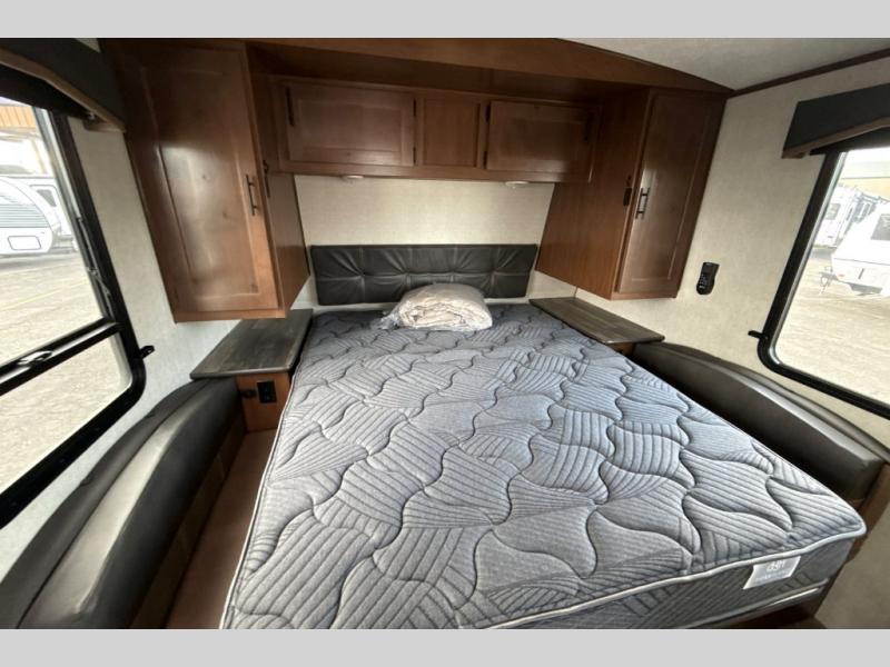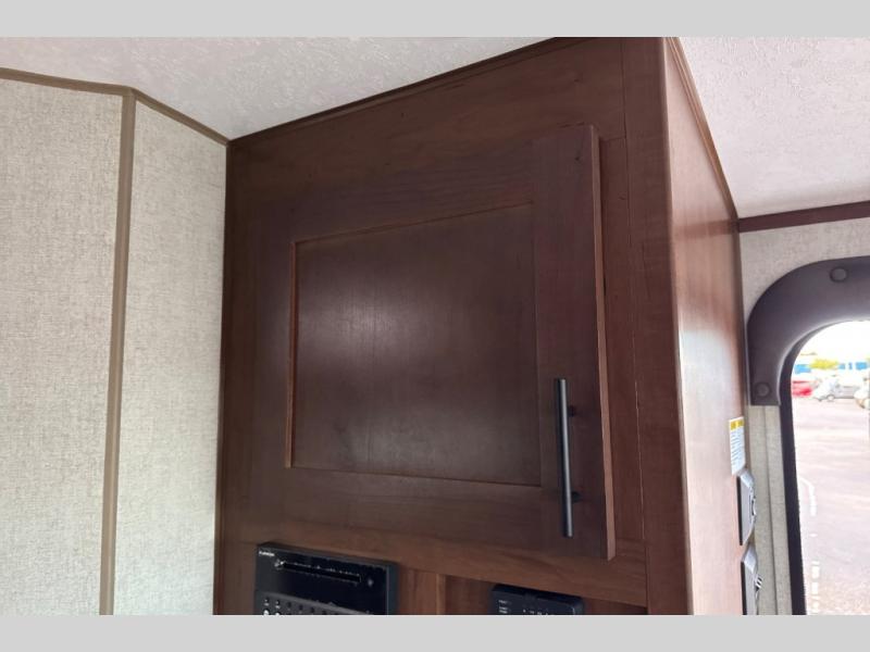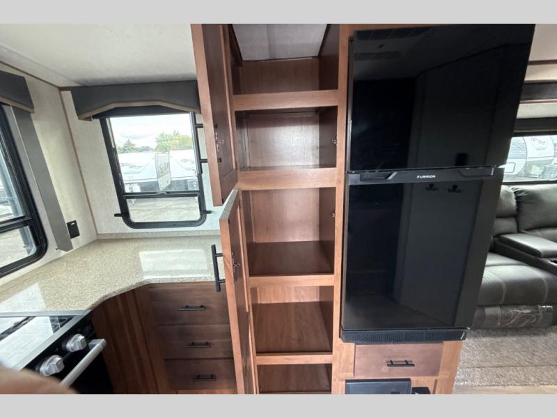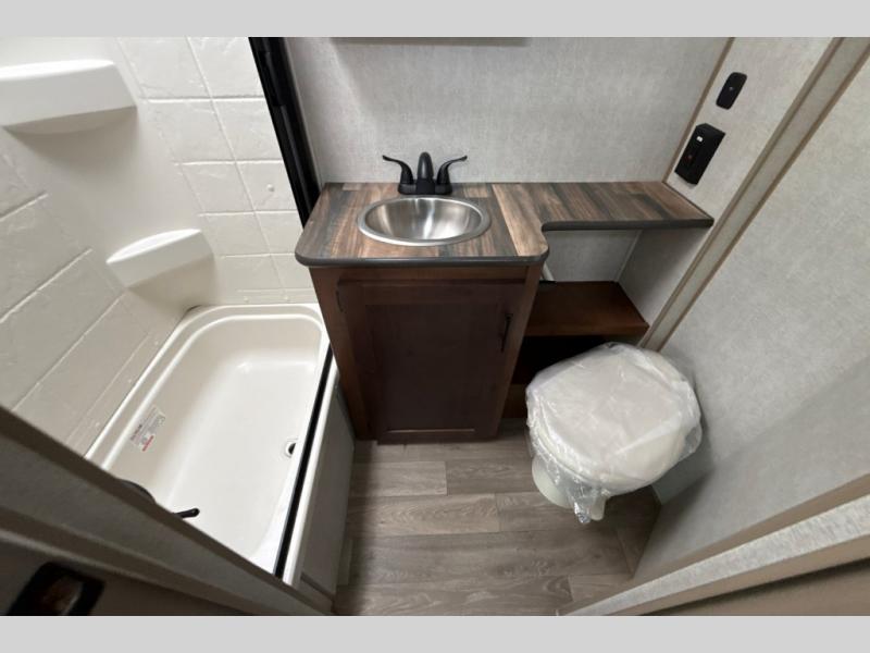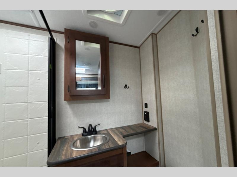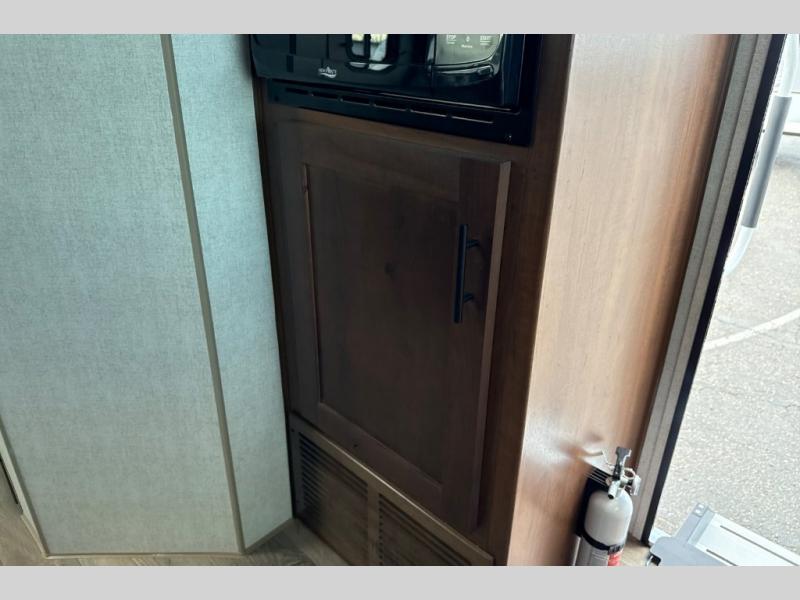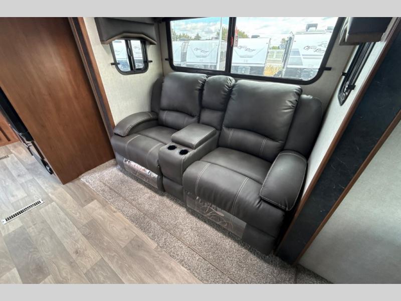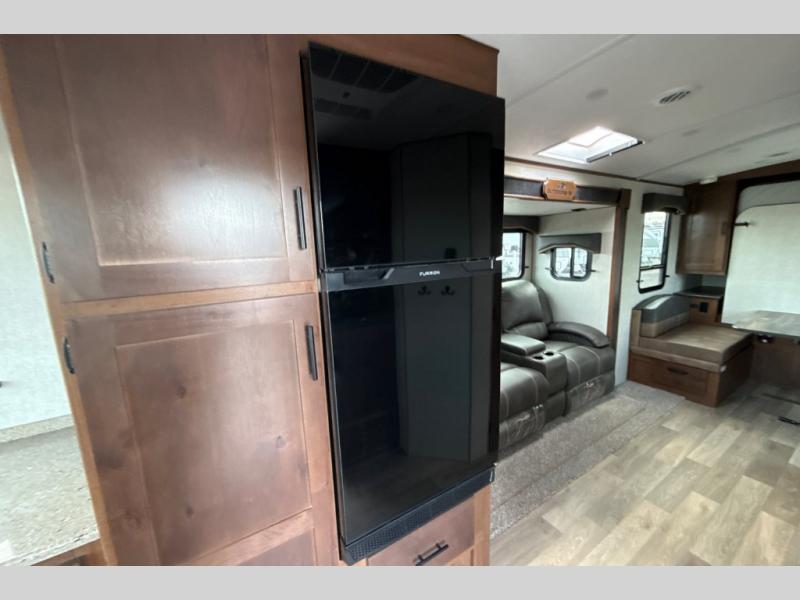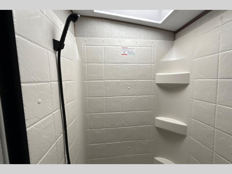You're going to love this rear kitchen travel trailer with abundant counter space for cooking at-home meals, and the entry door is now here for convenience. The 40" x 90" fold down table dinette provides a place to dine or play games, and there is a swing-out 32" TV across from the residential sofa with built-in recliners slide for movie nights. A full bath on board lets you stay clean throughout your camping trips, and there is a bath skylight for natural lighting here as well. The front area includes a 60" x 80" queen wall bed that can be pulled down when you're ready for a good night's rest!