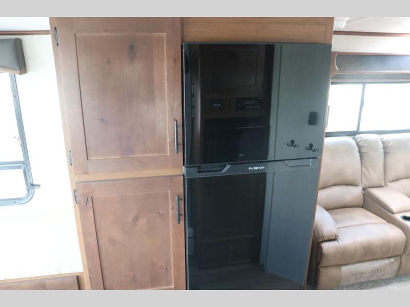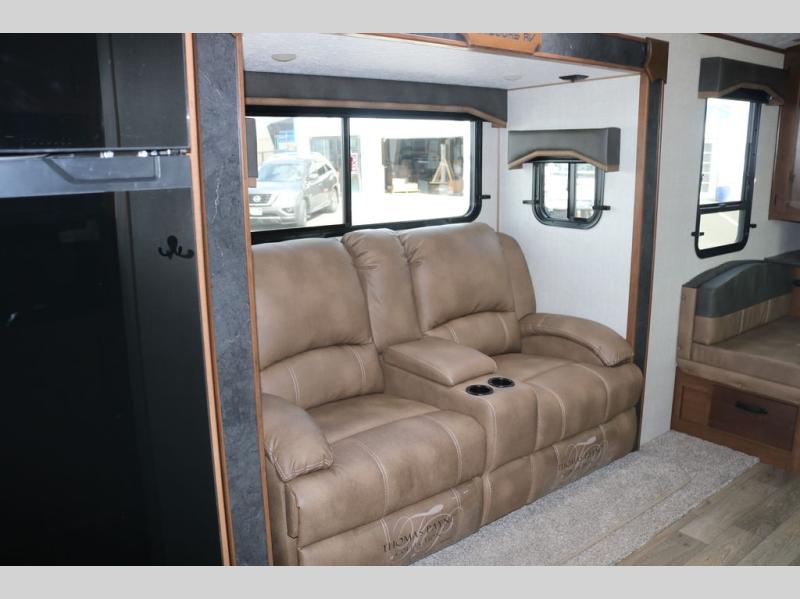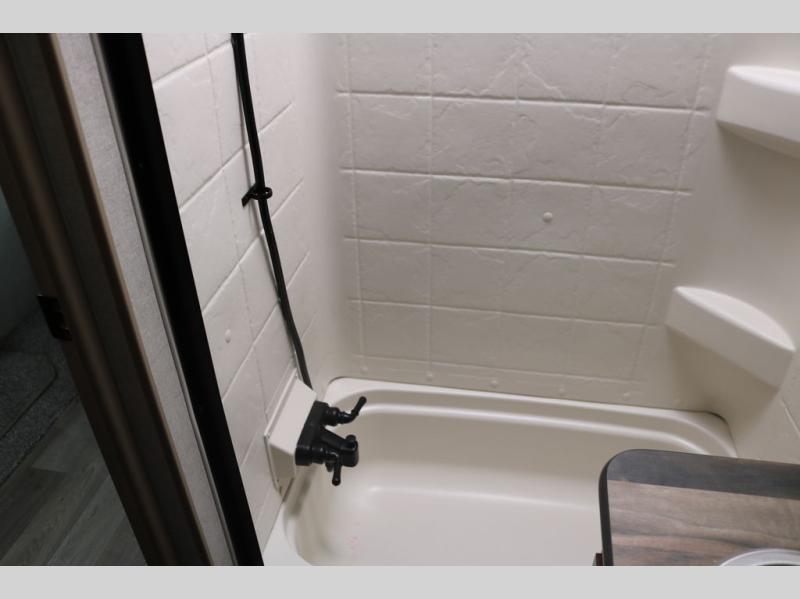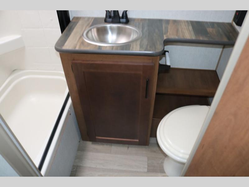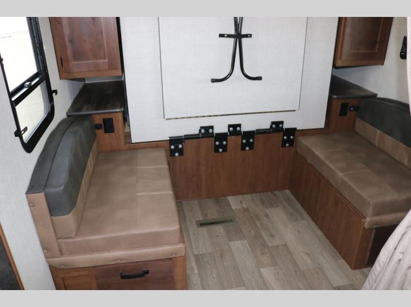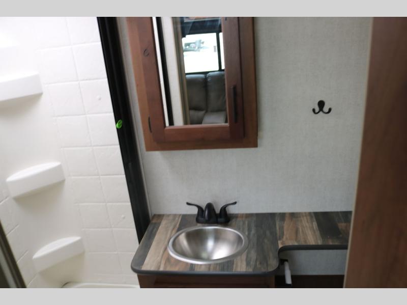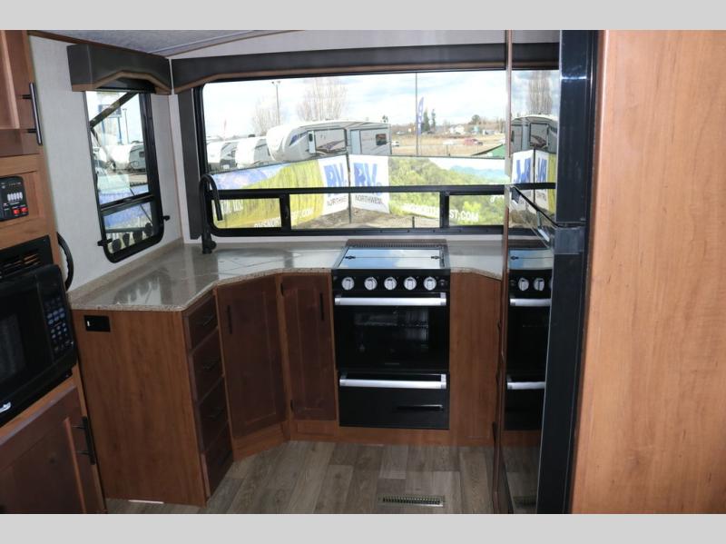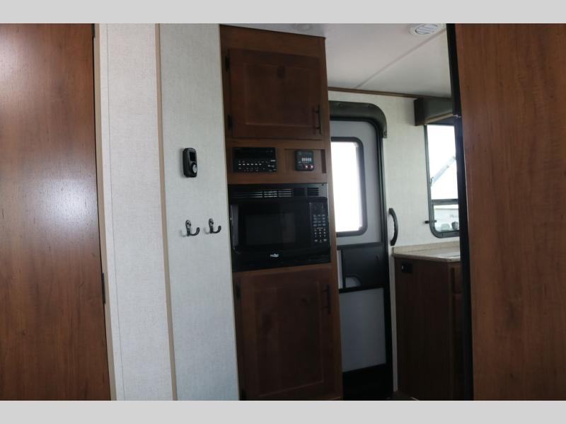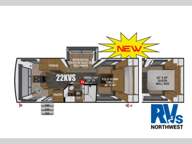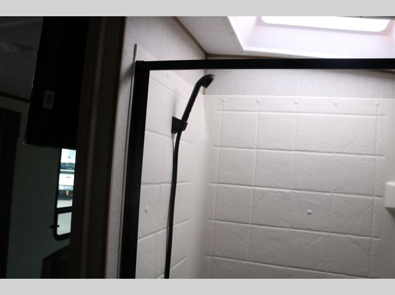 You're going to love this rear kitchen travel trailer with abundant counter space for cooking at-home meals, and the entry door is now here for convenience. The 40" x 90" fold down table dinette provides a place to dine or play games, and there is a swing-out 32" TV across from the residential sofa with built-in recliners slide for movie nights. A full bath on board lets you stay clean throughout your camping trips, and there is a bath skylight for natural lighting here as well. The front area includes a 60" x 80" queen wall bed that can be pulled down when you're ready for a good night's rest!