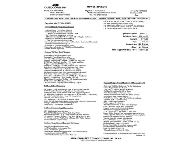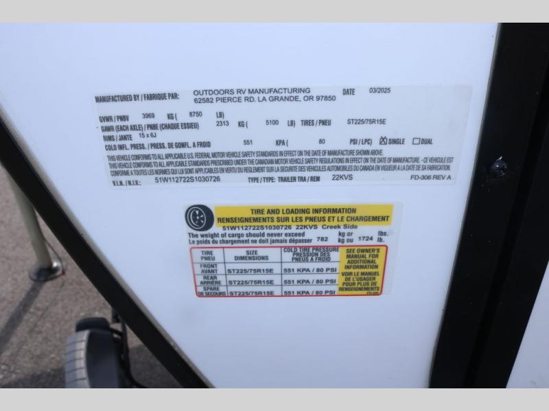 New 2025 Outdoors RV Creek Side Mountain Series 22KVS Travel Trailer
