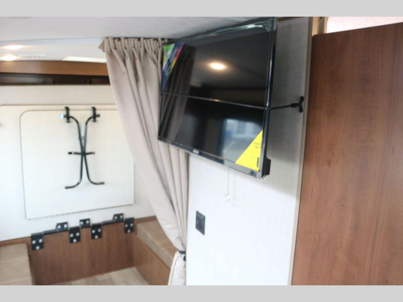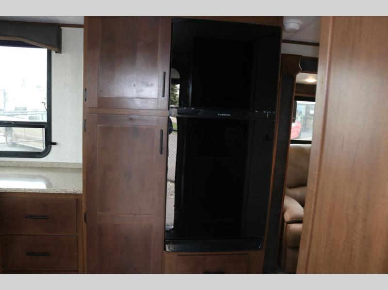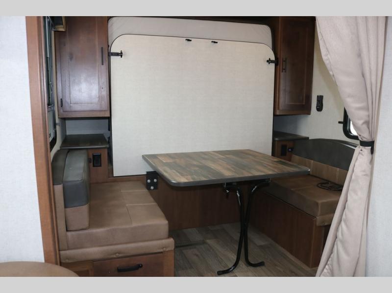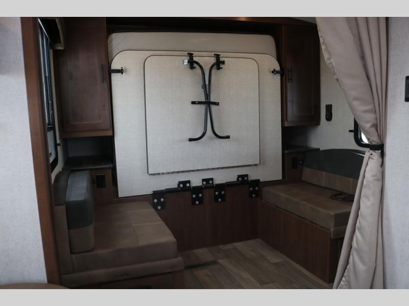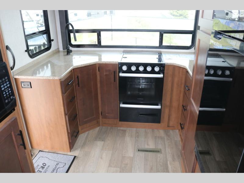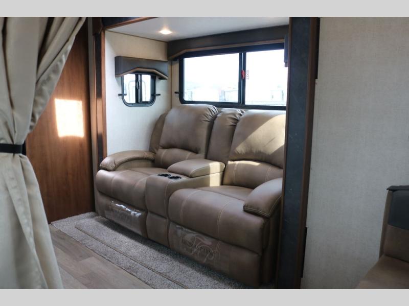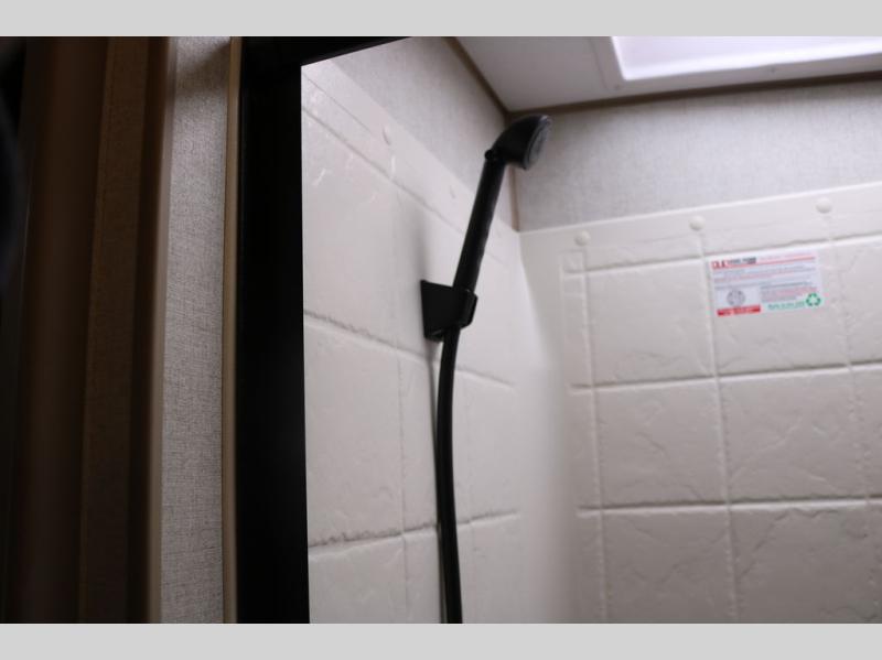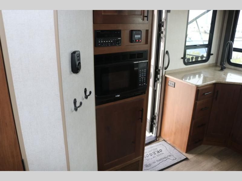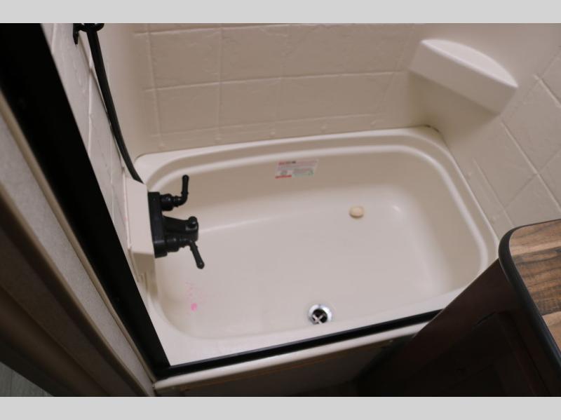 You're going to love this rear kitchen travel trailer with abundant counter space for cooking at-home meals, and the entry door is now here for convenience. The 40" x 90" fold down table dinette provides a place to dine or play games, and there is a swing-out 32" TV across from the residential sofa with built-in recliners slide for movie nights. A full bath on board lets you stay clean throughout your camping trips, and there is a bath skylight for natural lighting here as well. The front area includes a 60" x 80" queen wall bed that can be pulled down when you're ready for a good night's rest!