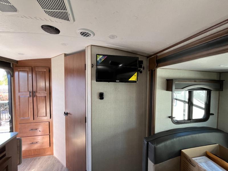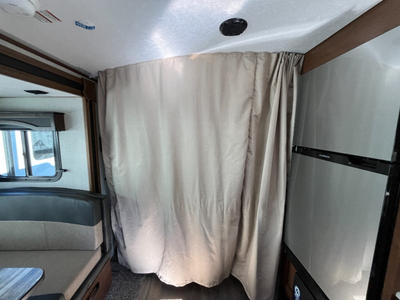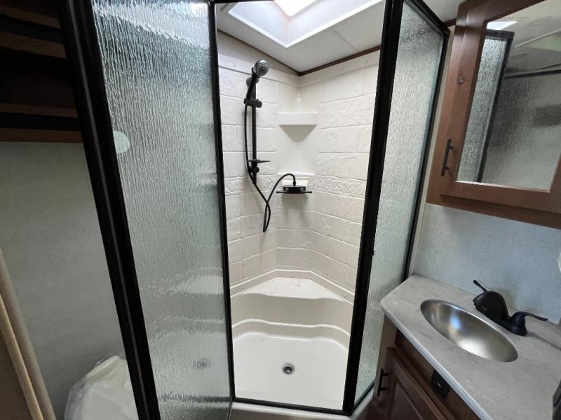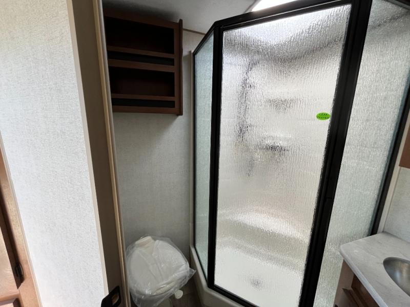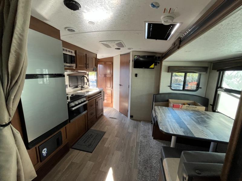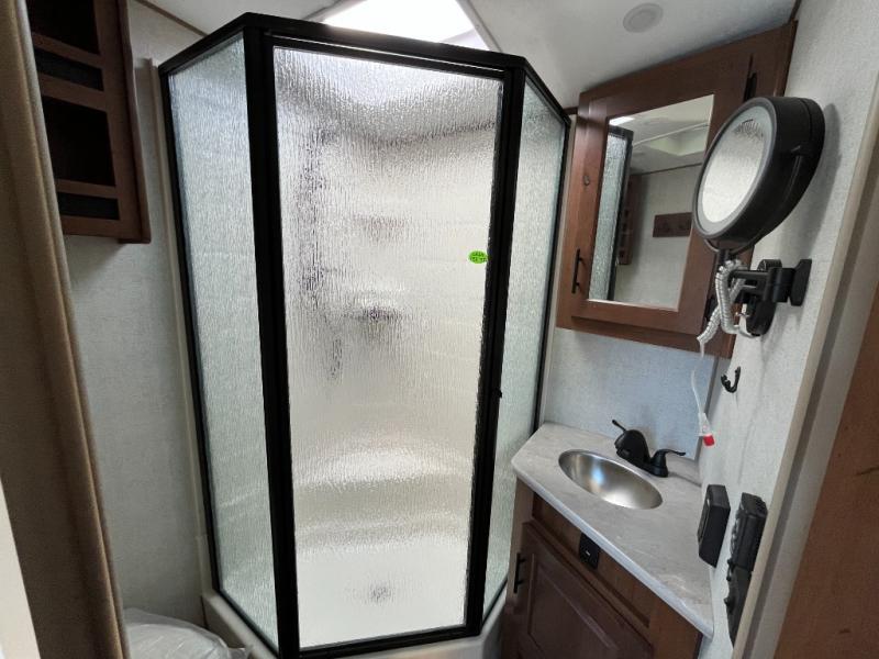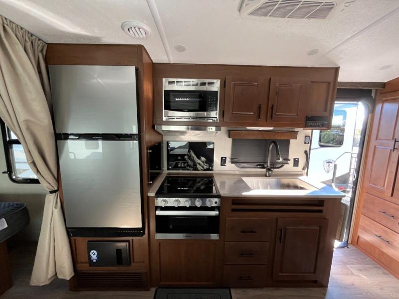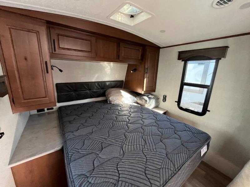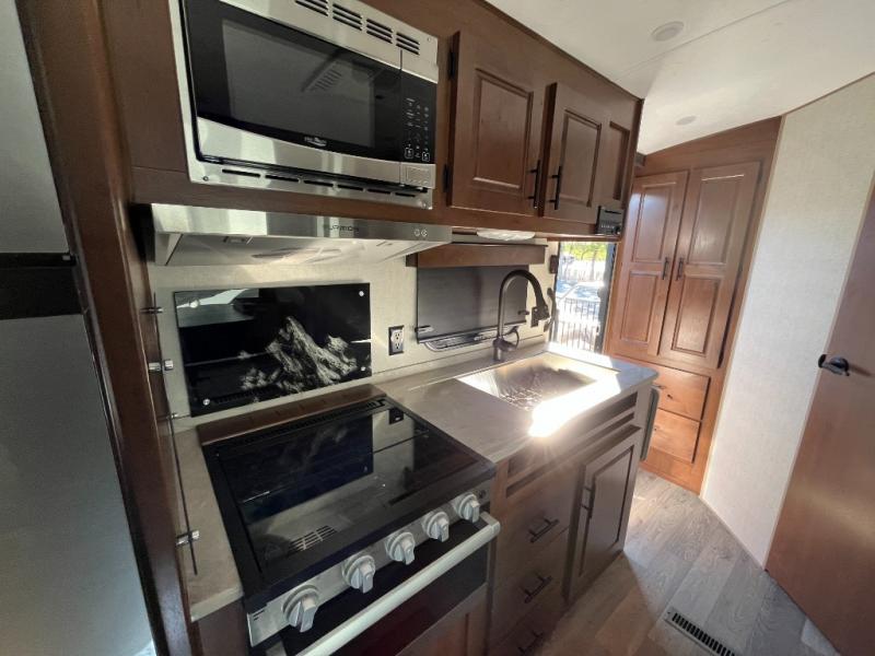 Camping in the mountains has never been more relaxing than in this single slide out travel trailer. You will have a full bath to clean up in each morning, and a three burner cooktop in the kitchen to prepare breakfast. The mountain dinette slide will be perfect for dining together, and if you have any overnight guests, they can sleep here. You will have the queen bed all to yourselves up front with dual bedroom wardrobes to keep your clothes tidy. This model also includes a 17' awning so you can visit outdoors protected from the elements.